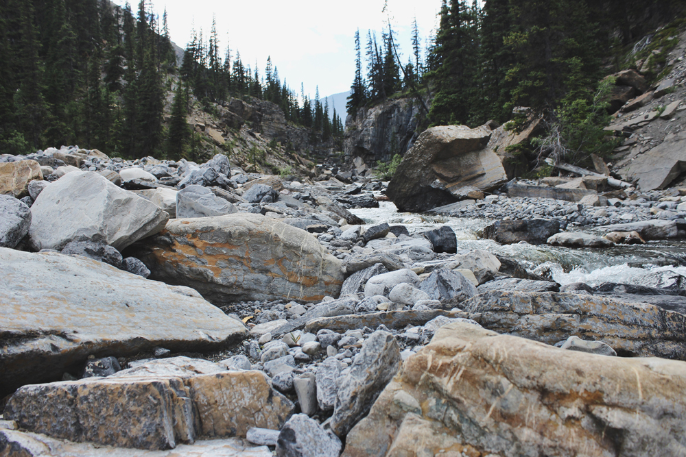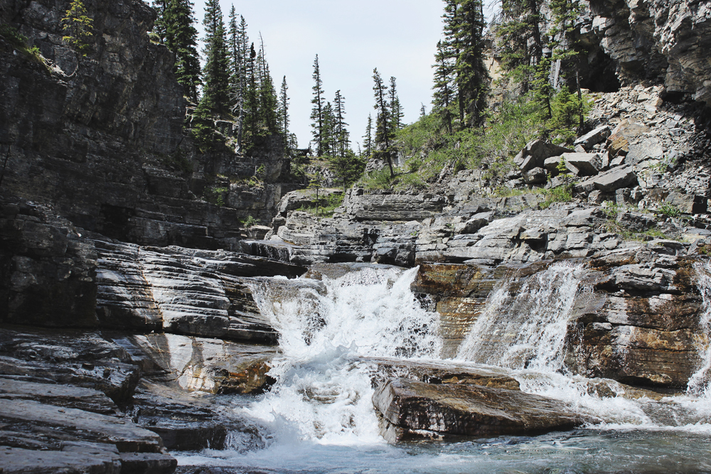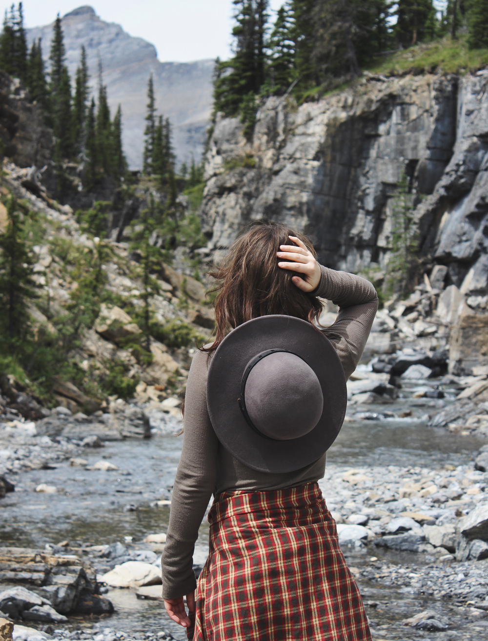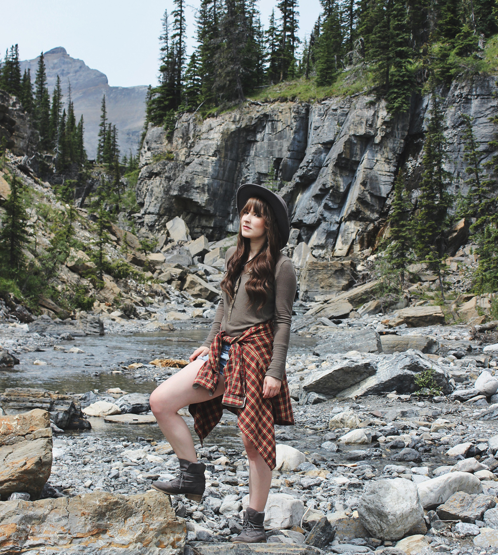 This is the second look from last weekends camping trip out in Waiparous. These photos were taken near the waterfall that we camped by. It’s really gorgeous out there and I want to go back asap! Full disclosure, I did both outfit shots the same day. My hair did not look like this after a night of camping, I certainly wish it did! My camping style really isn’t very different from my every style, I just wore more appropriate footwear. This oversized plaid shirt came in really handy when the temperature cooled down at night. On a side note, I don’t wear this hat very often but it was awesome to wear while camping. The string sort of makes me feel a bit like a girl scout but it really comes in really handy when the wind starts to pick up. It’s always nice when you don’t have to worry about losing your hat.
