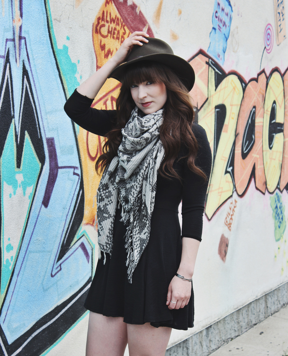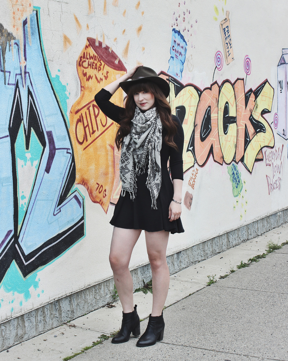 I haven’t been doing very many outfit shoots in the city lately, so I figured I’d mix things up a little and do one. The bright graffiti on this wall has always caught my attention, most likely because of the fact that chips and snacks are some of my favourite things haha. It’s also really close to one of my favourite brunch spots in Calgary, OEB. I wanted something that would stand out against the darker tones of this look and this wall does a perfect job of that.