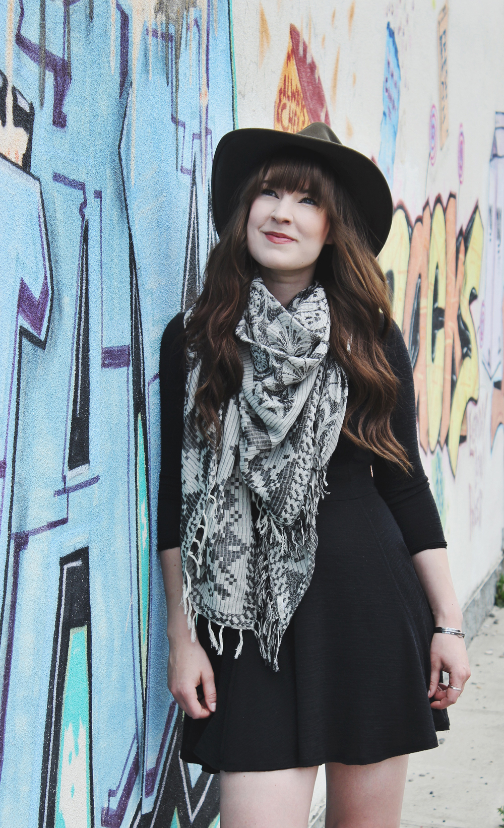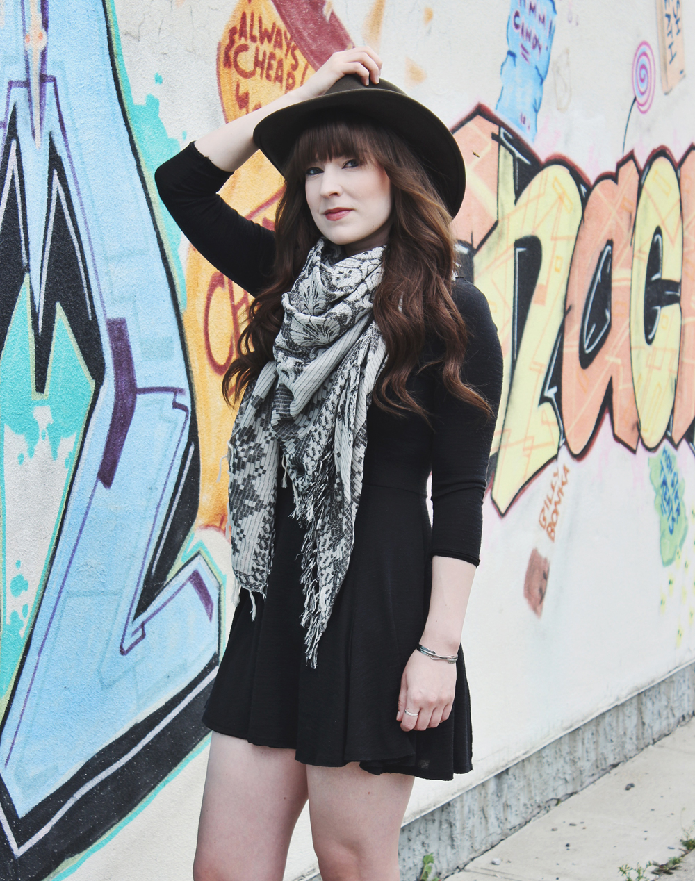 Outfit Details: Scarf: Ecote / Dress: BDG / Boots: Steve Madden / Hat: Scala