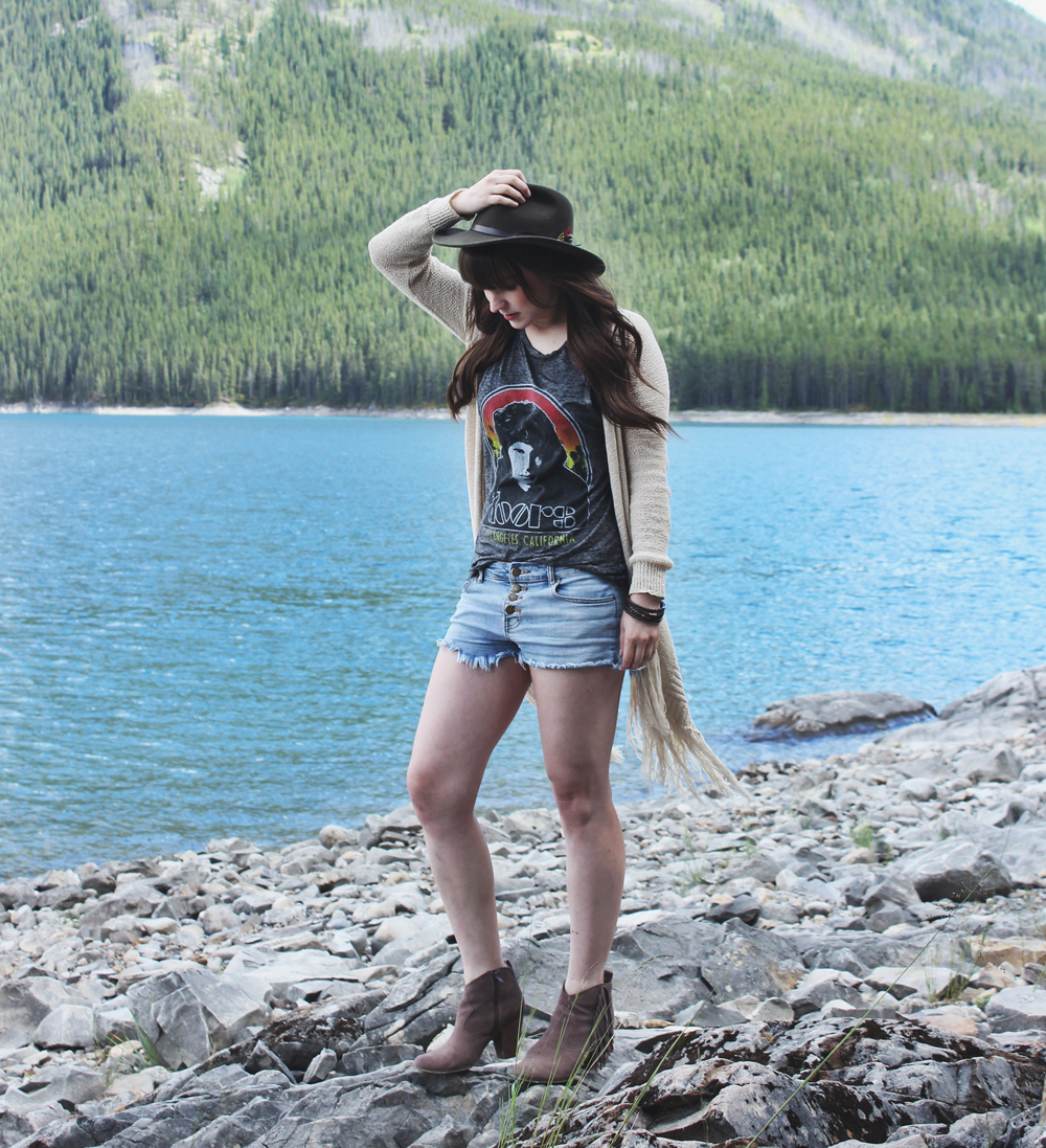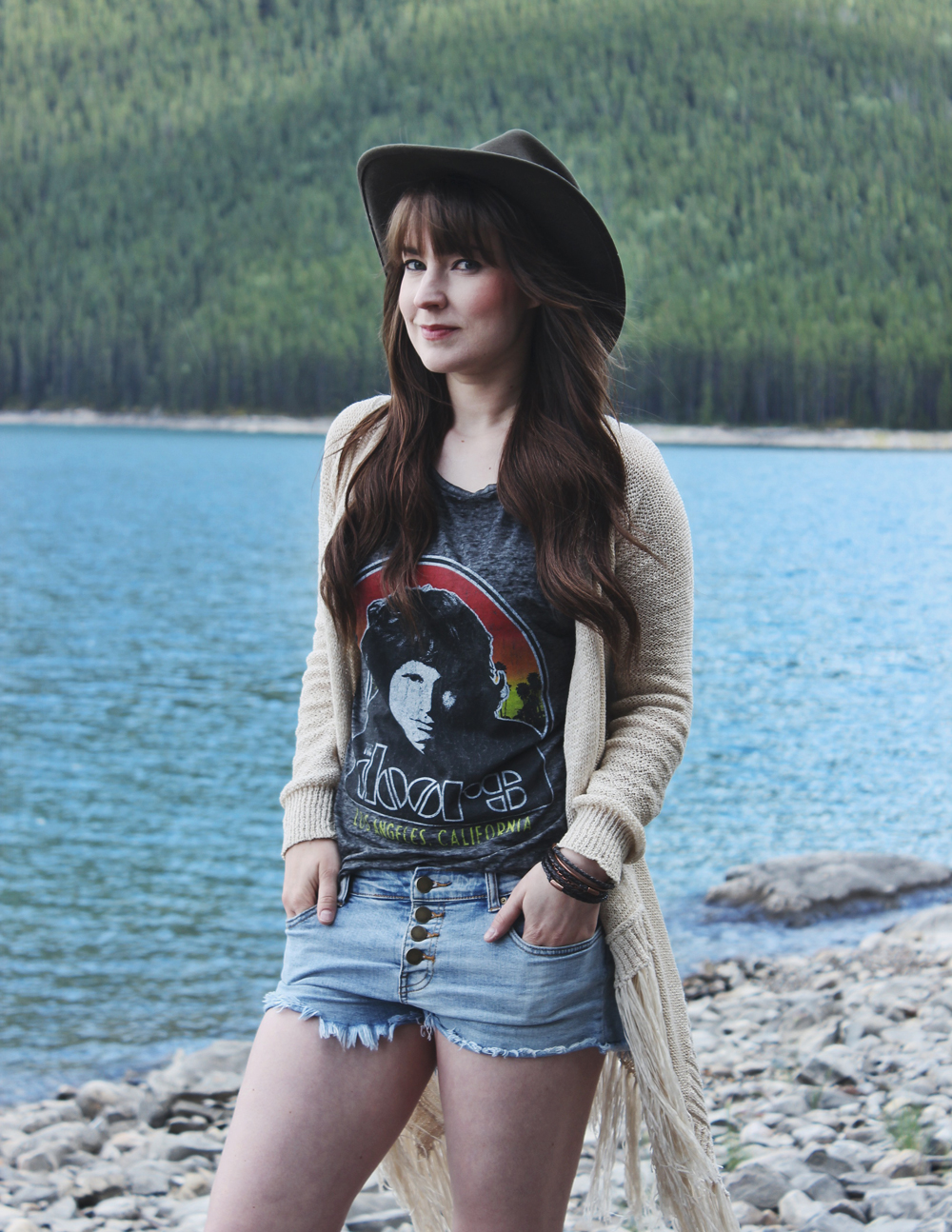 Two of my all time favourite items of clothing include band shirts and cardigans. My closet is overflowing with a wide variety of both of these. This cardigan by Lovestitch is one of my all time favourites, I love the fringe on the bottom and it has a really flattering fit. I think I have a serious addiction to off-white cardigans, my closet is full of them! For the rest of the look I chose this awesome tank top. It’s one of my new favourites, I love The Doors and Jim Morrison so it was an easy choice.
