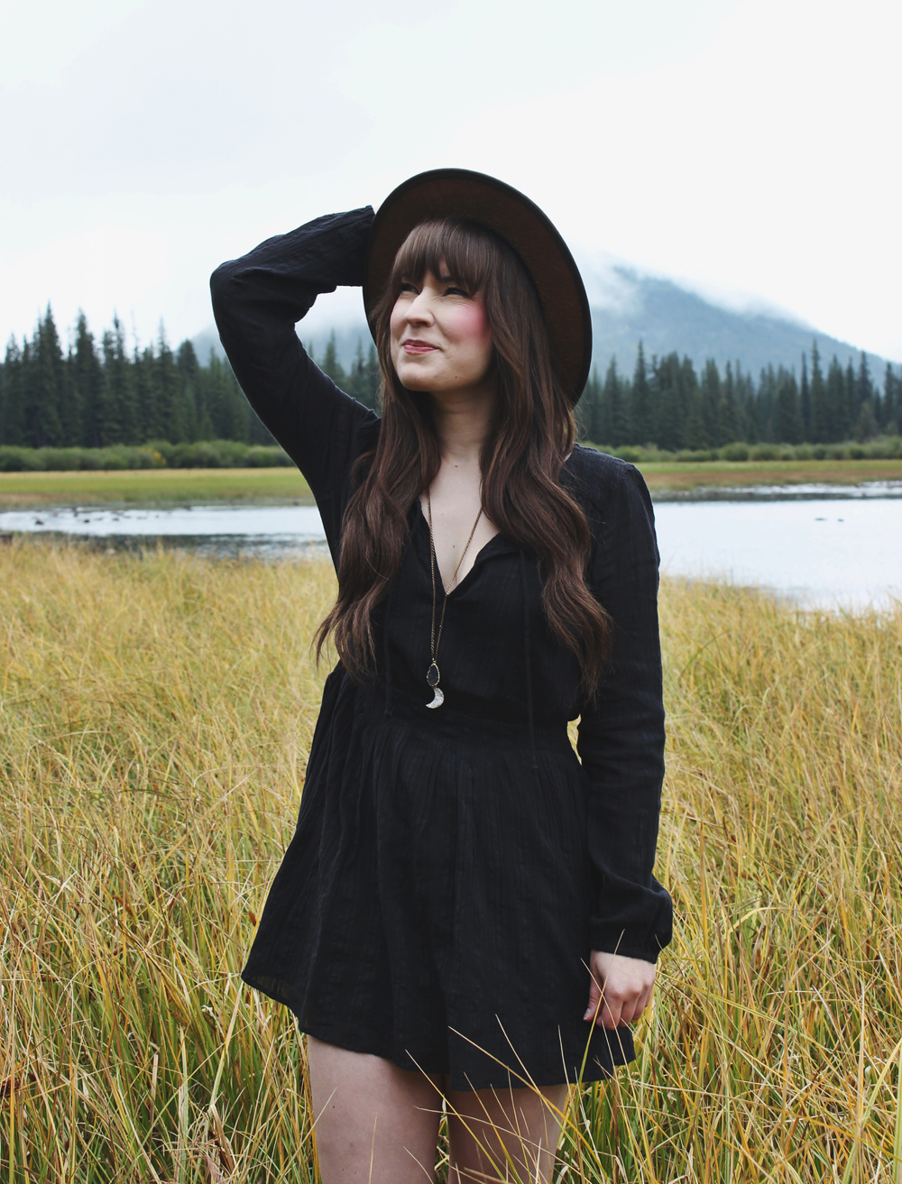 Right now I’m taking advantage of all the days that I have left to wear a dress without tights underneath. Those days are numbered so I’m doing my best. This adorable dress by Volcom is one of my current favourites. I love that it has long sleeves and the fit is perfect for my body type! These photos were taken out at Vermillion lakes in Banff national park. The colours this time of year are so beautiful, I wish that autumn lasted longer than it does.
