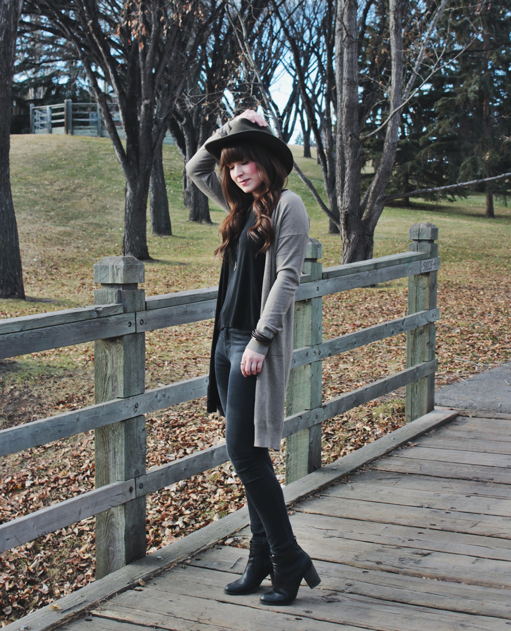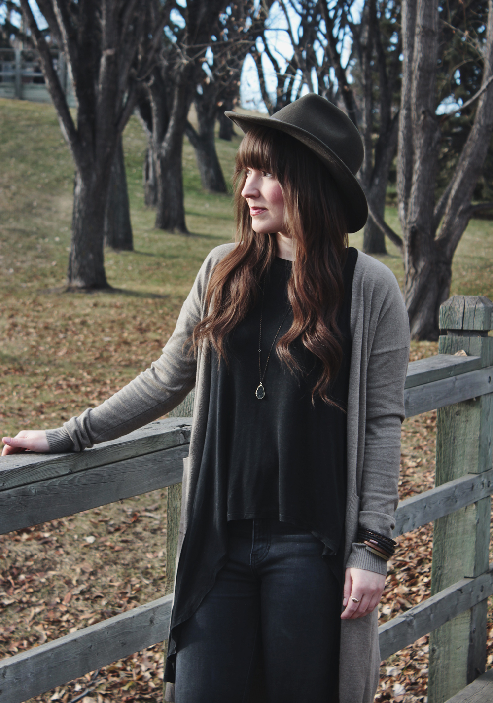 I have a major obsession with cardigans, and i’m constantly adding to my collection. Most of what I already have consists of chunkier knits, so it’s nice to have some variety with textures. This recent addition fits in very nicely. I love the length, and the neutral tone. For the rest of the look I kept it really simple with a long black tank top, and a pair of black skinny jeans.