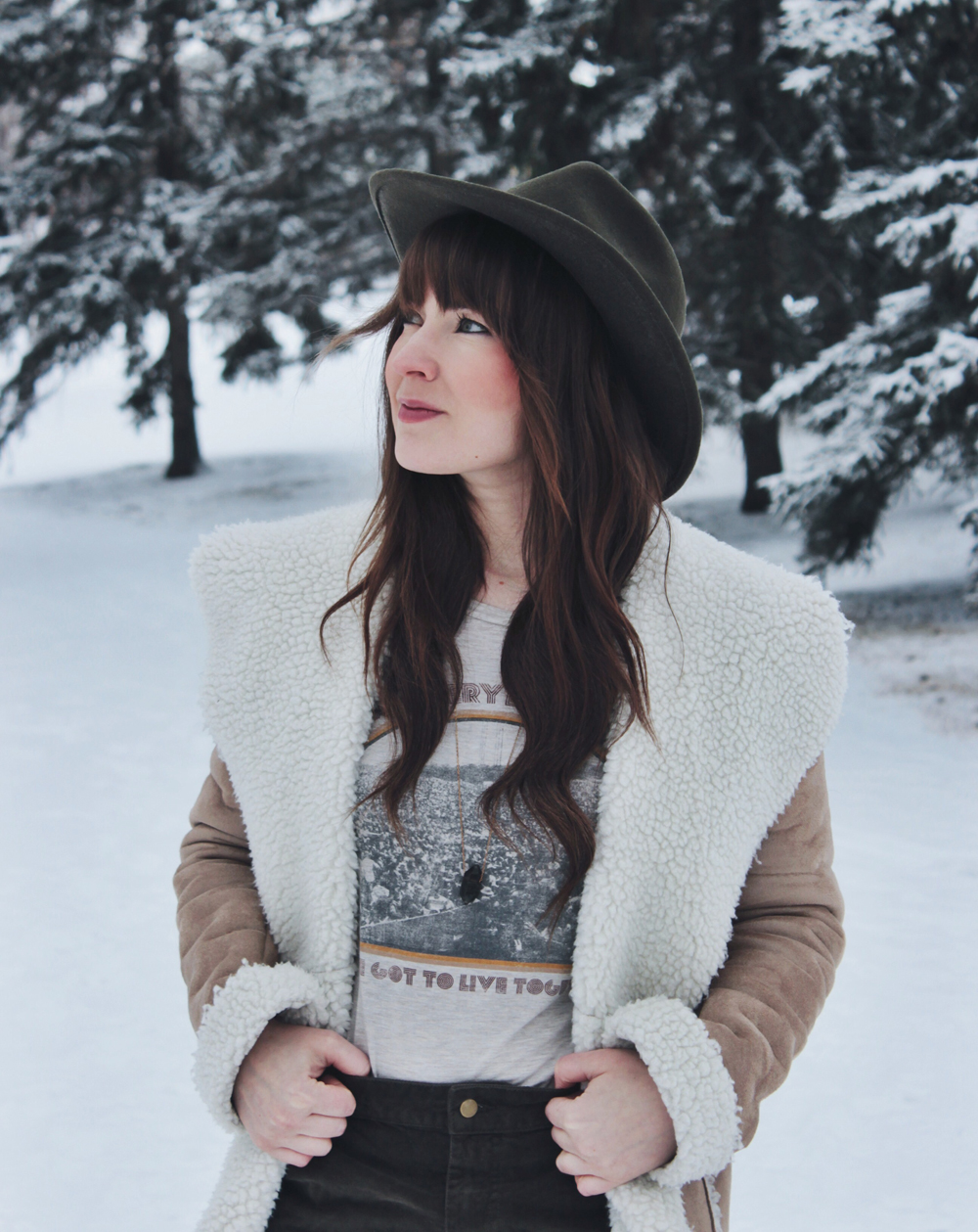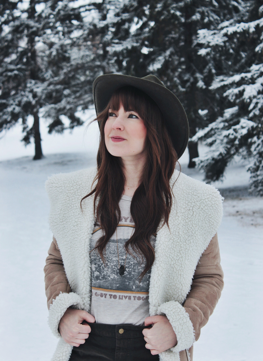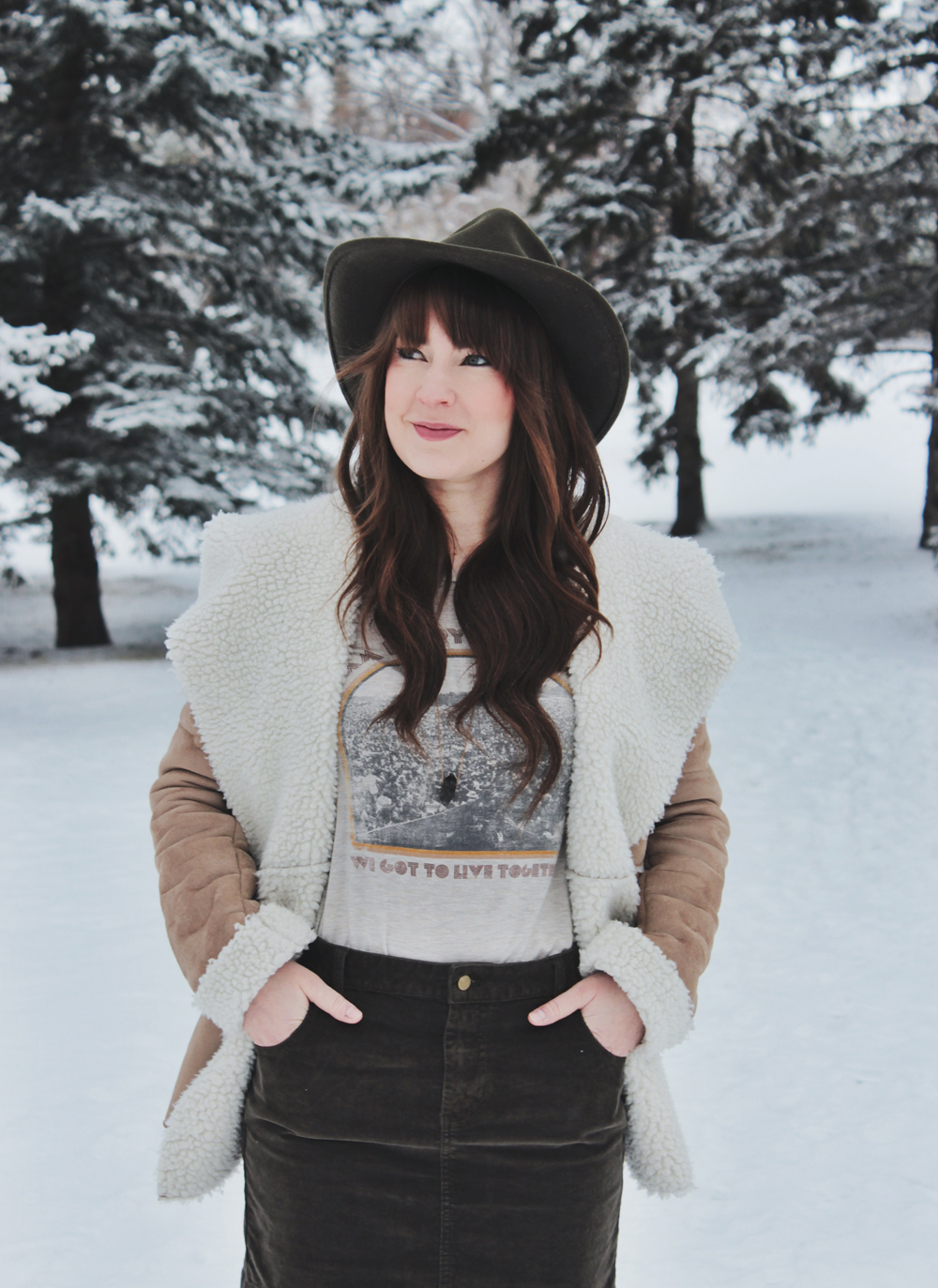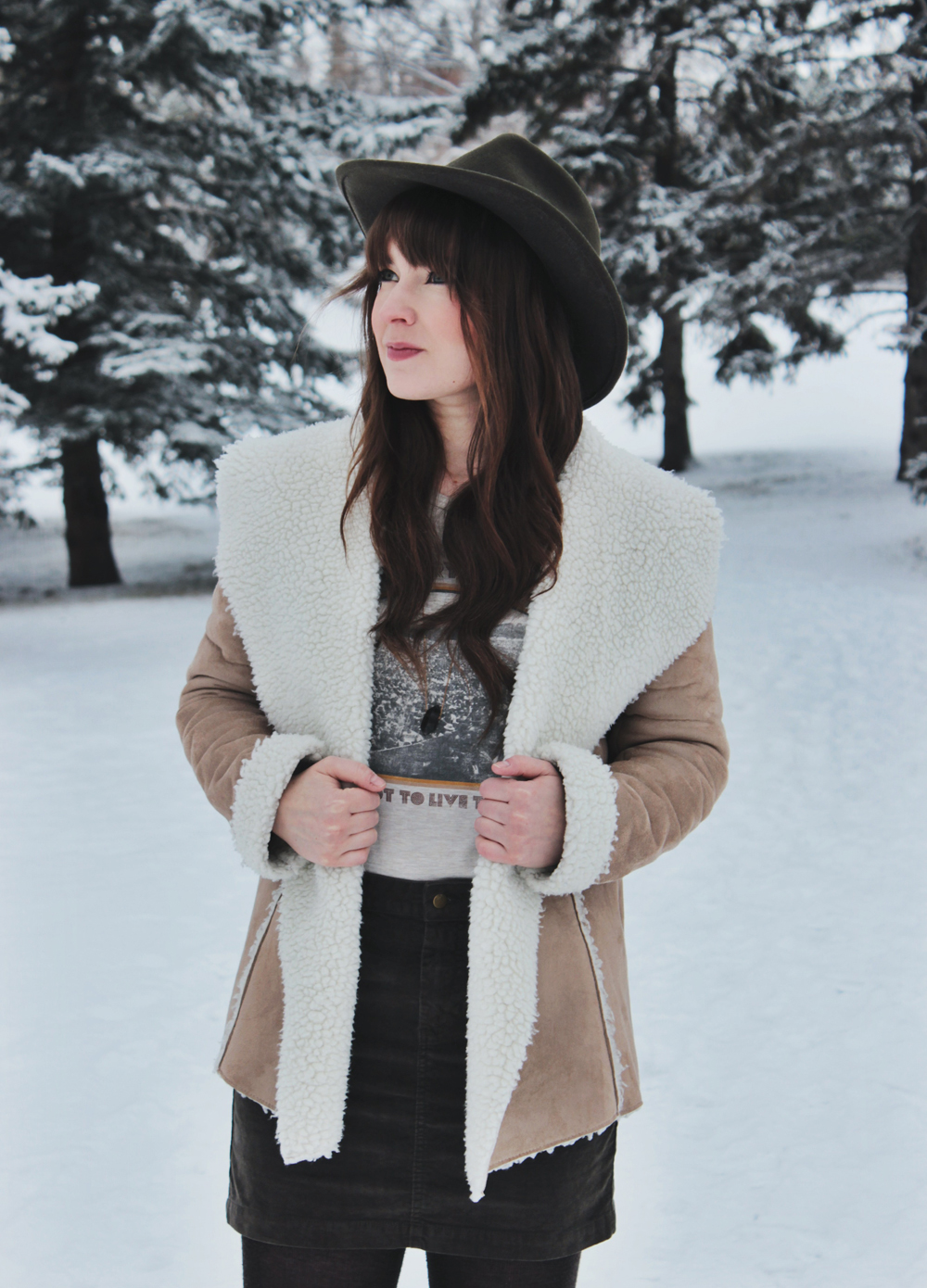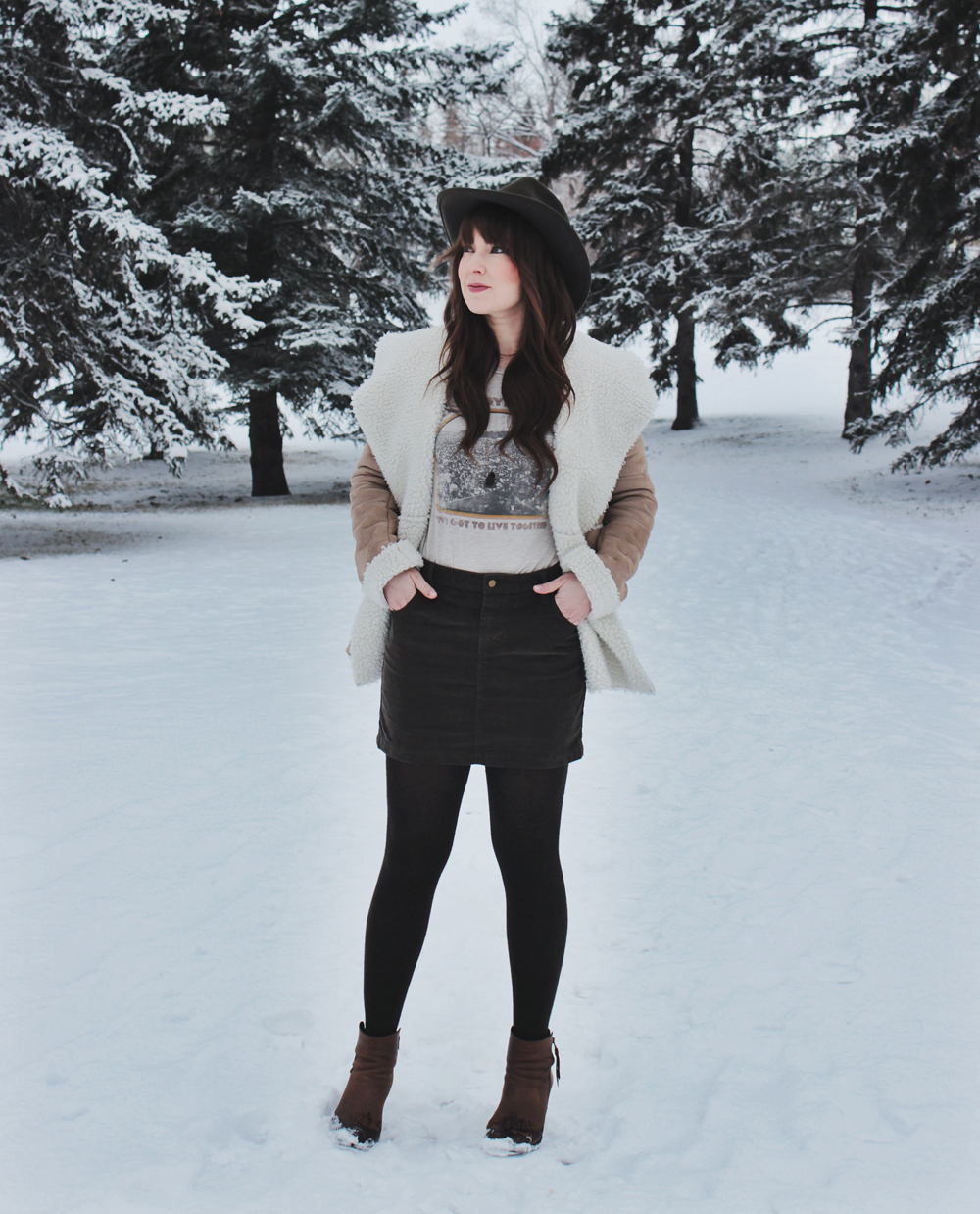 Winter also requires that I make a few adjustments to my wardrobe here and there. Things such as tights under a dress or a skirt become a bit of a necessity. It also goes without saying that you need a warm winter coat. This Shearling coat is something that I purchased last year, and I wasn’t really sure how much use I was going to get out of it. Recently I’ve been finding a lot of different outfits that it compliments really well. Pairing it with this corduroy skirt and band tee, is currently one of my favourite combinations! It’s always a pleasant surprise to find something that fits in so well with the rest of your wardrobe!