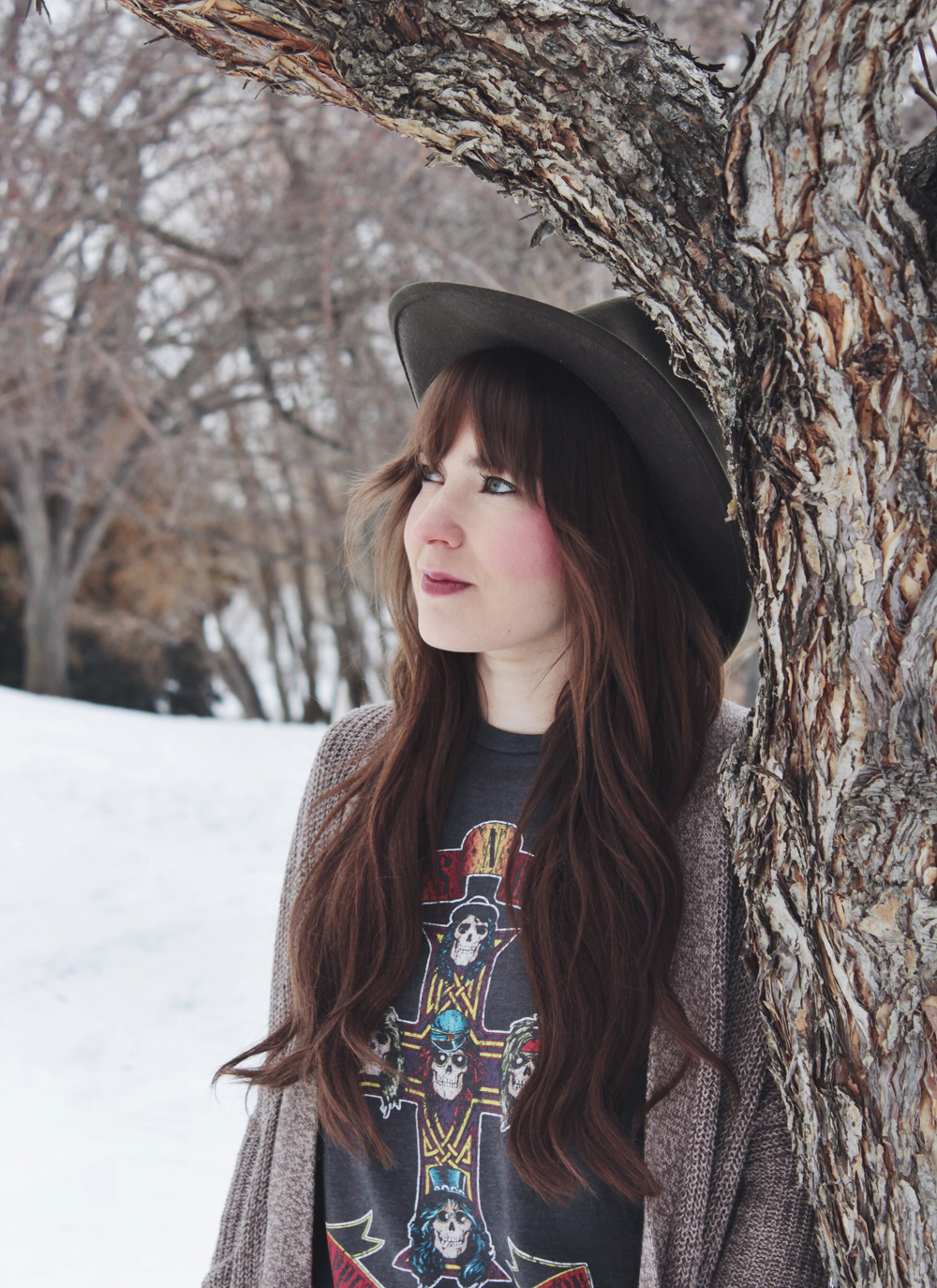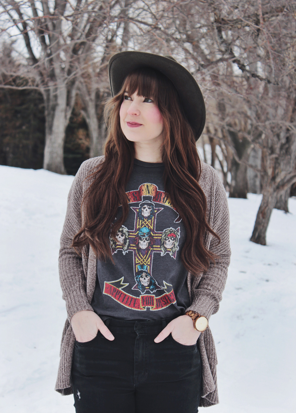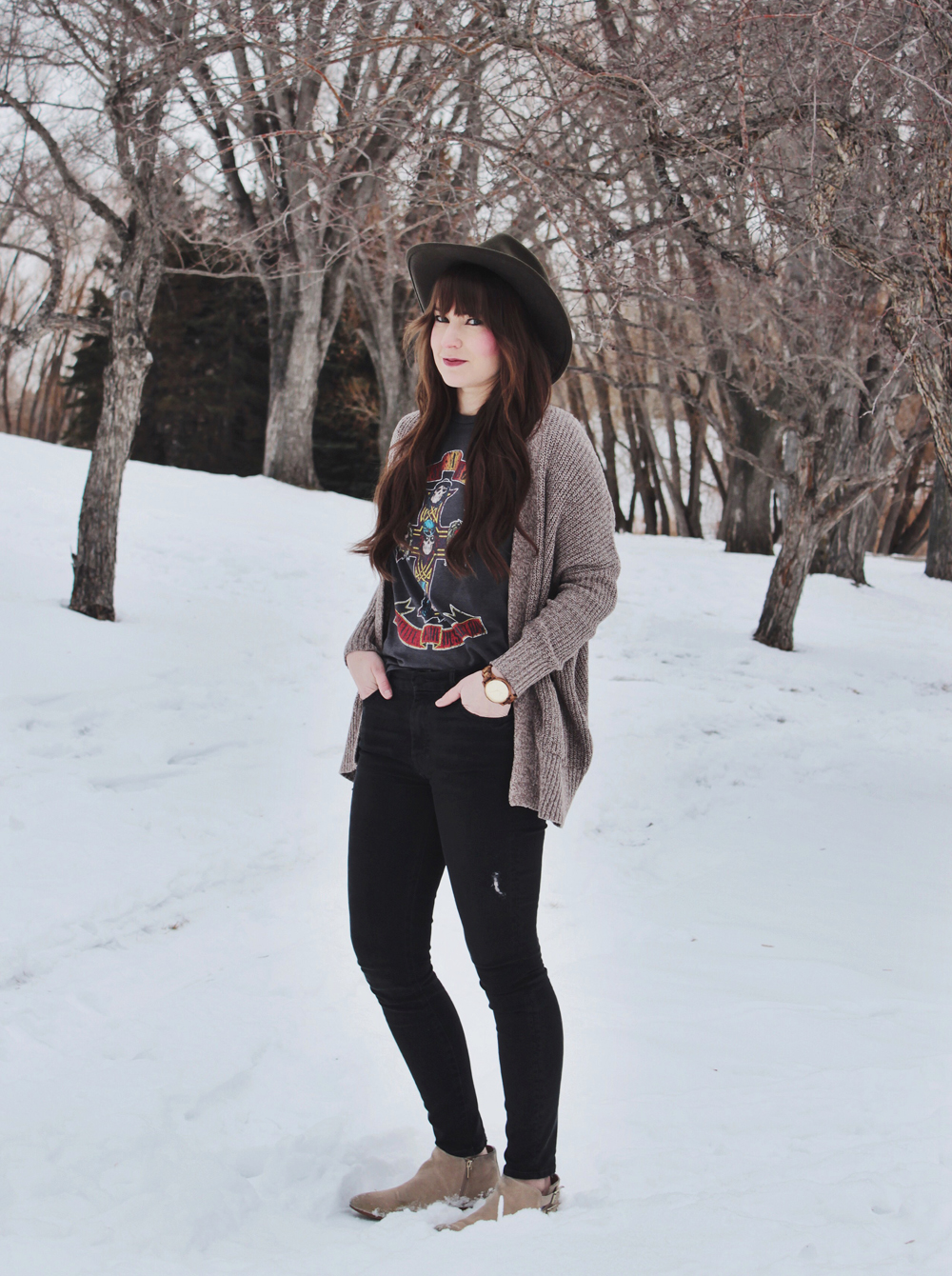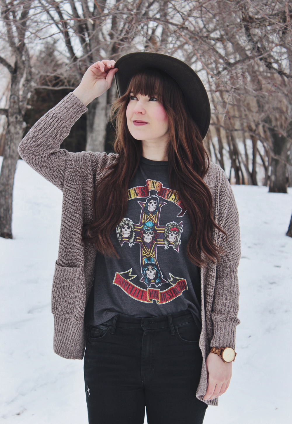 This look is one of my favourites all year round. Obviously on cold winter days I would have a jacket to go along with it. I think you might get bored of seeing me wear the same few jackets over and over. This look has everything that I love from band tee’s and cardigans to ankle boots. When you find a combination that you love, it’s nice to stick with it for a while!