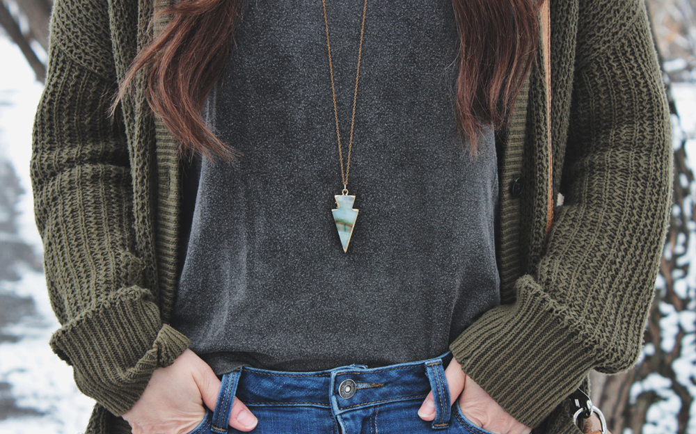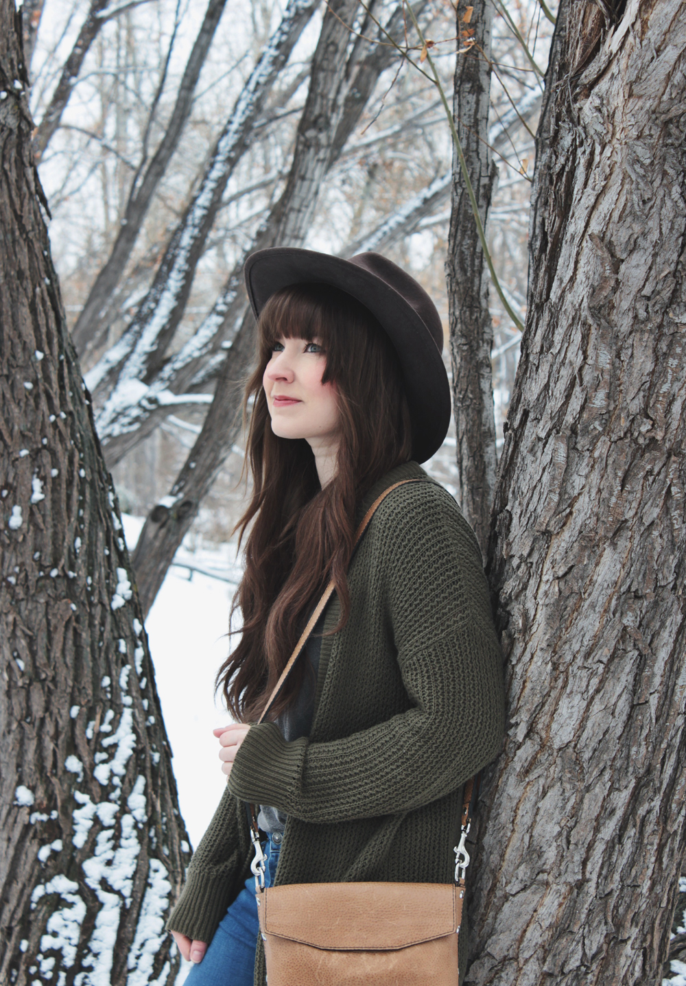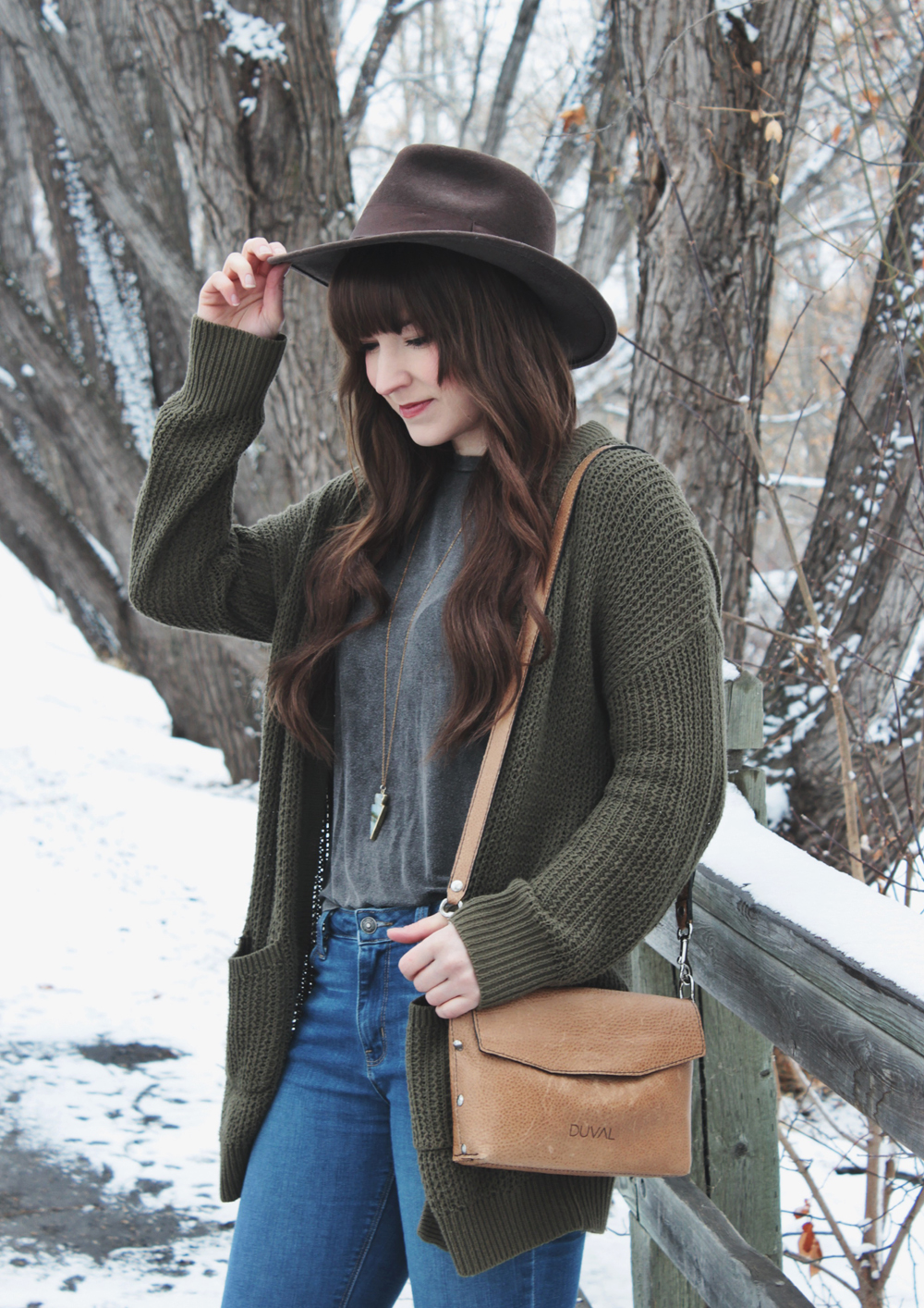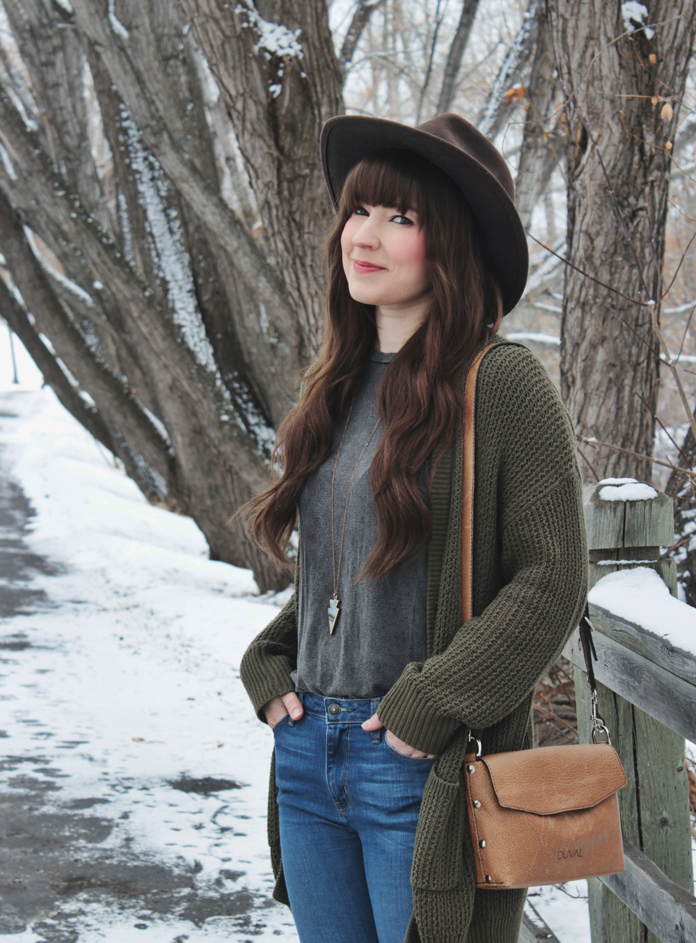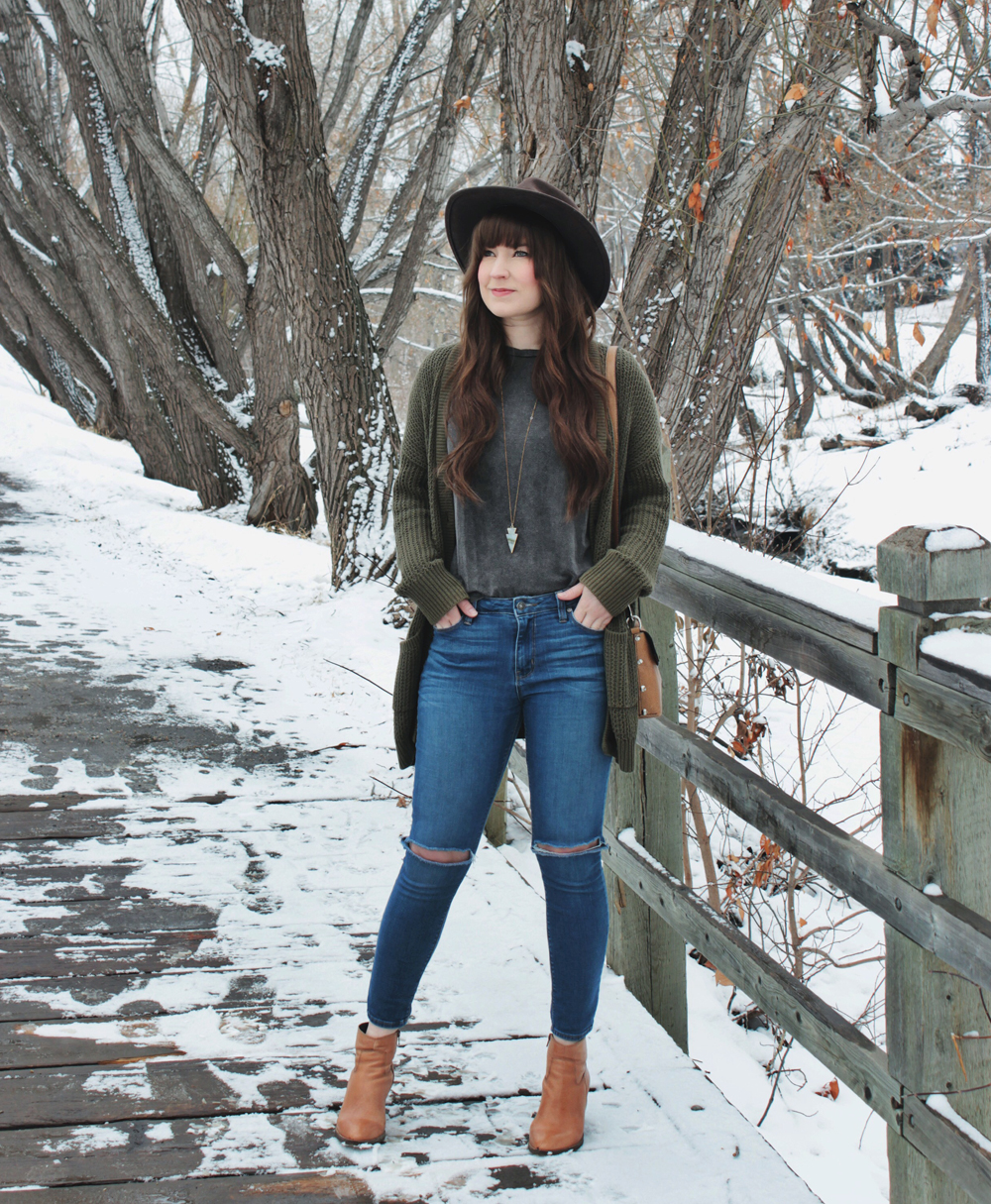For this look, I kept it really cozy and casual in one of my favourite oversized cardigans. I added a simple grey t shirt, and some distressed blue jeans to complete the look. I actually just purchased this tee at Winners for $6 and I couldn’t be happier with it! It’s really soft, and has a bit of a vintage look that I love.