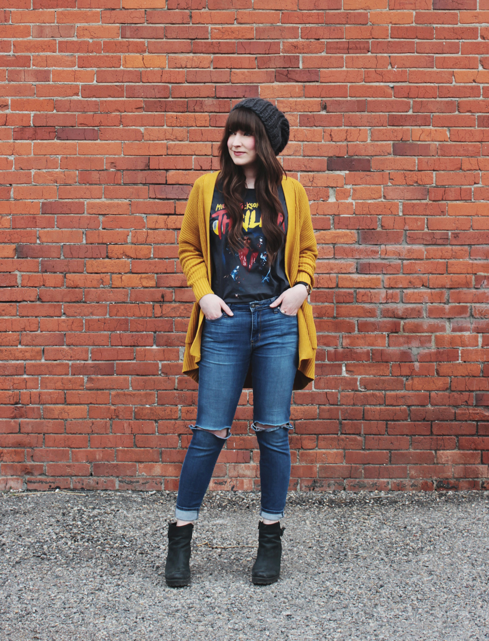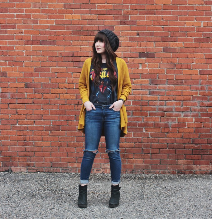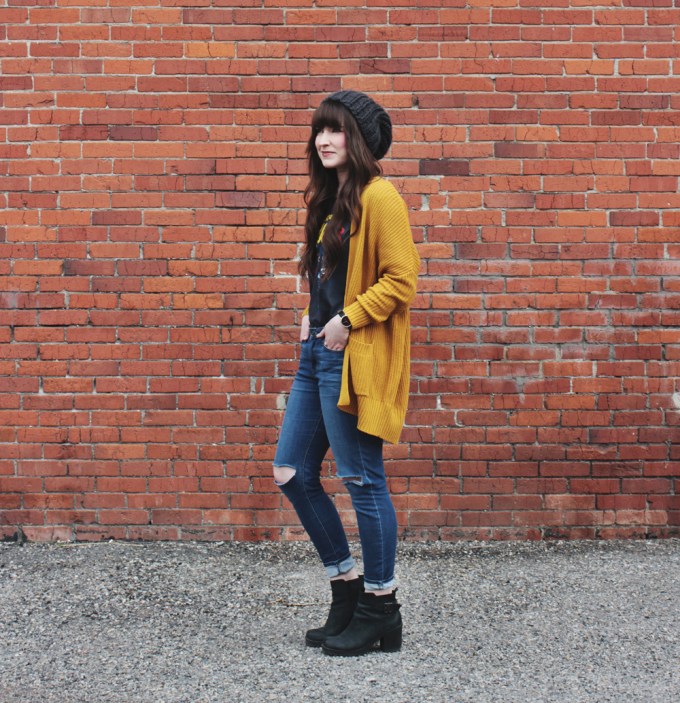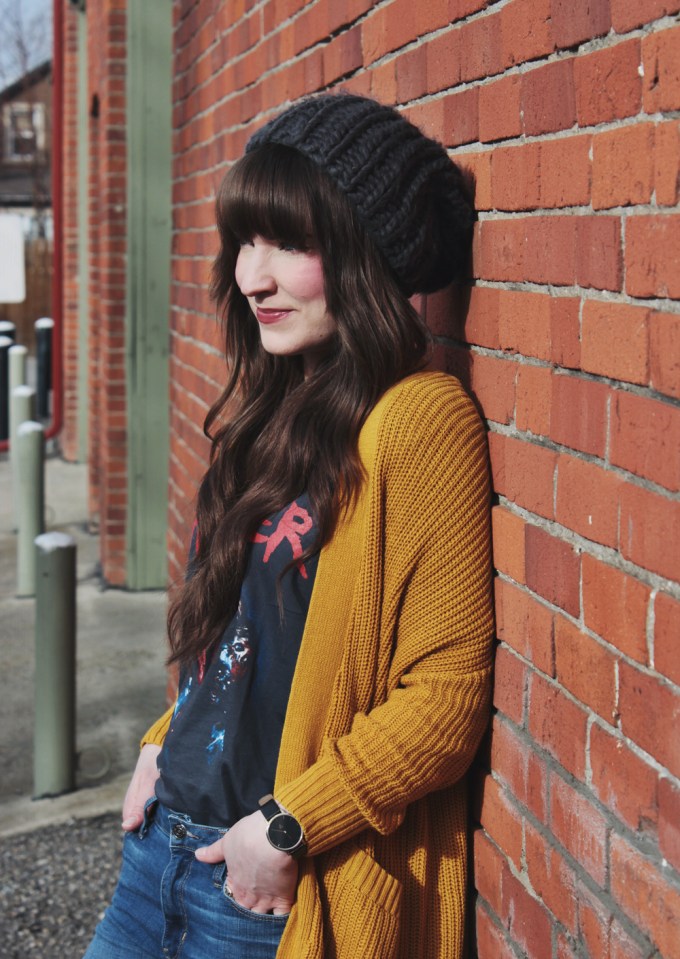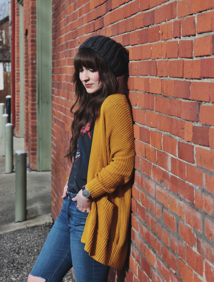 Outfit Details: Cardigan: BDG / Tee: Junk Food / Jeans: Just Black / Boots: C/O Hibou / Watch: C/O Medium Watches