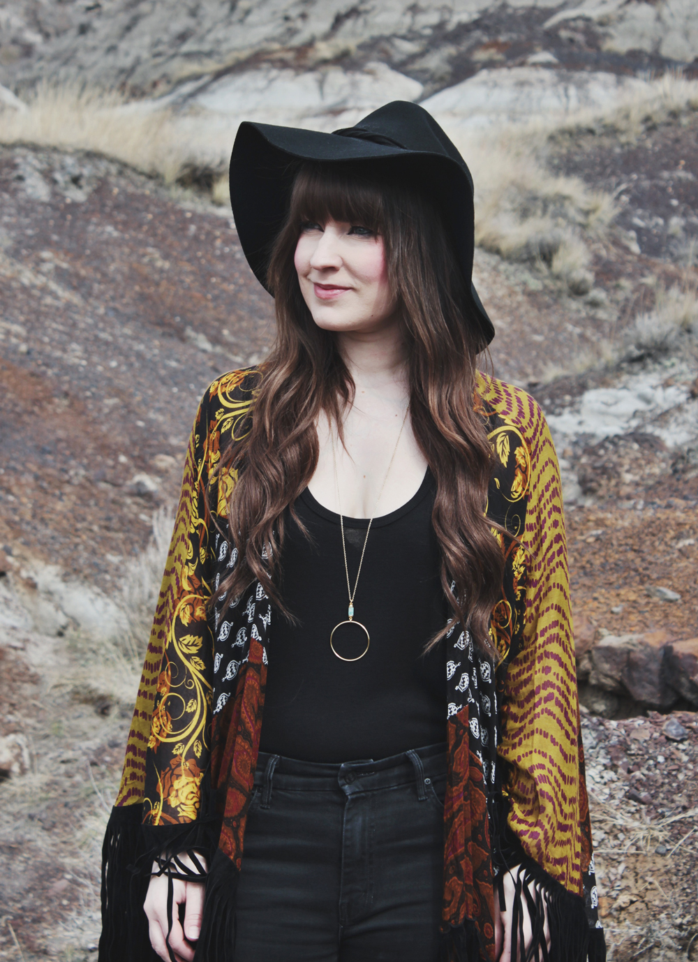 Outfit Details: Kimono: Free People / Necklace: C/O Shesso / Hat: Free People / Boots: Steve Madden