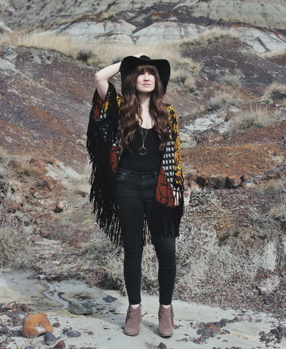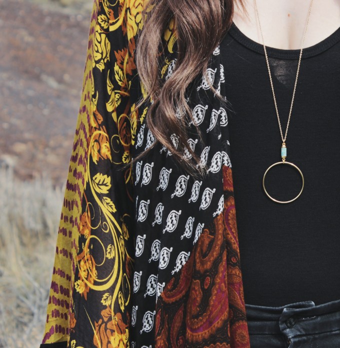 This kimono from Free People is the latest addition to my wardrobe, and i’m pretty obsessed with it. I love the different colours and patterns, as well as the fringe detailing along the bottom. Because it’s such a bold piece, I kept the accessories for this look relatively simple. This black floppy hat, and gold circle necklace by Shesso, are the perfect additions to this look!