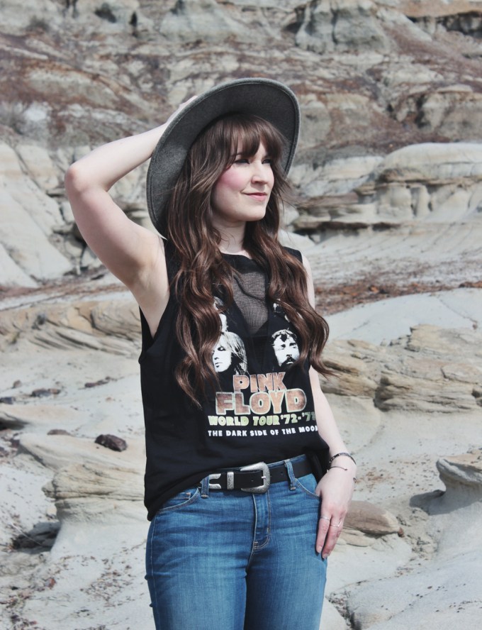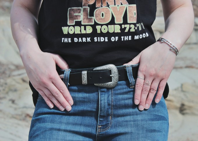 This look consists of a few of my favourite items of clothing. This tank top is one of them. I love band tee’s, so naturally I was drawn to this one. It has some really cool mesh detailing at the top and I love that! I also wore a pair of my favourite distressed jeans, and some black ankle boots. I tried to keep the accessories really simple with a western belt, and some silver rings!