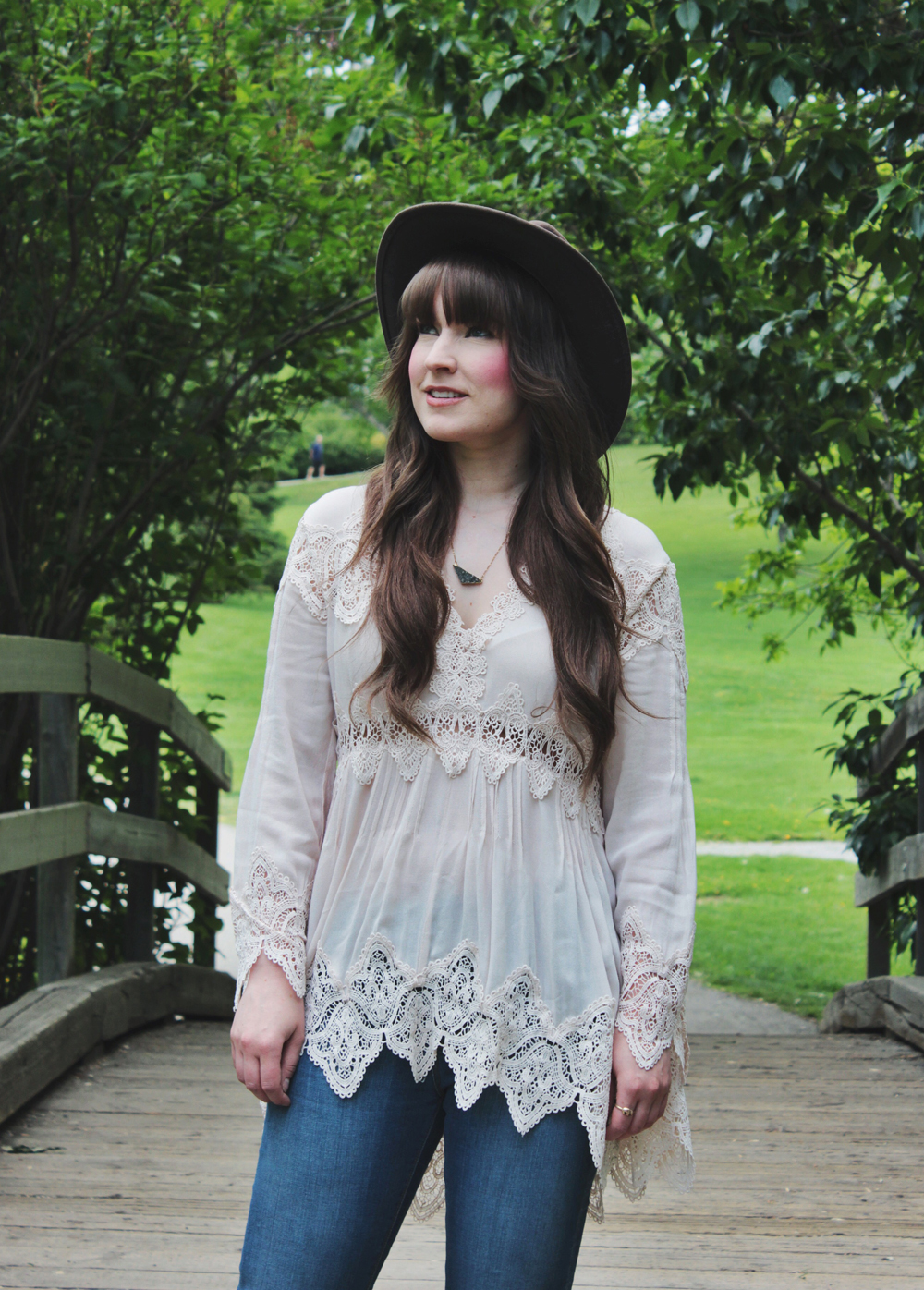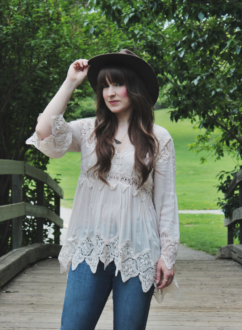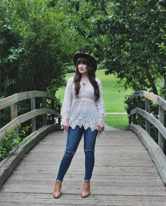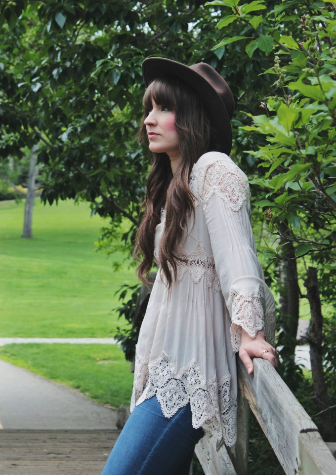 This look is one of my current favourites for spring. This top is romantic and feminine, and we all know how much I love crochet detailing! I paired it with blue jeans, but those can easily be traded for shorts if the weather calls for it. To accessorize, I added one of my favourite hats and a simple necklace by Shesso