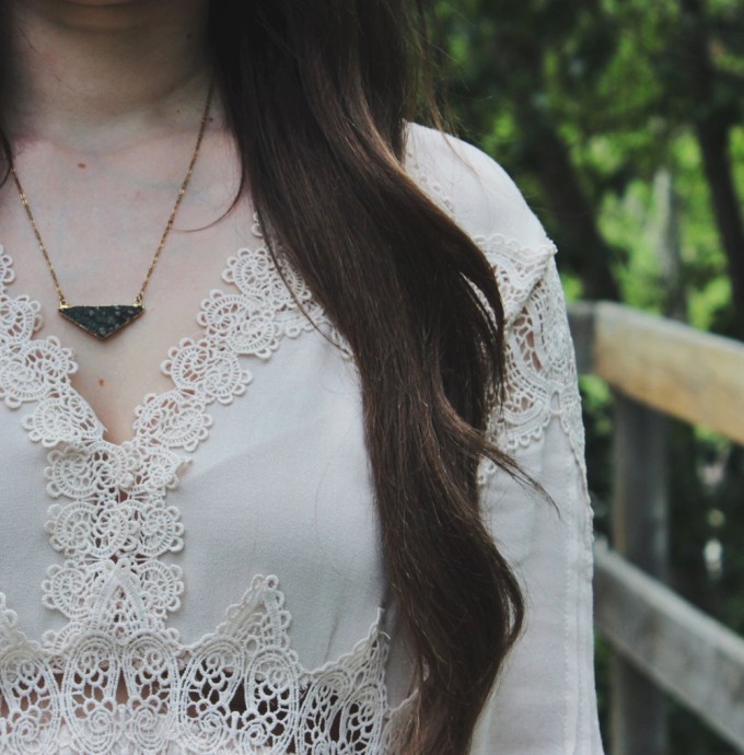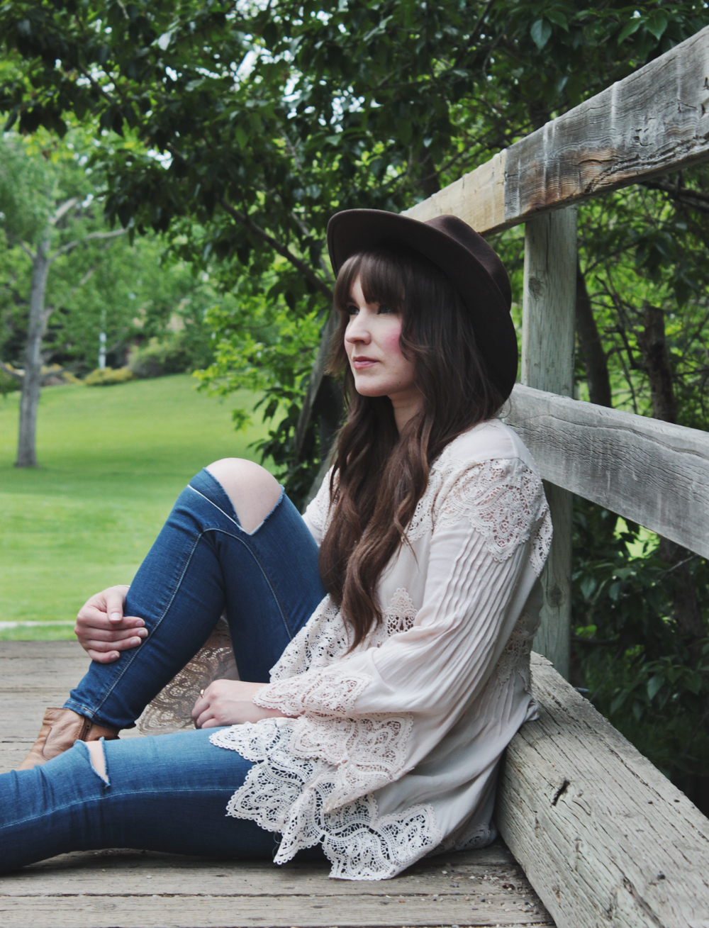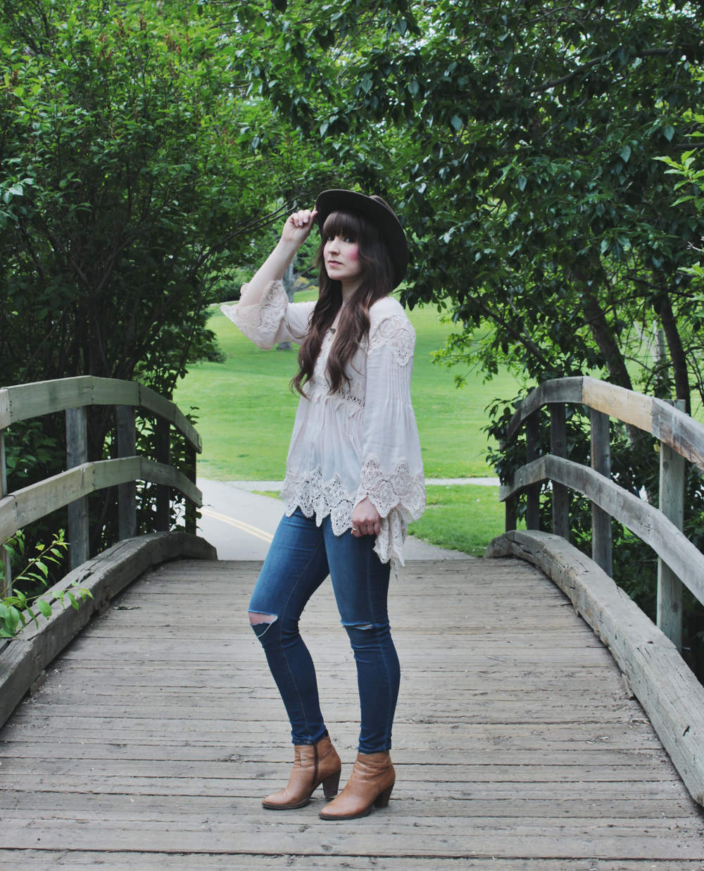 This look is one of my current favourites for spring. This top is romantic and feminine, and we all know how much I love crochet detailing! I paired it with blue jeans, but those can easily be traded for shorts if the weather calls for it. To accessorize, I added one of my favourite hats and a simple necklace by Shesso