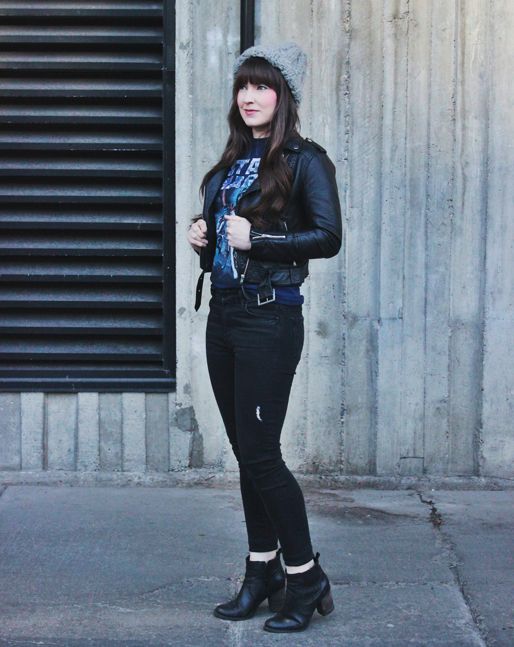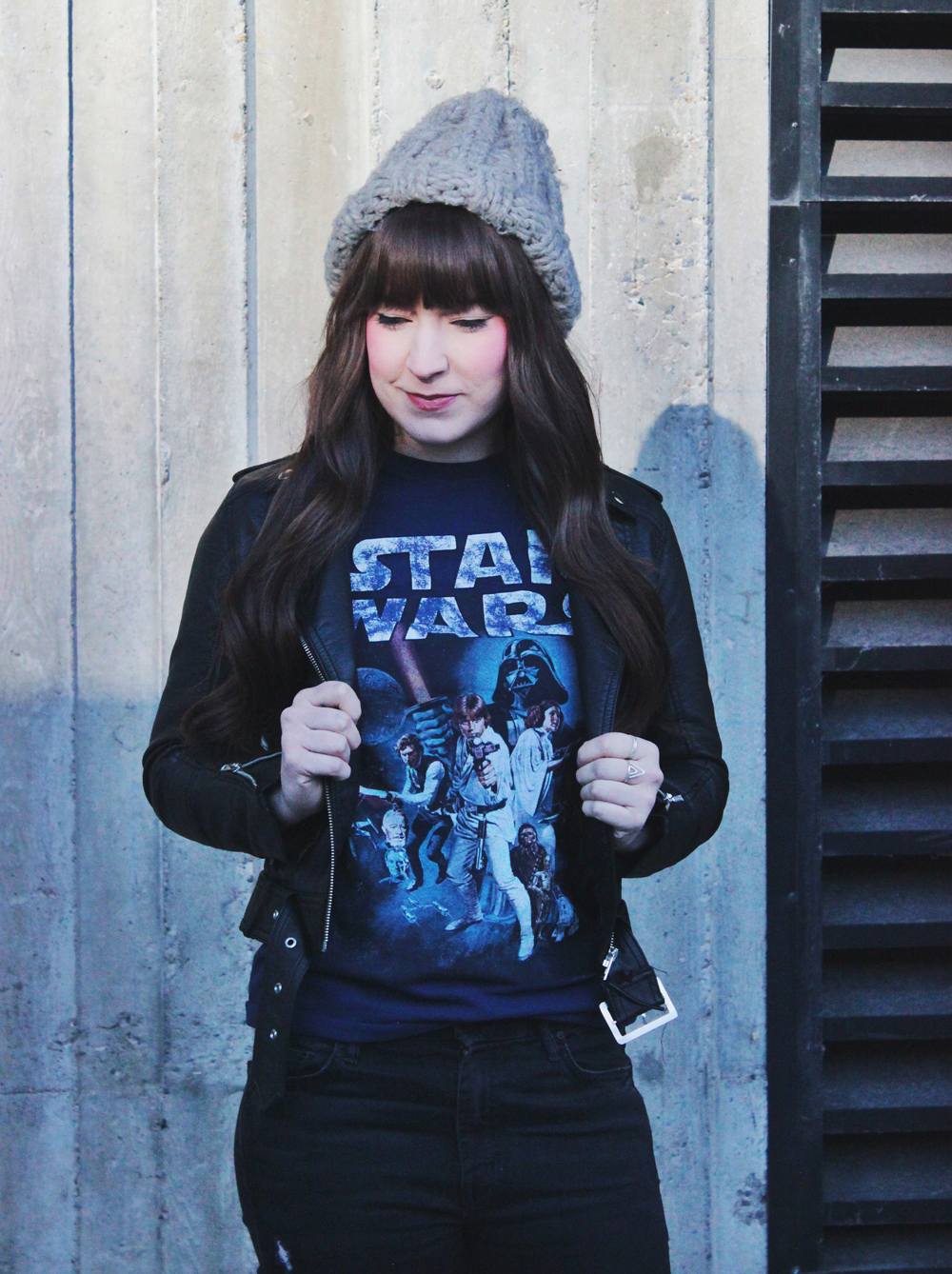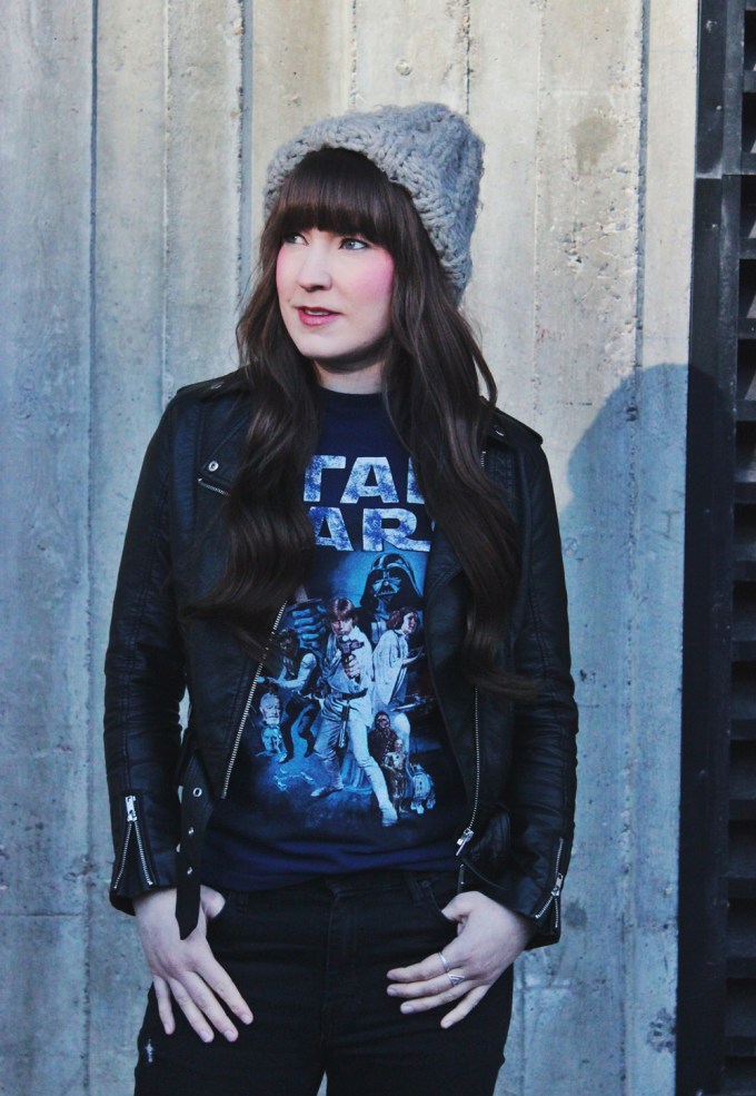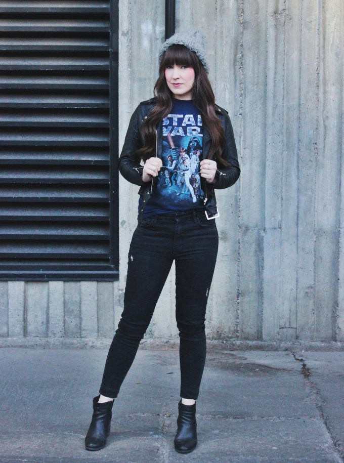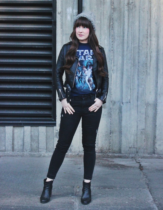 I don’t know about everyone else, but i’m really excited to see The Last Jedi on Thursday. The trailer makes it look so good, and I loved The Force Awakens! There’s also just something about seeing a Star Wars movie on opening night. There is so much energy in the theatre, people applaud, it’s really fun! Naturally i’m pretty excited about this Junk Food tee. I’m a fan of graphic tees, and all things Star Wars so it was an easy purchase! I kept the rest of the outfit pretty simple with my favourite faux leather jacket, and a pair of black skinny jeans.