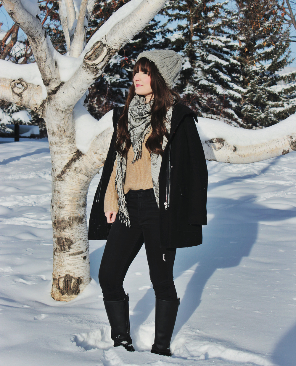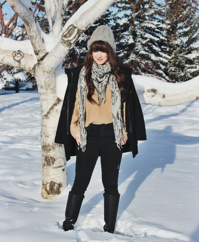 This look consists of some new and old favourites of mine. This sweater from H&M, is one of the latest additions to my wardrobe. Cozy oversized sweaters are one of my favourite thing to wear when it’s cold out. The rest of the look is pretty basic winter wear. These boots are tall and waterproof, so they are perfect for the snow, and even better when the snow turns to slush!