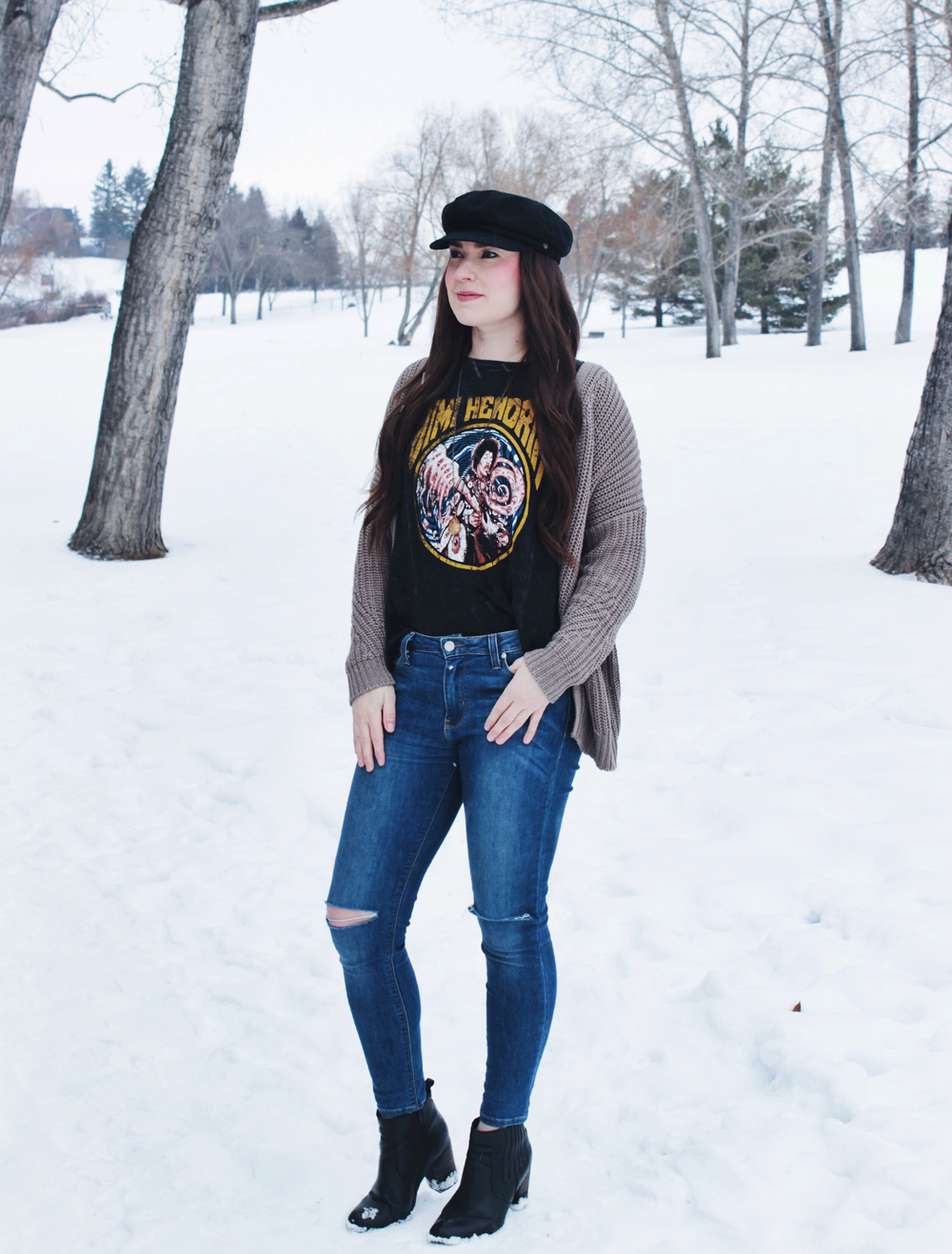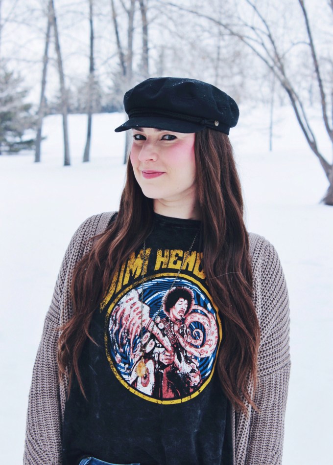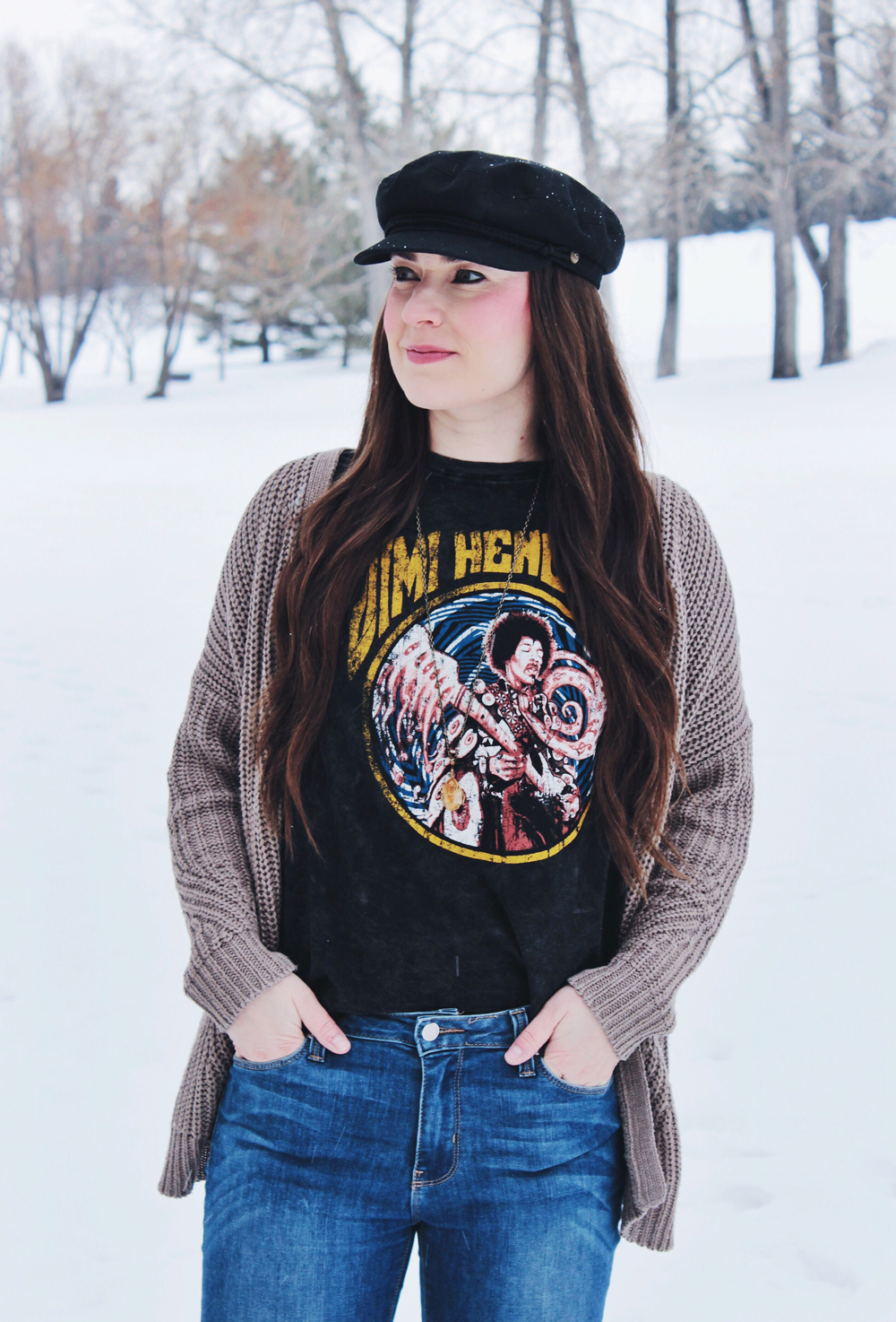 It’s no secret that I love hats! They add so much character to an outfit, that it’s hard to find an accessory that compares. I’ve been wanting this type of hat for a while now, so I finally decided to get one. Brixton is easily one of my favourite hat companies. I like that they make their hats in different sizes, so it’s easy to find one that fits perfectly! I find that when it comes to hats, one size fits all styles rarely works for me. As for the rest of the look, i’ve paired a few of my old and new favourites. This Jimmi Hendrix shirt is a great addition to my band tee collection, and these Just Black jeans are an old favourite.
