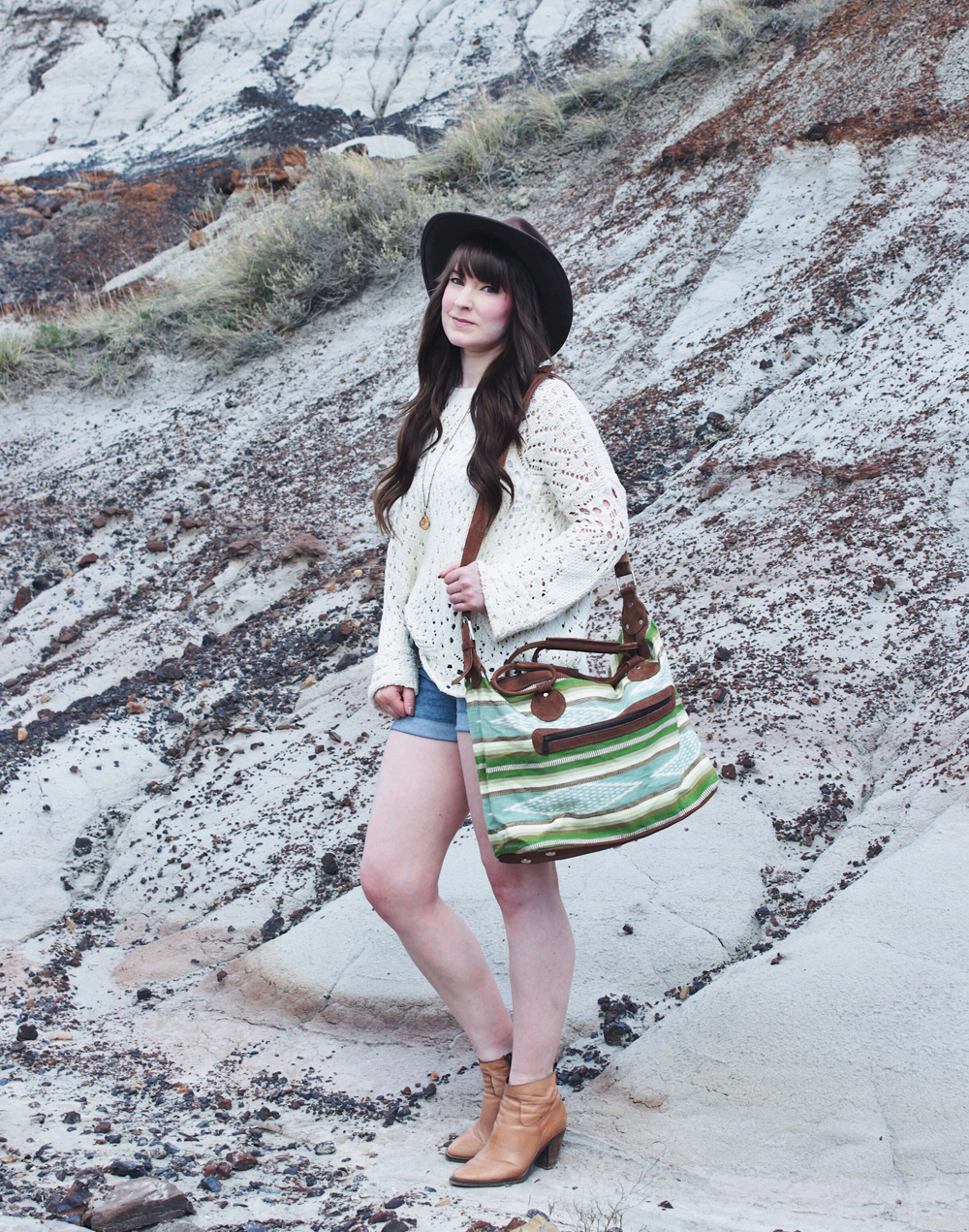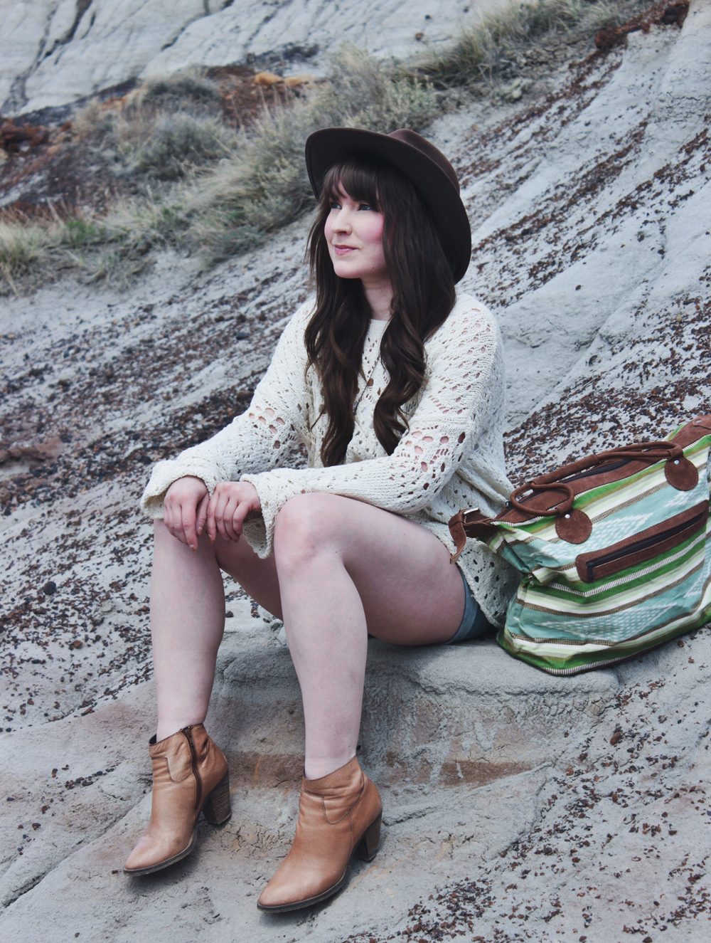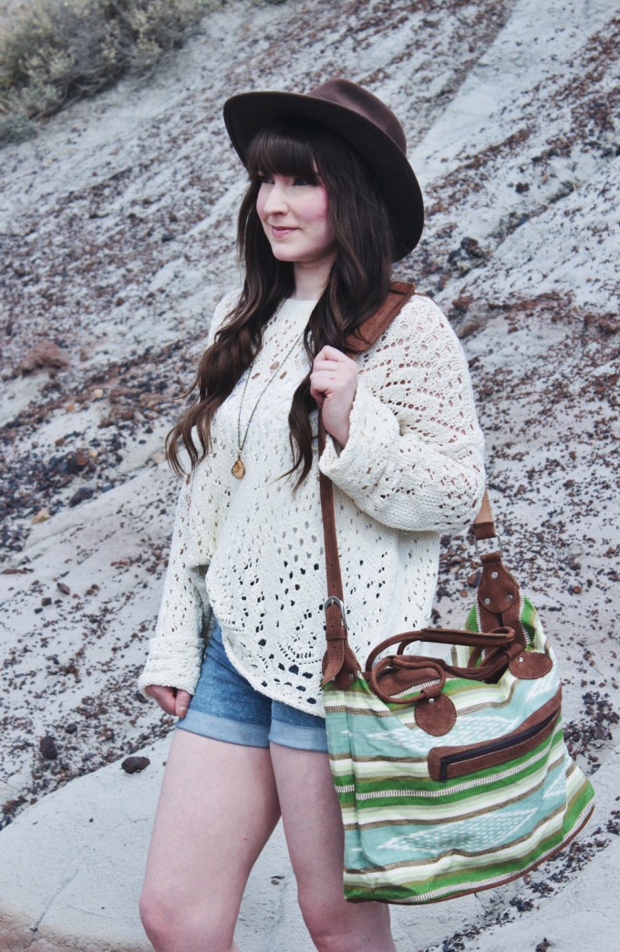 Outfit Details: Sweater: Free People / Shorts: Levi’s / Boots: Steve Madden / Hat: Dorfman / Bag: C/O Genesis Fair Trade
