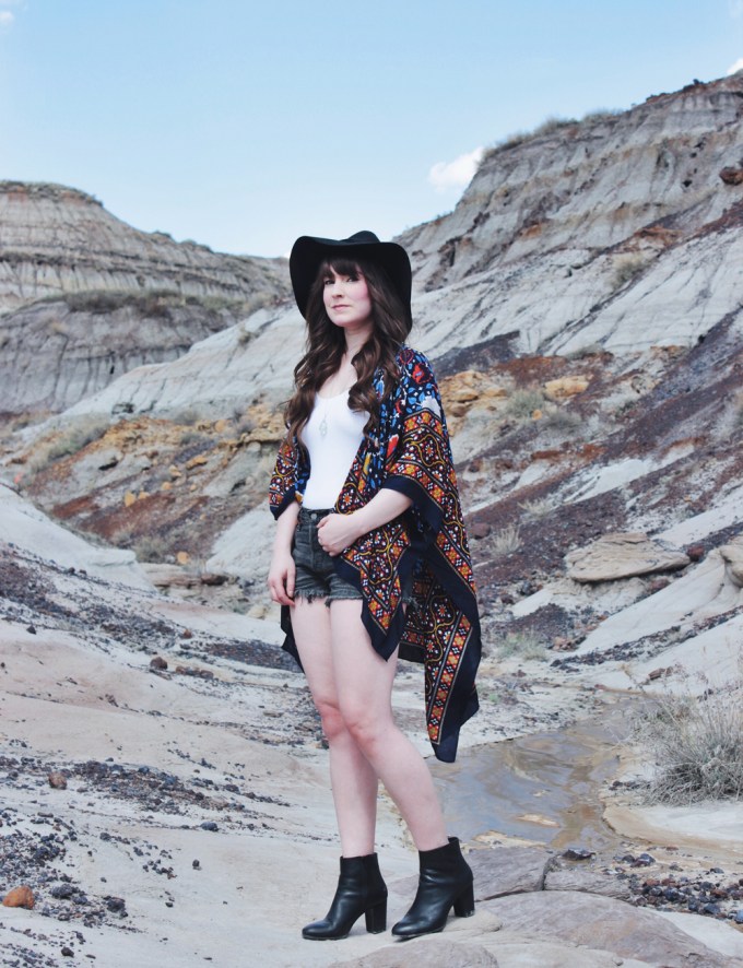 Outfit Details: Kimono: Urban Outfitters / Necklace: C/O Jewelry By Amanda / Bodysuit: Aritzia / Boots: C/O Vionic Shoes / Hat: Free People / Shorts: Levis