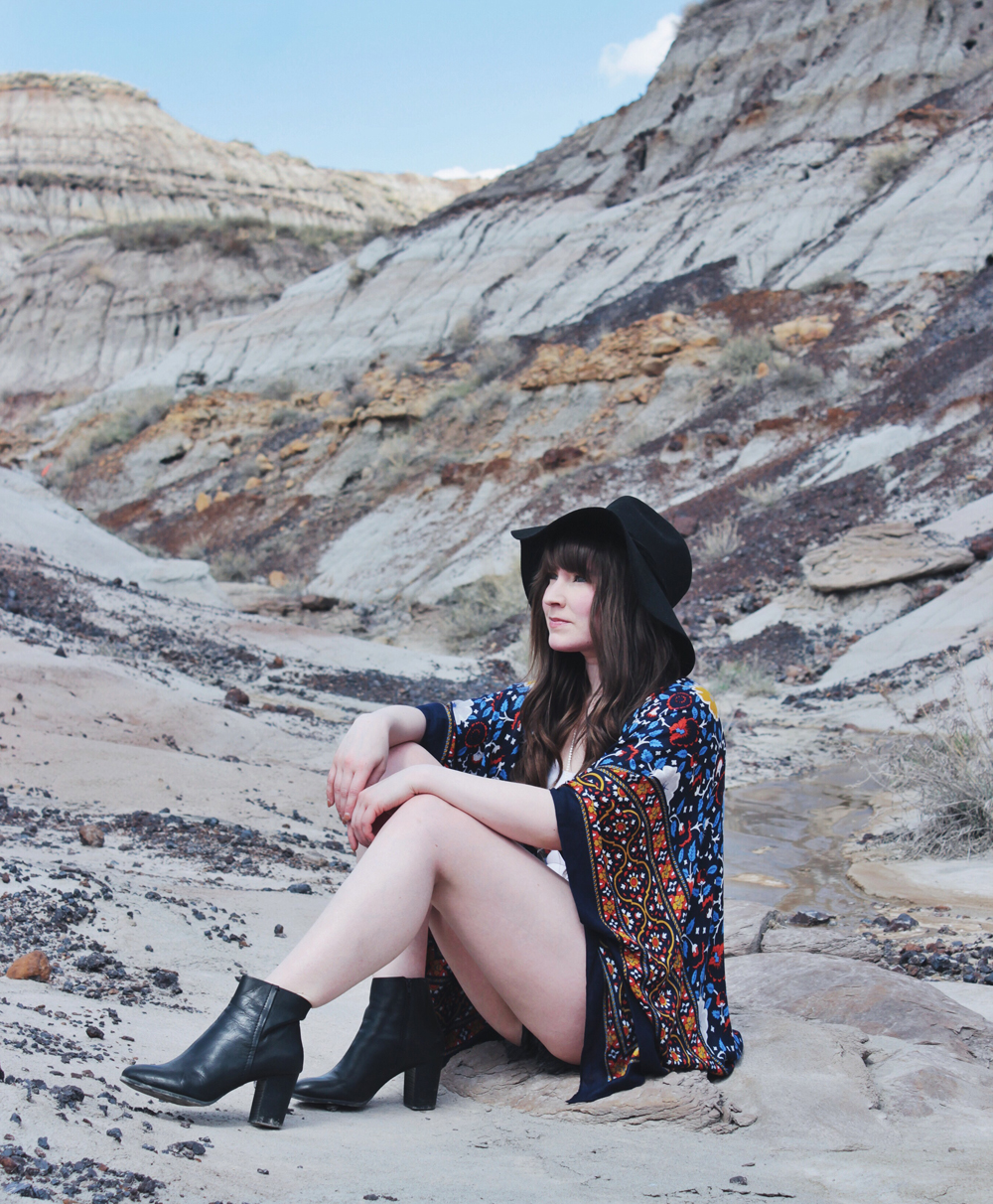 Outfit Details: Kimono: Urban Outfitters / Necklace: C/O Jewelry By Amanda / Bodysuit: Aritzia / Boots: C/O Vionic Shoes / Hat: Free People / Shorts: Levis