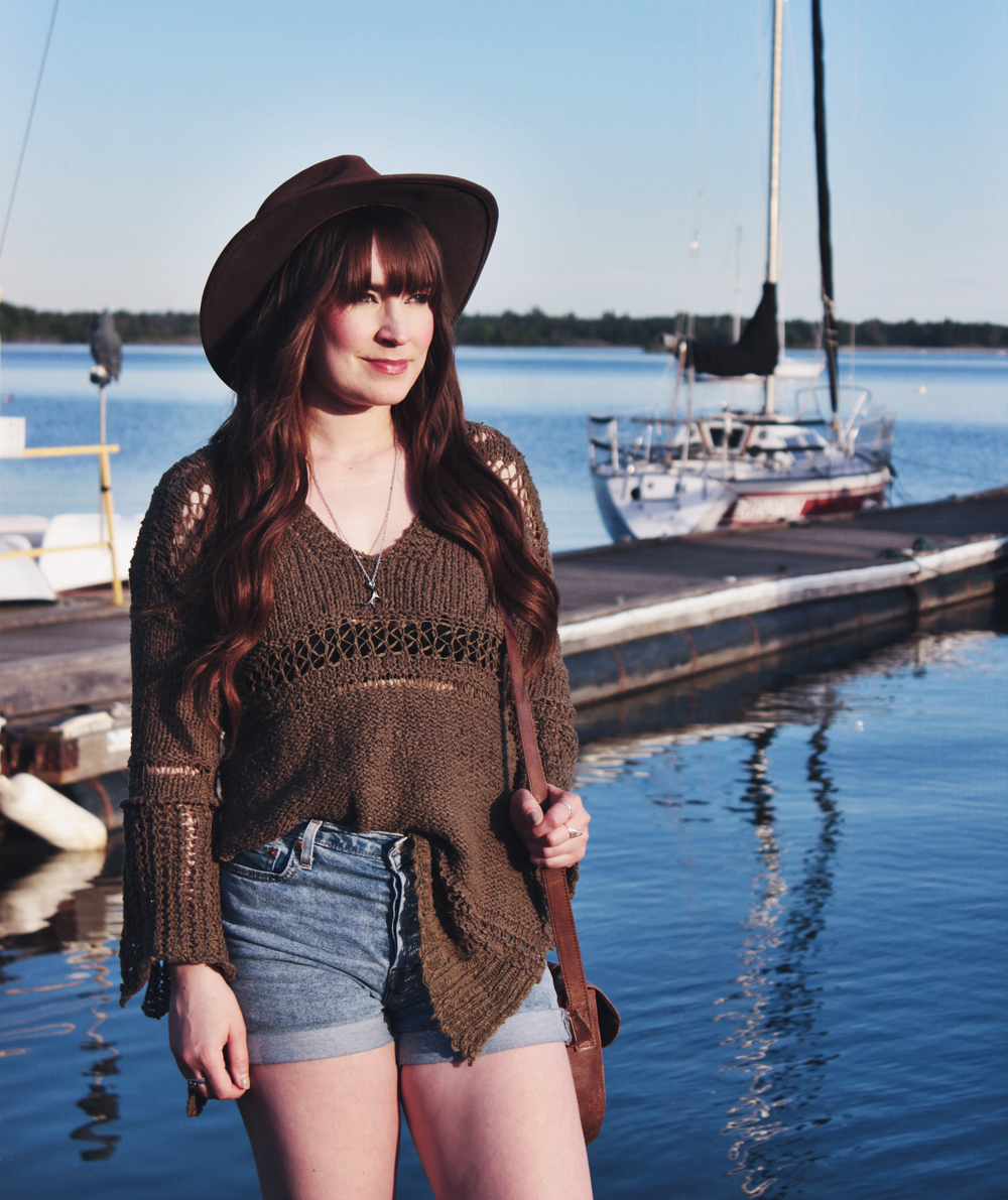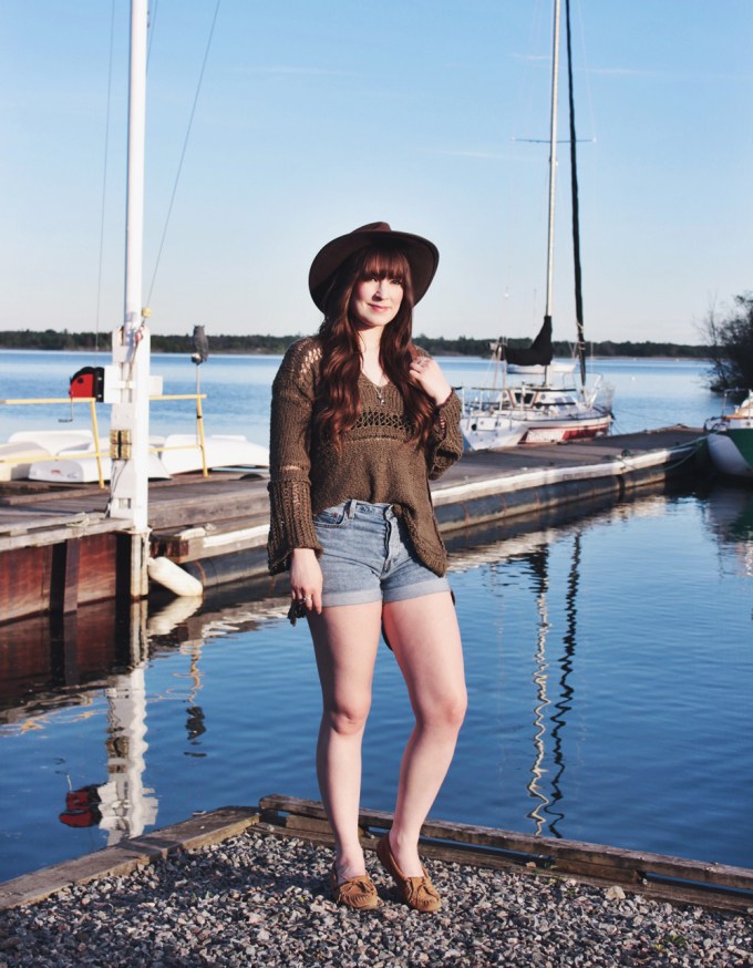 Outfit Details: Sweater: Free People / Shorts: Levi’s / Necklace: C/O Moon Raven Designs / Shoes: Minnetonka / Hat: Dorfman