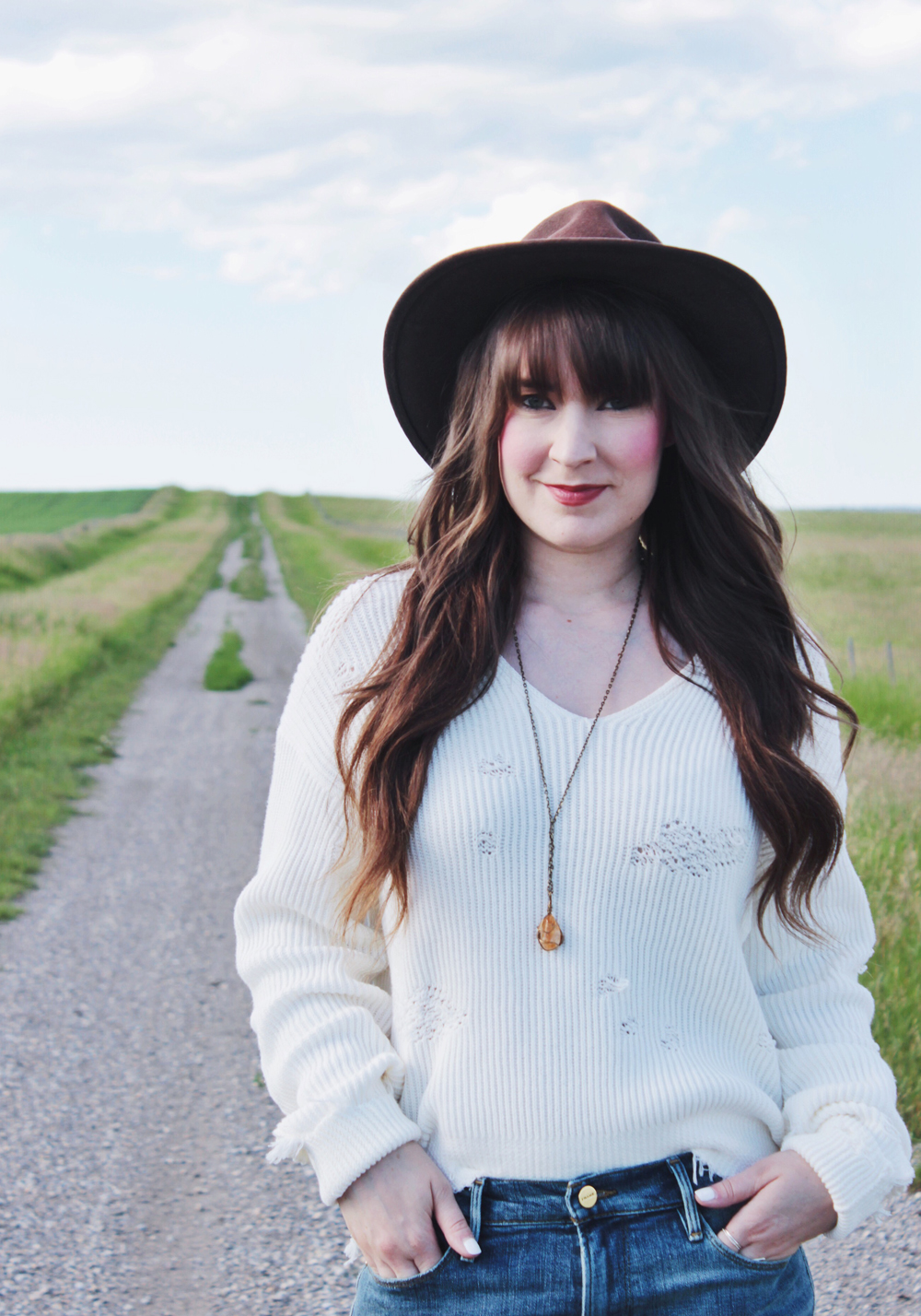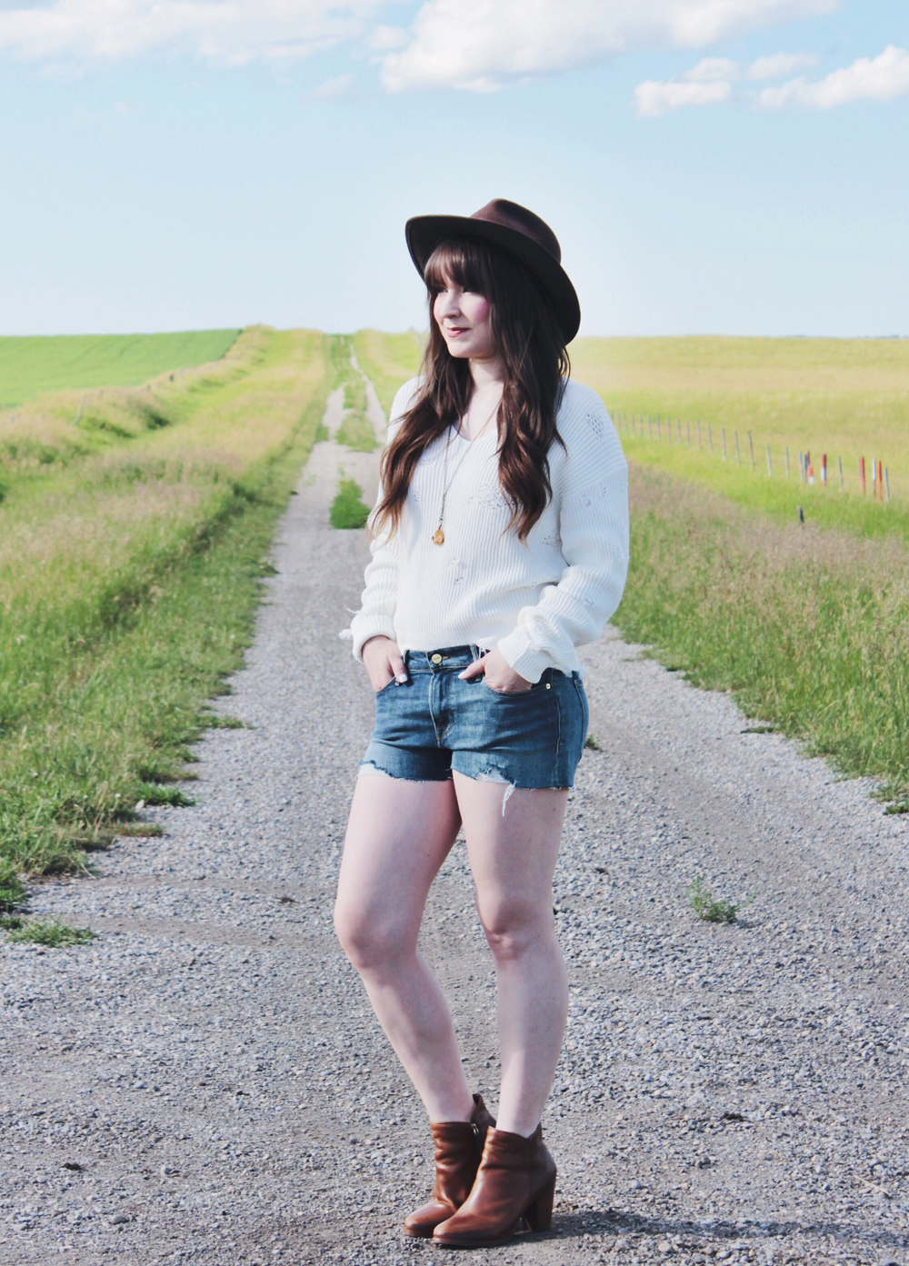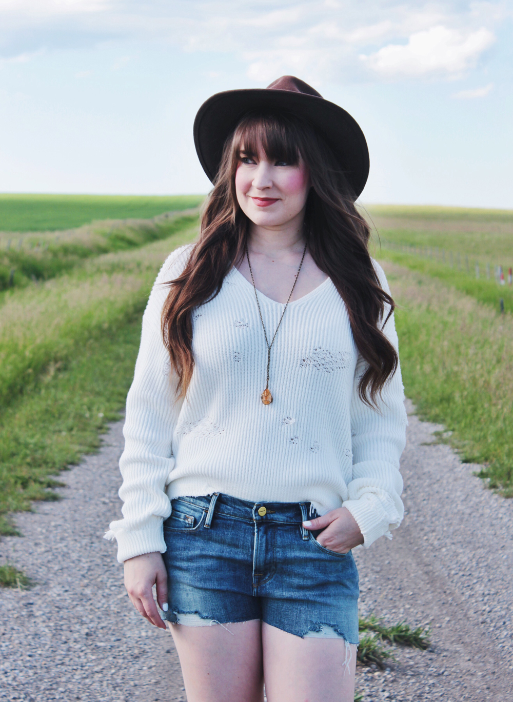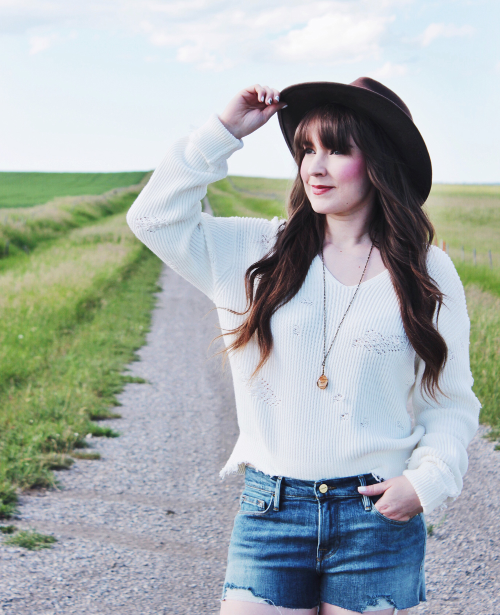 Now that it’s August I know a lot of people are starting to focus on fall styles. It’s inevitable, and I don’t mind, but I still feel like we’ve got a lot of summer left to enjoy! I’ve been pairing sweaters with shorts all summer, and I’m definitely not stopping now! This combo is actually perfect for this time of year, because it allows you to purchase new items (sweaters) that you can also continue to wear into the fall and winter seasons! I don’t know if you could tell, but i’m a big fan of distressed clothing. This sweater by Helmut Lang is a current favourite of mine, as well as these shorts by Frame Denim! To accessorize this look, I added on of my favourite hats and this necklace by Jewelry by Amanda!