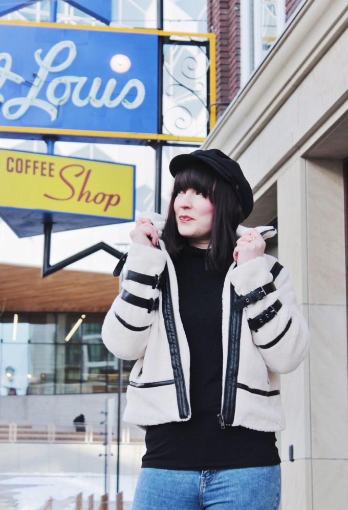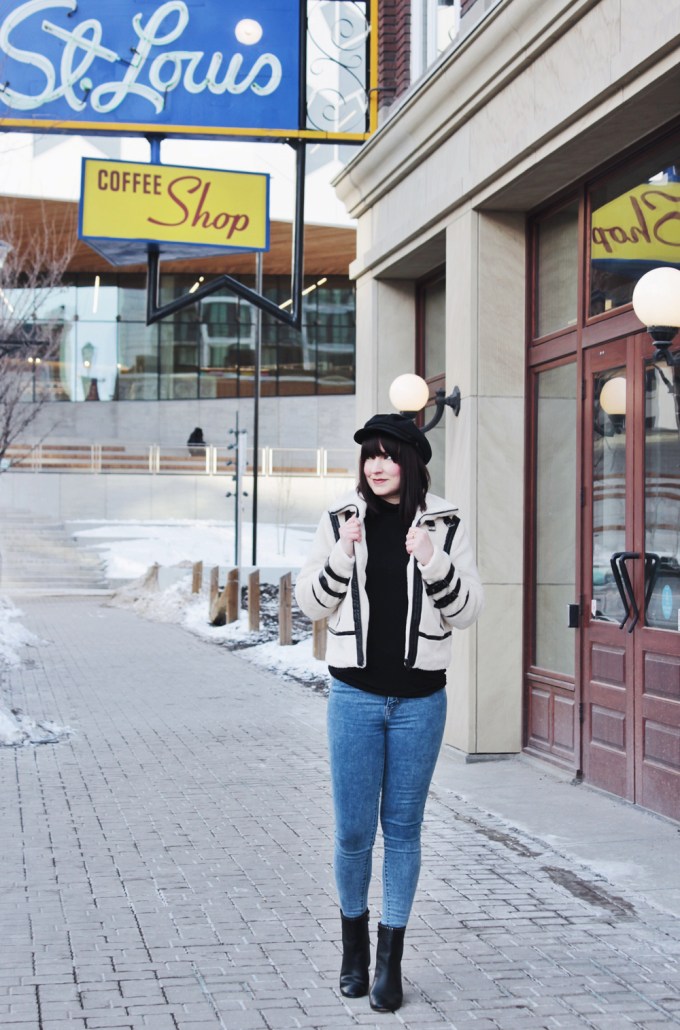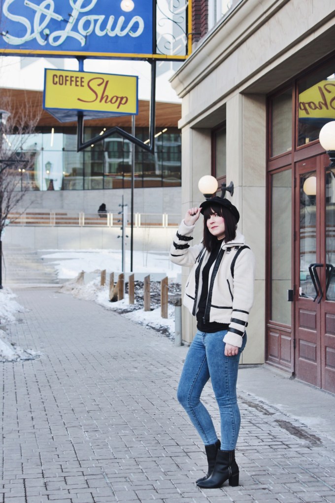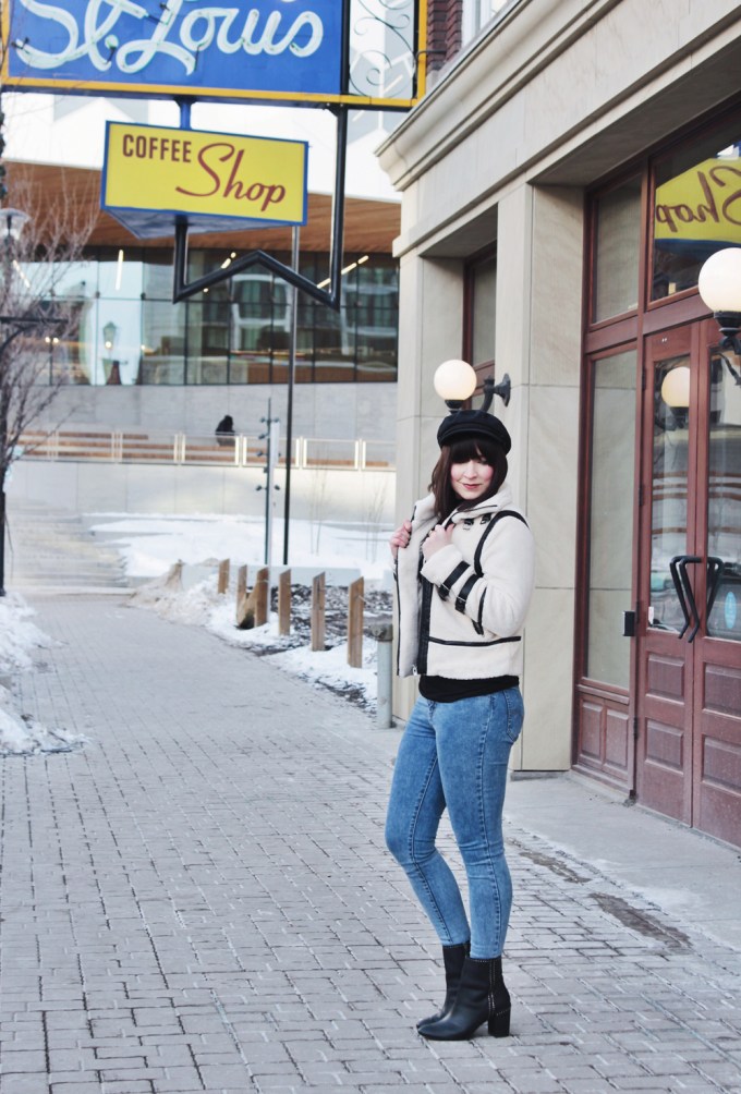 The weather in Calgary is always unpredictable, and even more so in the winter. We can go from extreme cold, to unseasonably warm temperatures in the span of a week. Looking your best with this type of fluctuating weather can be difficult. I find that the best way to deal with it, is to have a few different coats and jackets that vary in warmth and weight. This might also serve as my excuse for owning so many coats, but I definitely think it’s valid! This Faux Sherpa coat by Dh New York is the latest addition to my collection and it’s one of my current favourites! I love all the little details on it, and it’s perfect for the warmer weather we’ve been having lately!