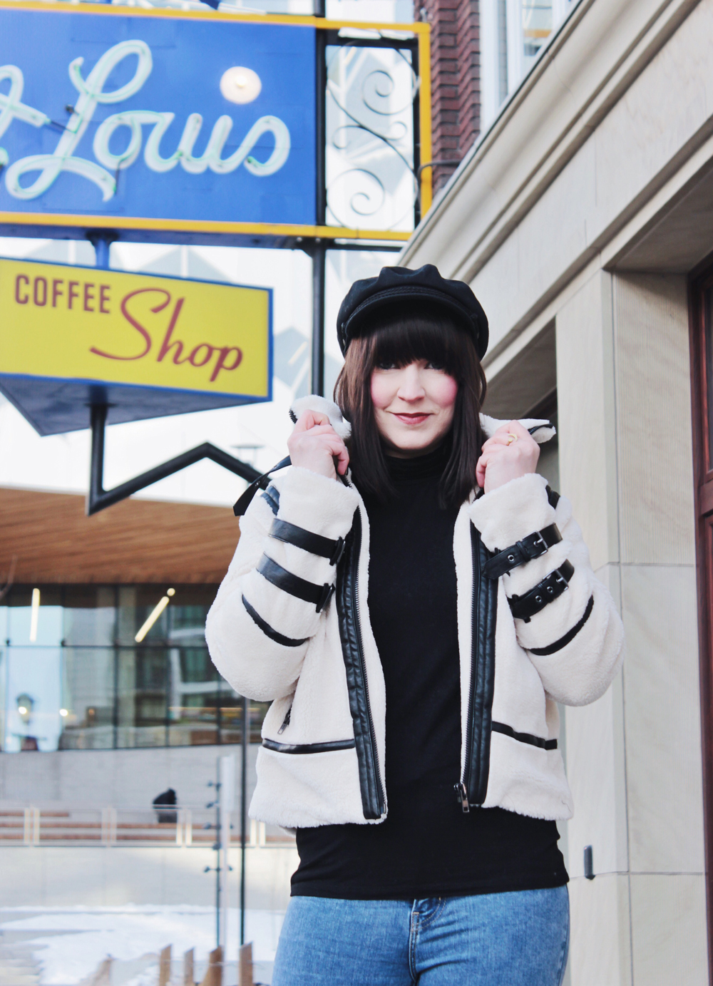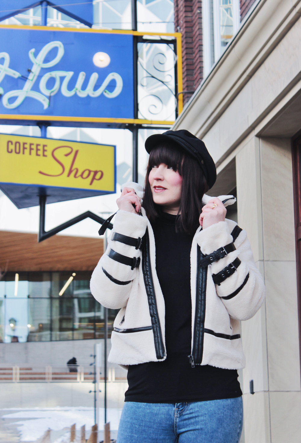 The weather in Calgary is always unpredictable, and even more so in the winter. We can go from extreme cold, to unseasonably warm temperatures in the span of a week. Looking your best with this type of fluctuating weather can be difficult. I find that the best way to deal with it, is to have a few different coats and jackets that vary in warmth and weight. This might also serve as my excuse for owning so many coats, but I definitely think it’s valid! This Faux Sherpa coat by Dh New York is the latest addition to my collection and it’s one of my current favourites! I love all the little details on it, and it’s perfect for the warmer weather we’ve been having lately!