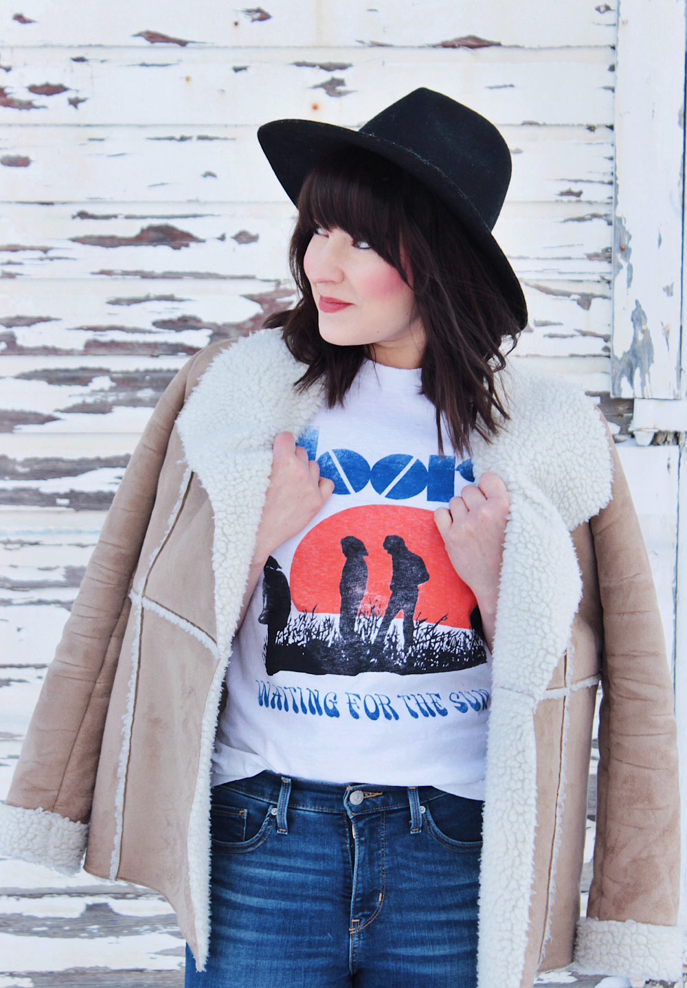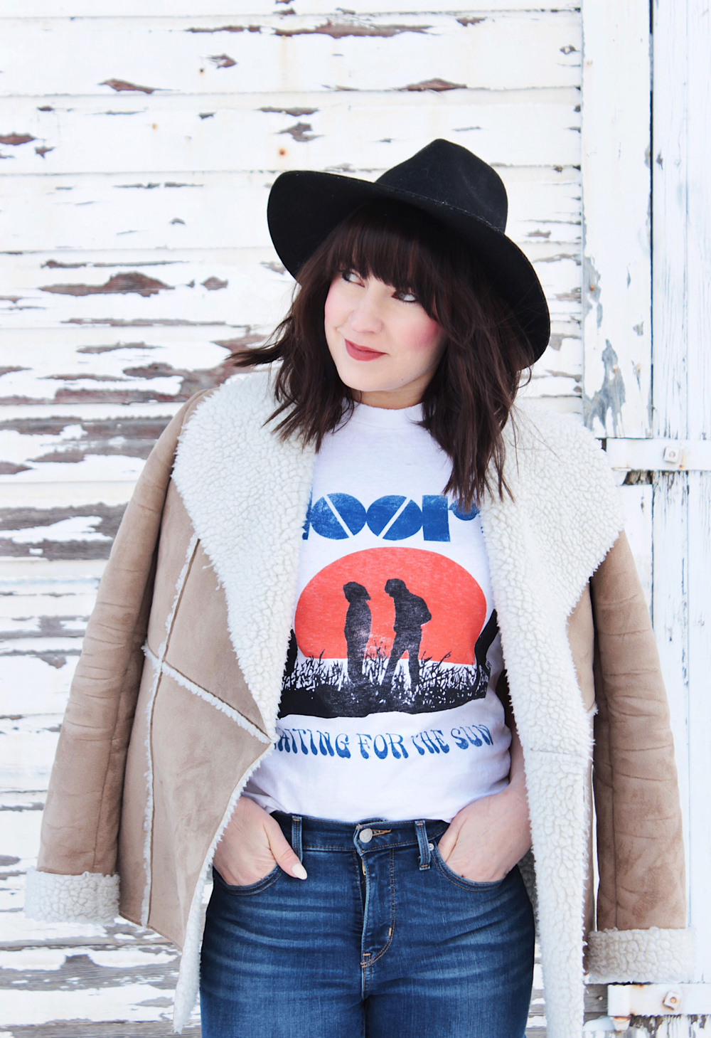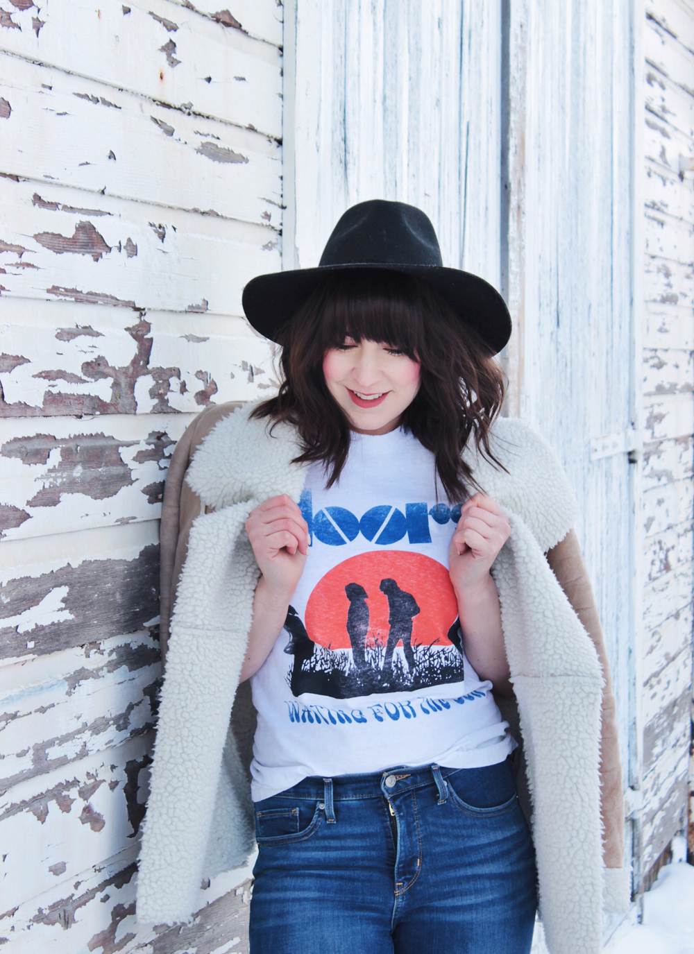 I don’t know about you, but i’m getting really anxious for spring to arrive. It seems like this time of year the cold weather and the snow like to stick around for as long as possible. Here in Calgary we were spoiled with warmer temperatures in December and January, and now it actually feels like winter outside. I’m doing what I can to make the best of it. Because i’m not currently investing in any new winter gear, i’ve styled one of my old favourite sherpa jackets for this look. I paired it with my new Doors tee and some Levi’s Jeans. To accessorize I chose one of my favourite black hats, and a pair of Thursday Boots!
