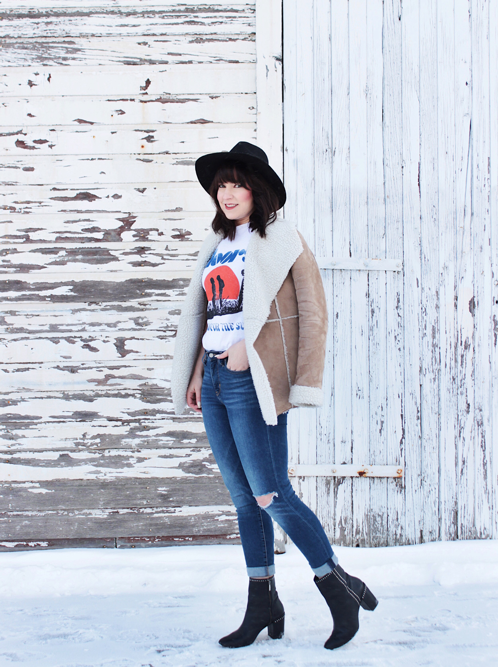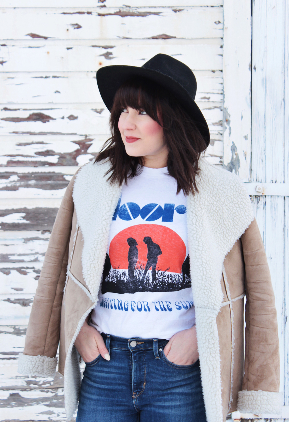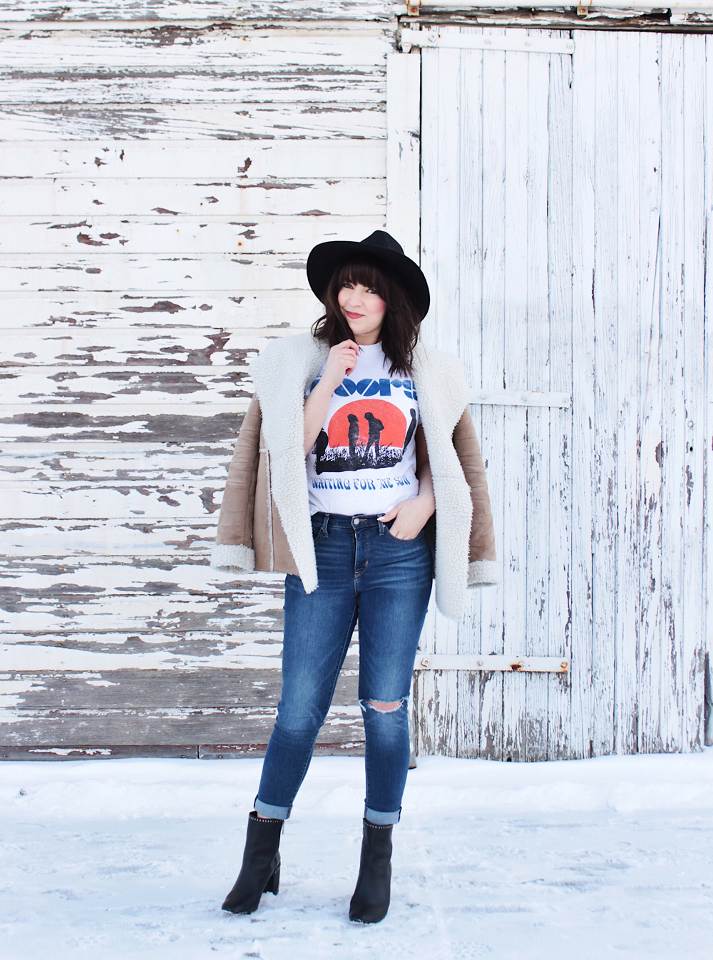 I don’t know about you, but i’m getting really anxious for spring to arrive. It seems like this time of year the cold weather and the snow like to stick around for as long as possible. Here in Calgary we were spoiled with warmer temperatures in December and January, and now it actually feels like winter outside. I’m doing what I can to make the best of it. Because i’m not currently investing in any new winter gear, i’ve styled one of my old favourite sherpa jackets for this look. I paired it with my new Doors tee and some Levi’s Jeans. To accessorize I chose one of my favourite black hats, and a pair of Thursday Boots!