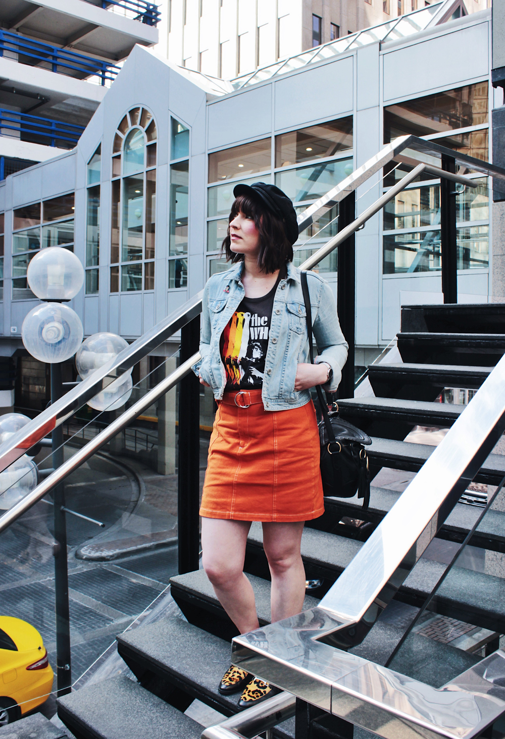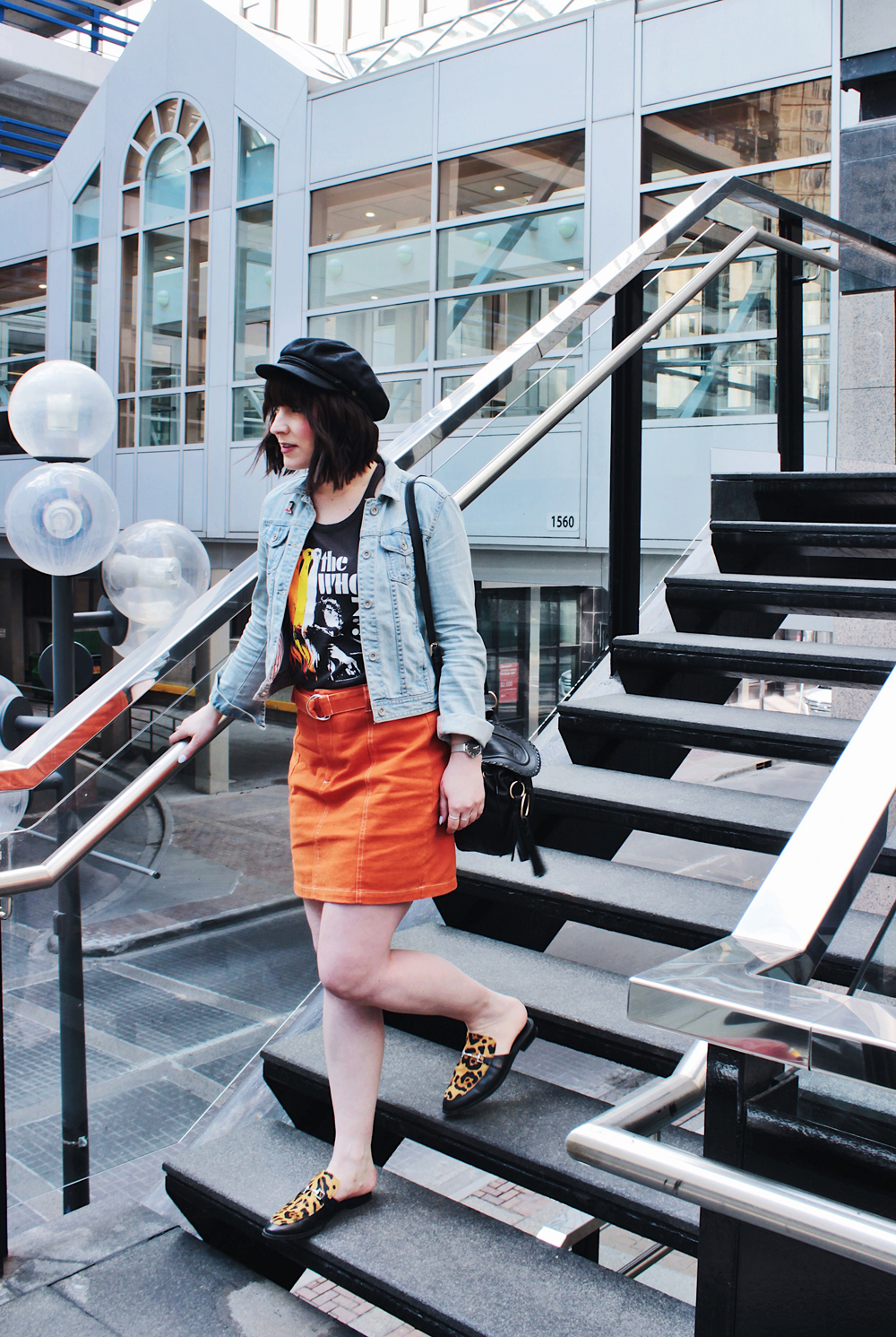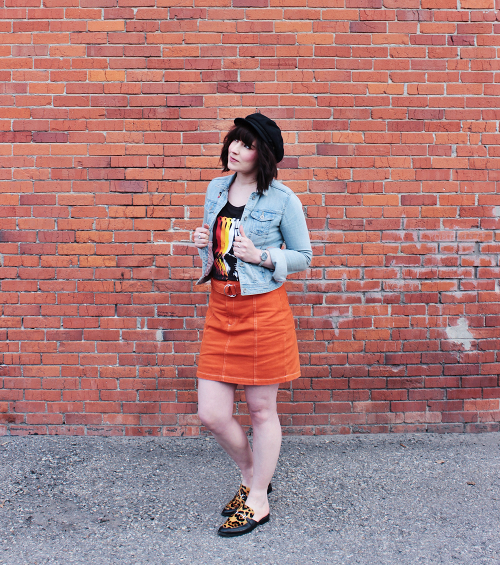 I got these leopard slides at the end of October right when it started to get cold, so I didn’t really have a chance to wear them until now. I’ve been finding that they work with a lot of different looks, and they add an extra bit of detail which is always nice! Lately i’ve been trying to inject more life into my wardrobe by adding brighter pieces into the mix. This orange skirt for example, adds the perfect pop of colour to this outfit without being overwhelming. It also matches perfectly with the colours in the top, making the perfectionist in me very happy!