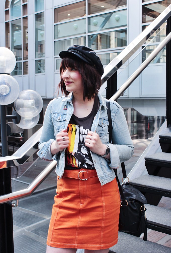 Youthful, bob hair and denim in matching orange skirts, I never thought that this pairing would look so good.