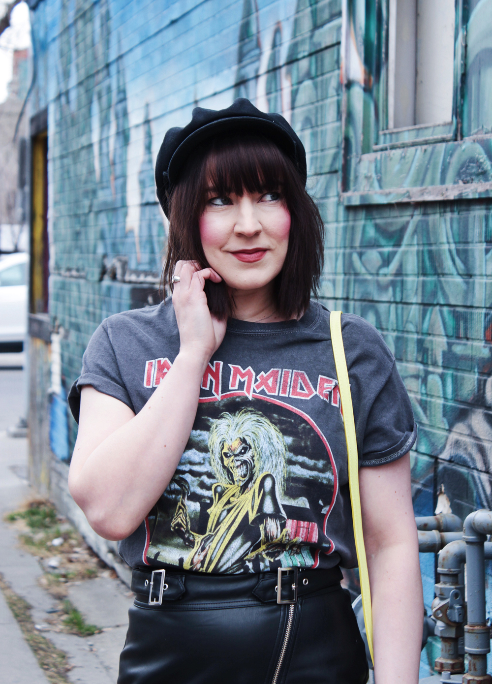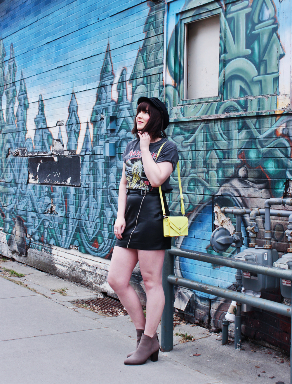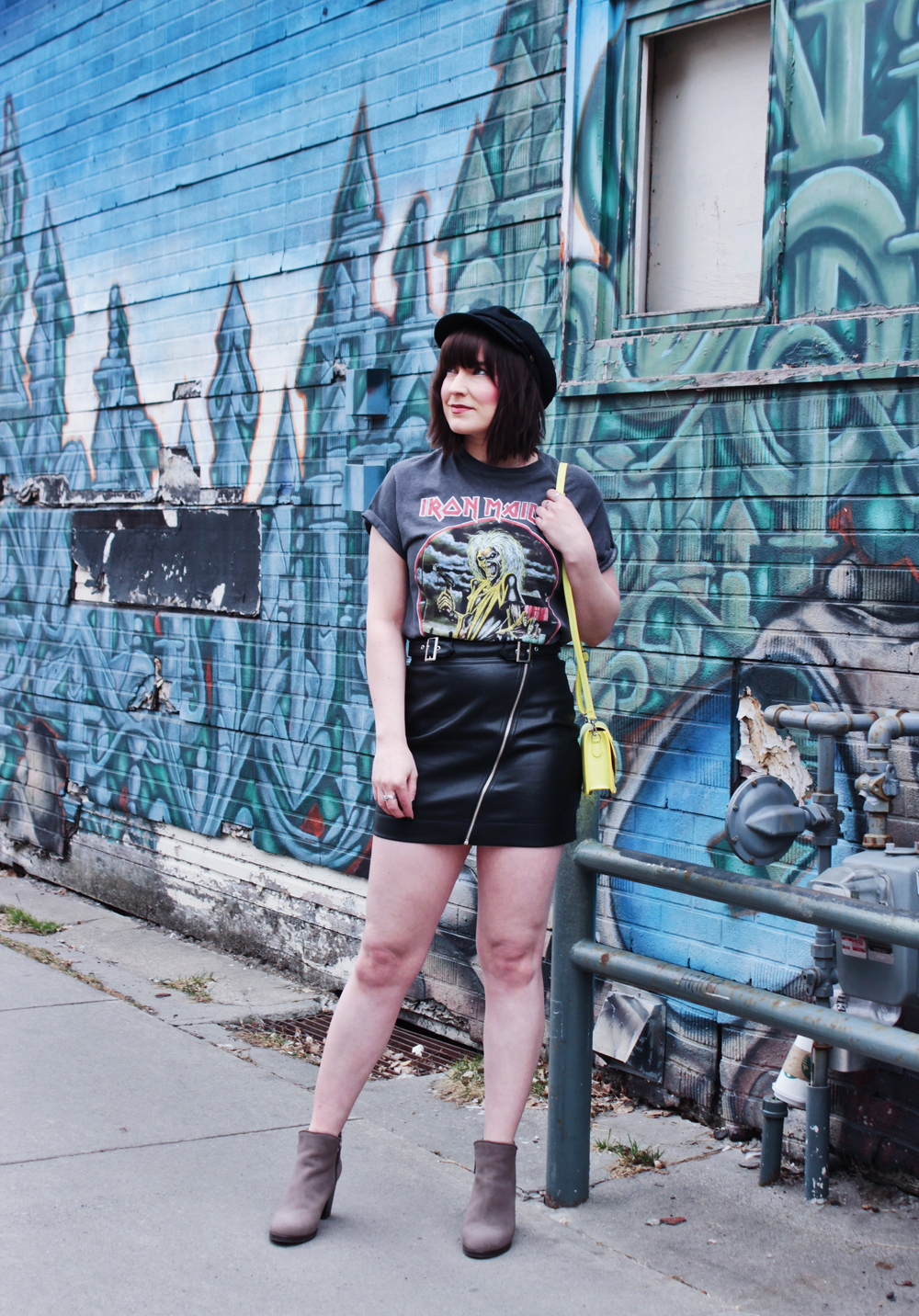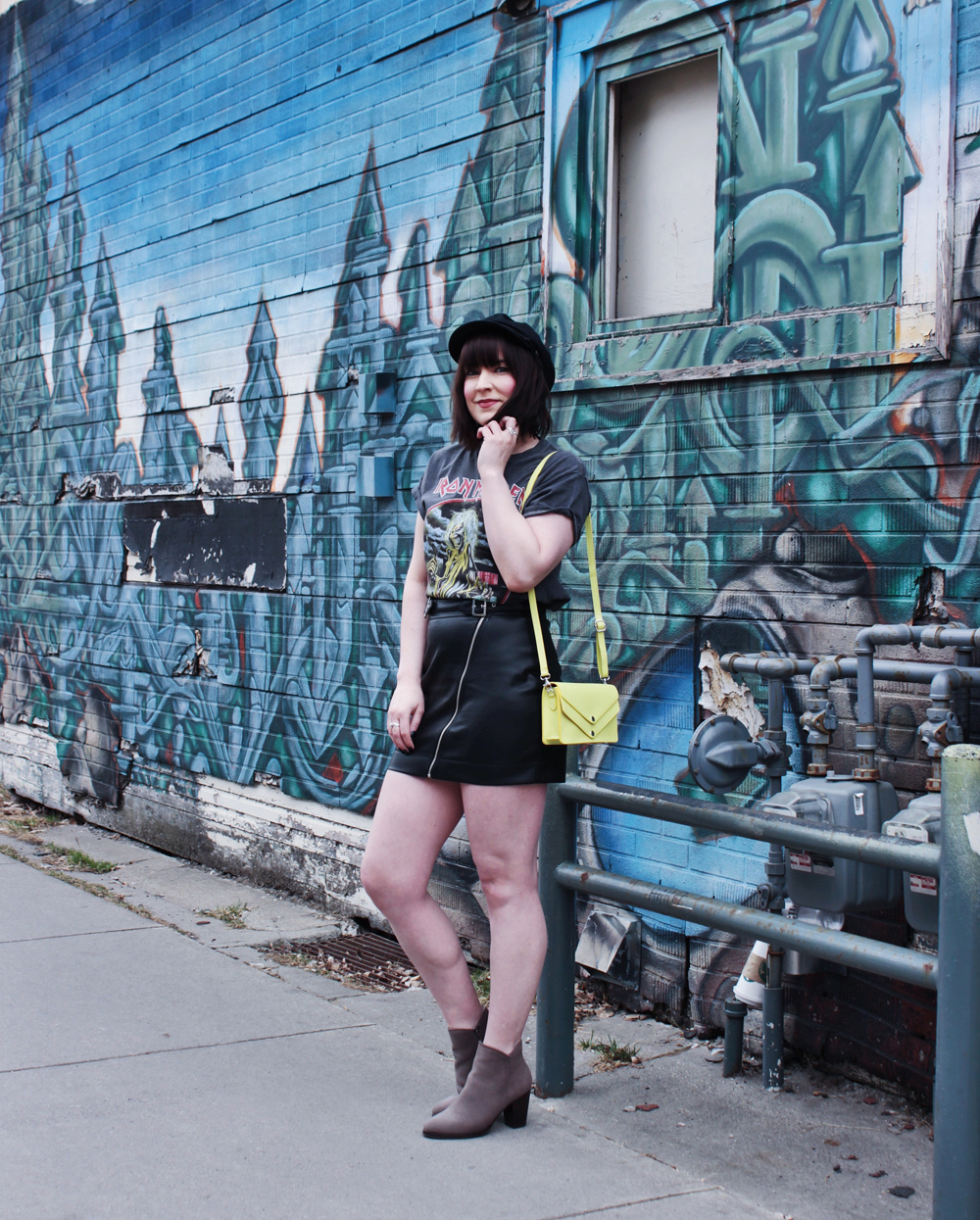 I don’t know if it’s possible for me to explain how much I love this skirt! I’ve been wanting a faux leather skirt for a little while now, so finding this one at Urban Outfitters was like a match made in heaven. I usually have good luck with skirts from UO. Their sizing is very consistent for the most part, which is nice when you order online as much as I do! As for the rest of the look, I added this Iron Maiden tee, and this yellow bag to add a pop of colour to an otherwise colourless look. I’ve been steering towards edgier looks lately, and I think it’s mainly because of my shorter hair style. I love how a hair style makes such a difference to your overall look in general!
