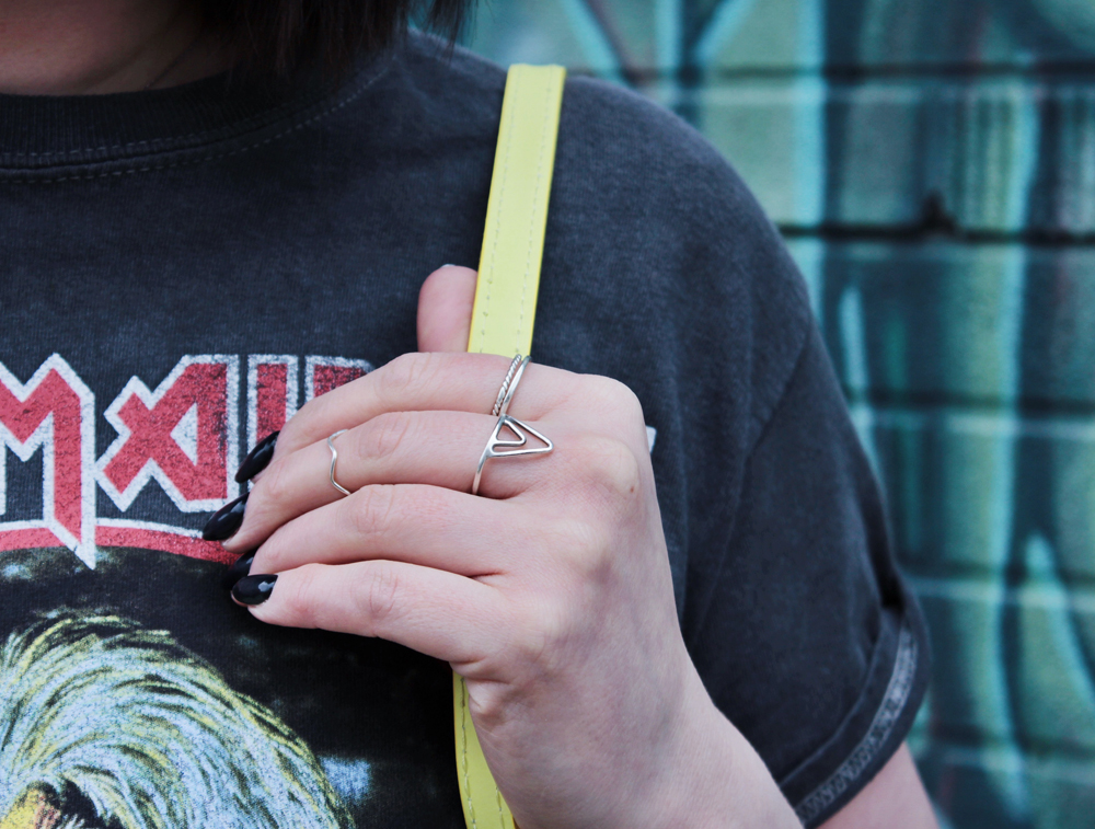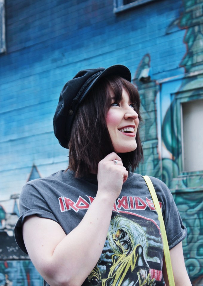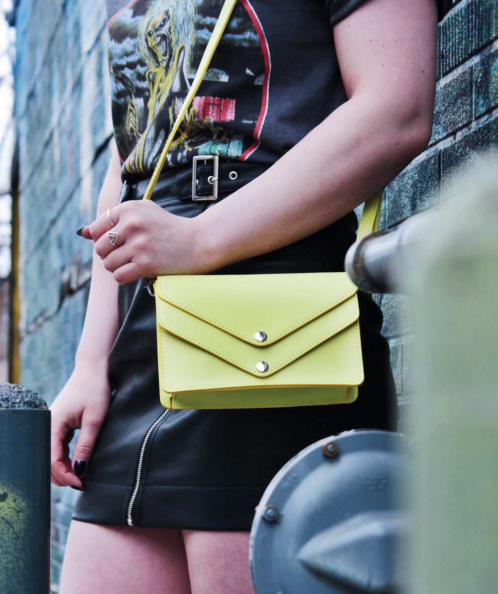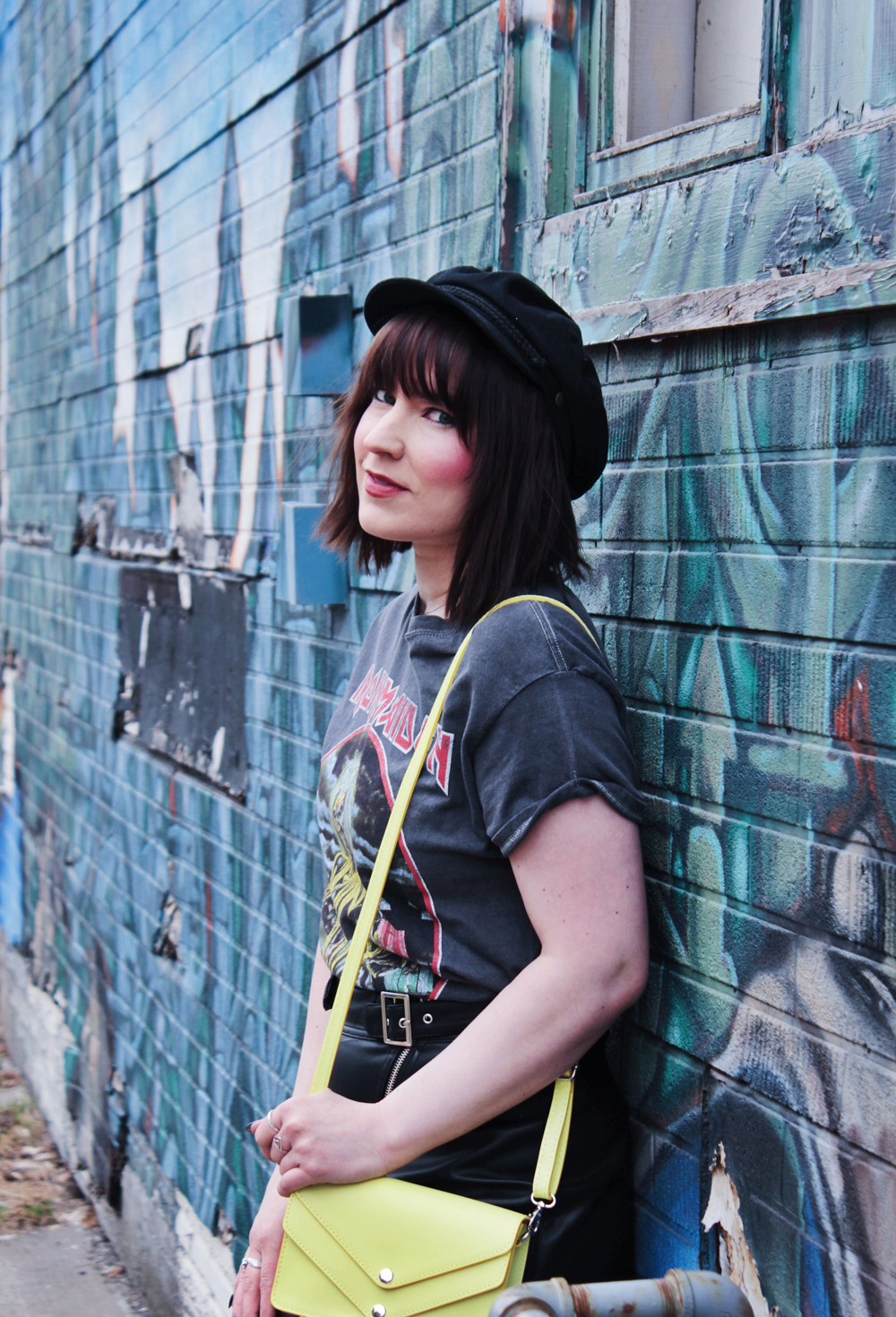 I don’t know if it’s possible for me to explain how much I love this skirt! I’ve been wanting a faux leather skirt for a little while now, so finding this one at Urban Outfitters was like a match made in heaven. I usually have good luck with skirts from UO. Their sizing is very consistent for the most part, which is nice when you order online as much as I do! As for the rest of the look, I added this Iron Maiden tee, and this yellow bag to add a pop of colour to an otherwise colourless look. I’ve been steering towards edgier looks lately, and I think it’s mainly because of my shorter hair style. I love how a hair style makes such a difference to your overall look in general!