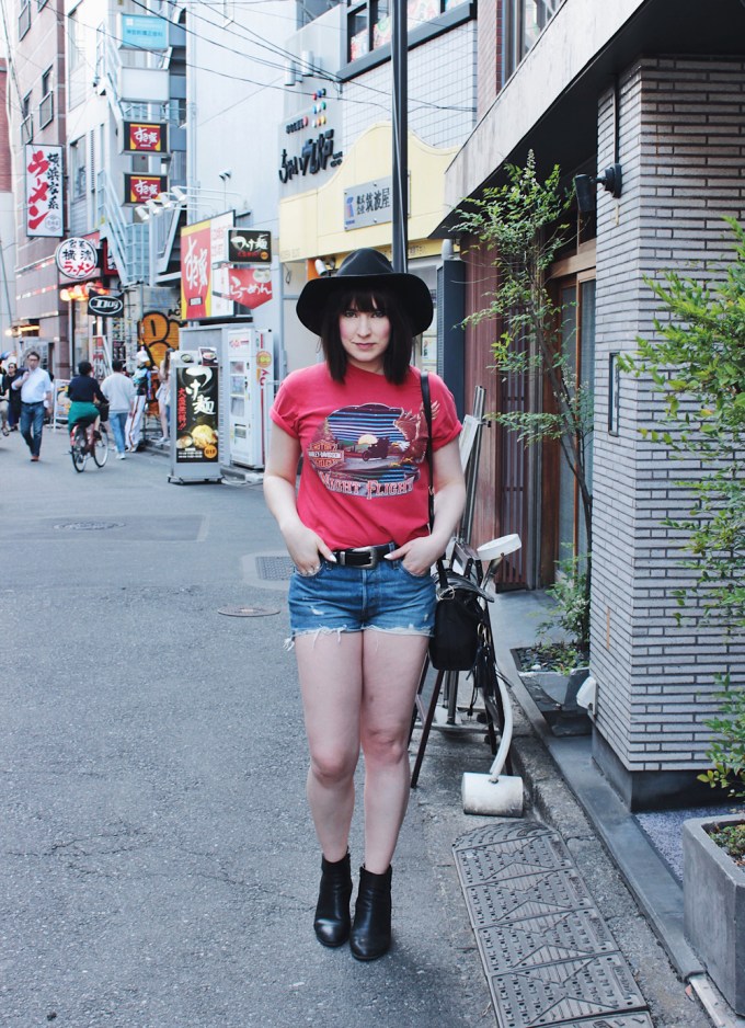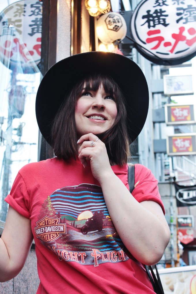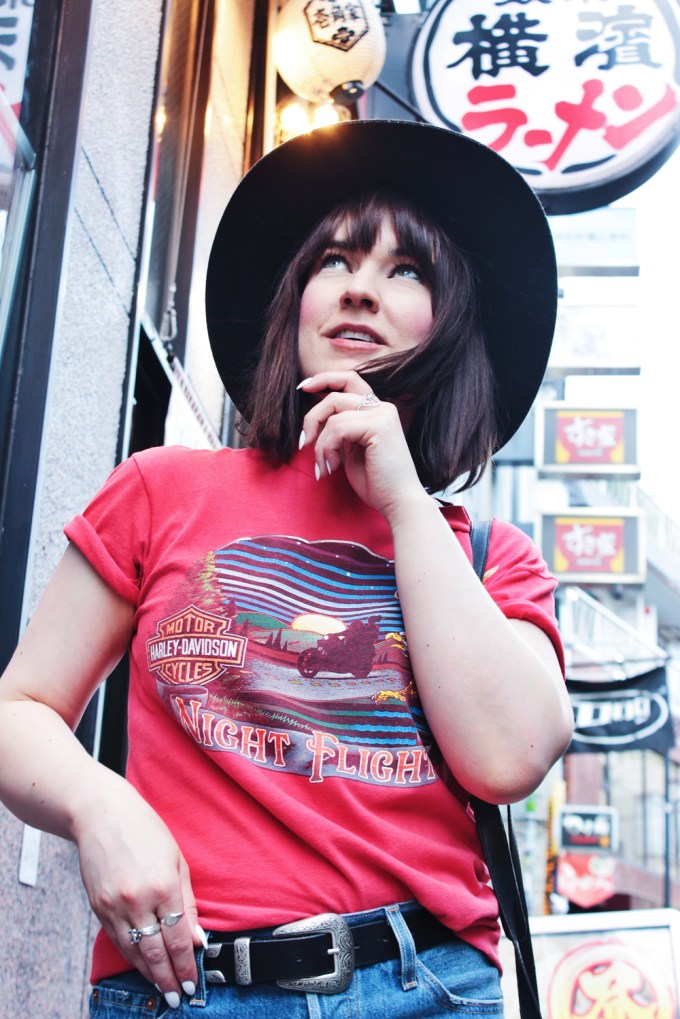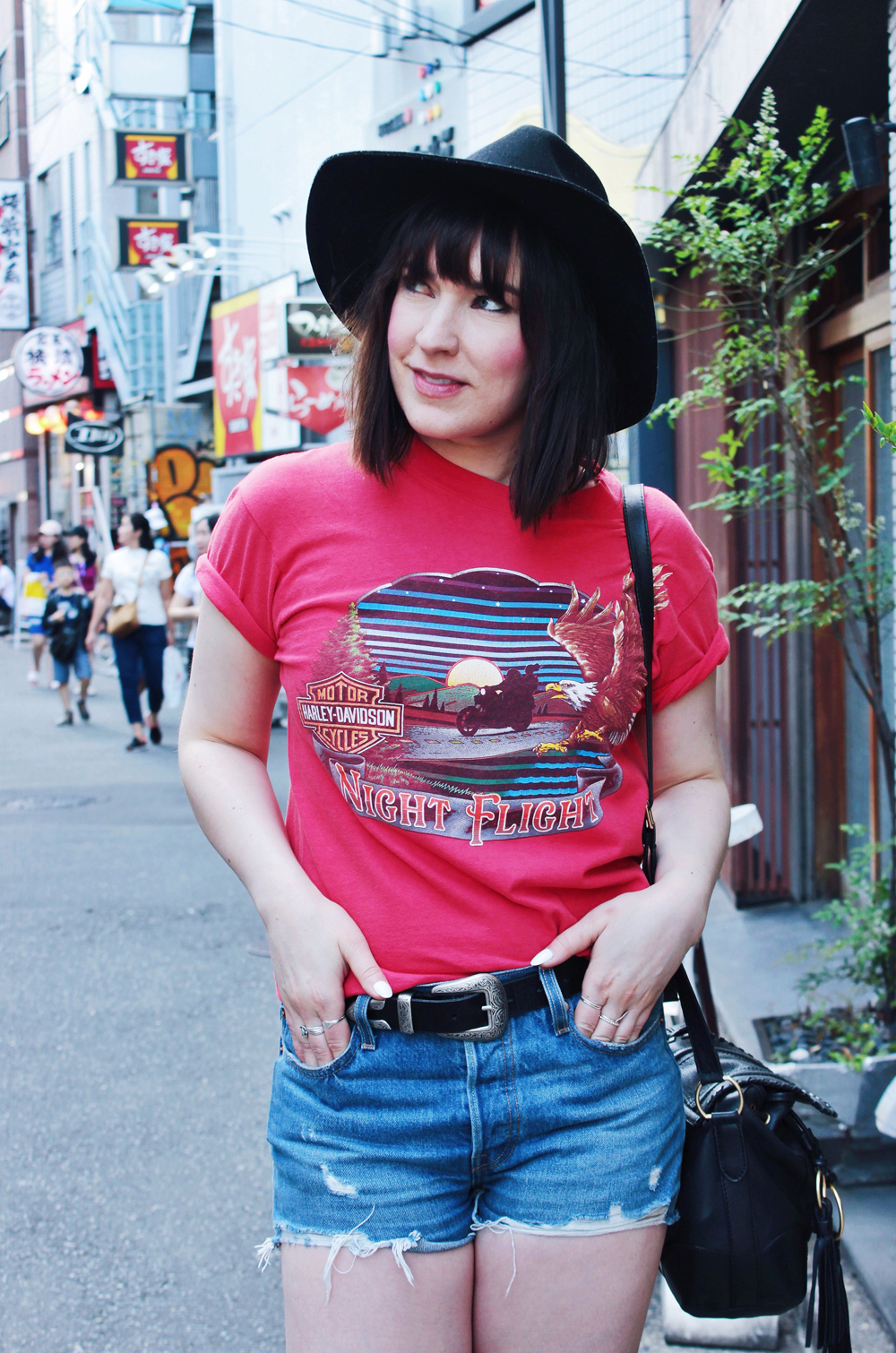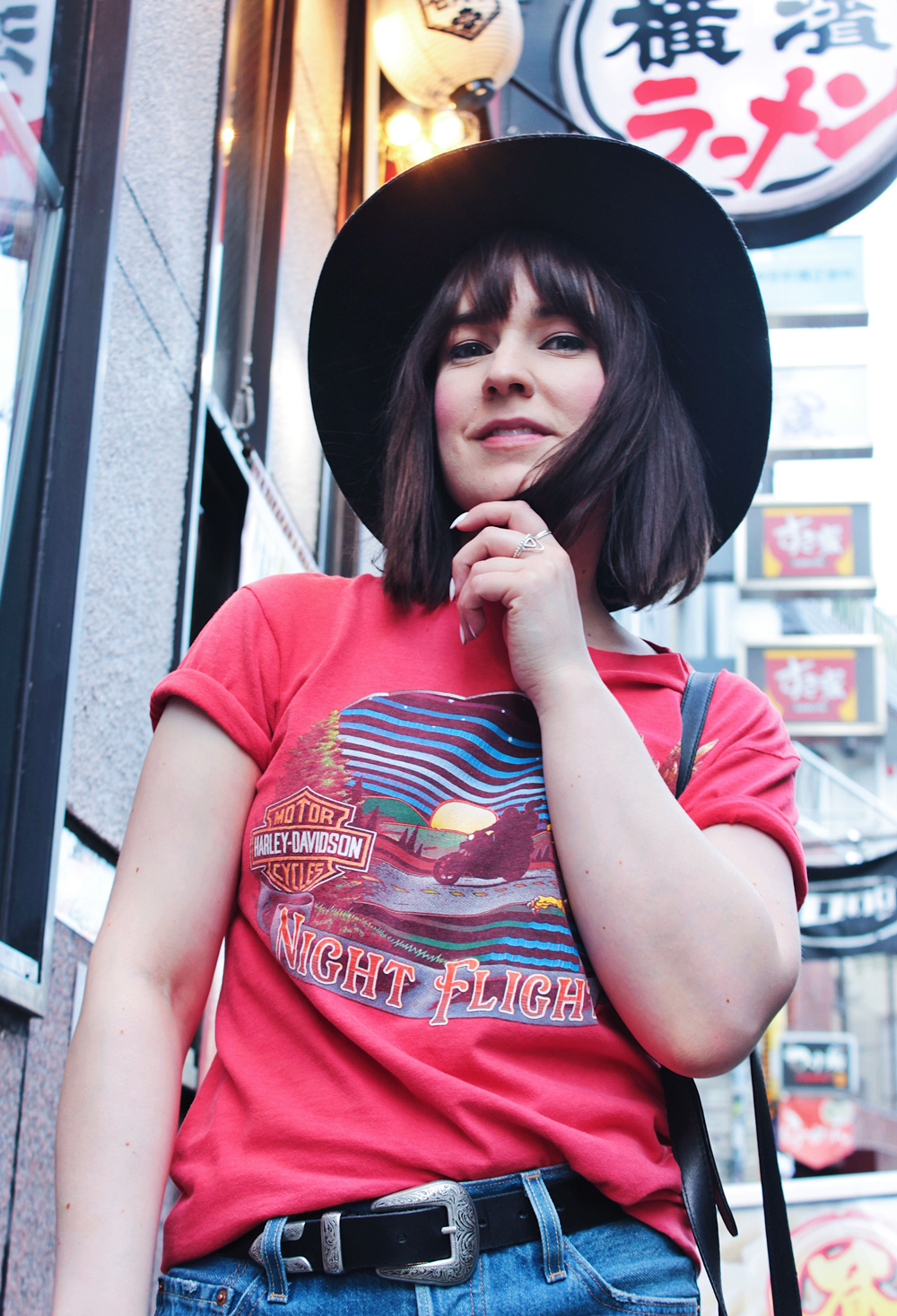 This is the second post from my trip to Japan. I had a really awesome time, and one of my favourite parts of the trip was all the delicious food! While we were staying in Harajuku we checked out a cafe called Reissue, that’s famous for their latte art. You show them a picture and they do the rest, needless to say I was very excited with the way my drink turned out! This is one of the outfits I wore during the trip, I found this vintage Harley shirt at a store in the Shimo-Kitazawa district.