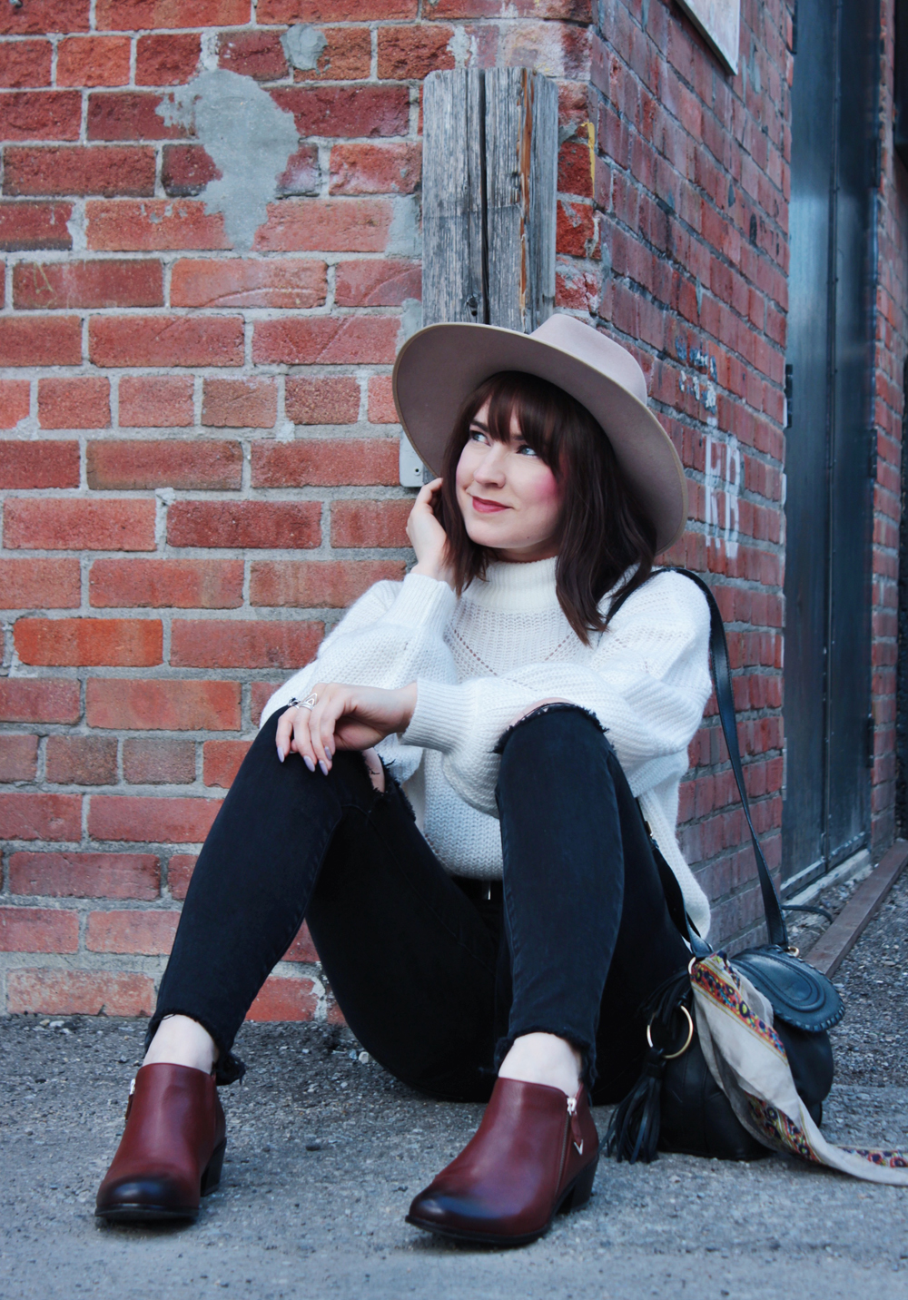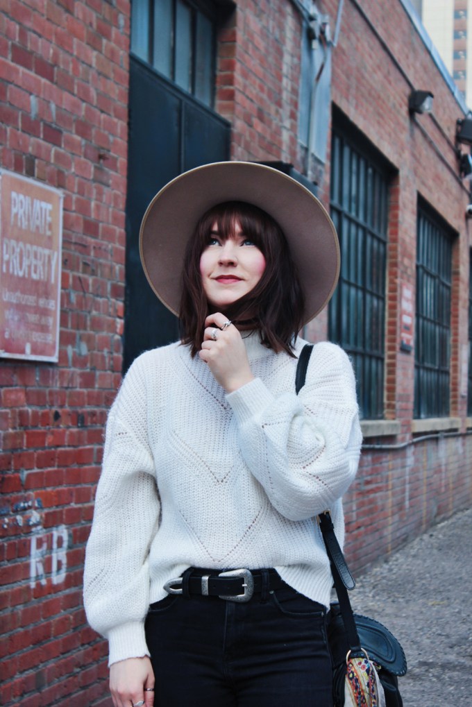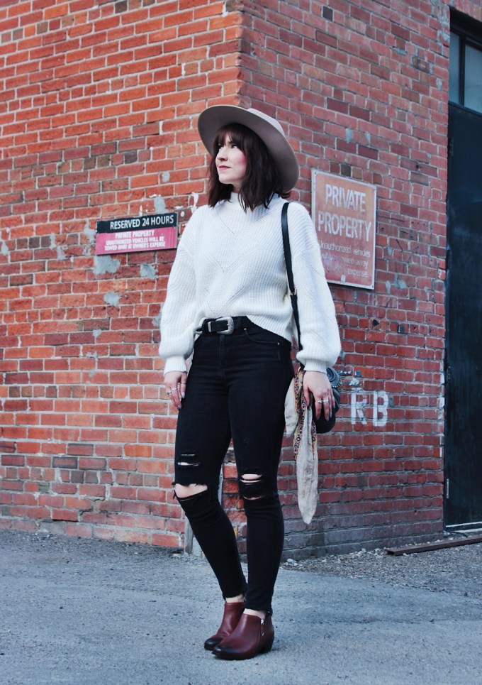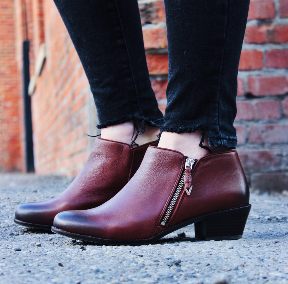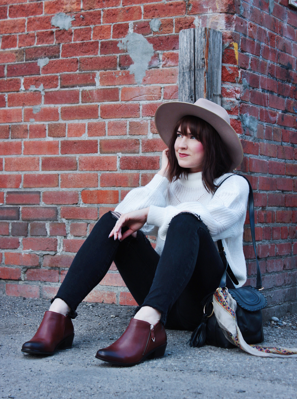 Now that the weather is really starting to cool off, i’ve been pulling all of my sweaters out of storage, and dusting off my warm booties. This sweater is a new addition to my wardrobe, and one of my current favourites! I do in fact love most items of the knit, and mock neck variety. This outfit on it’s own is pretty standard, so I tried to choose a few accessories that added a bit of life to it. I don’t own very many colourful bags so I added a scarf to this one, to add a little colour and detail. As for my footwear, I chose these Vionic booties, I think their rich reddish brown colour compliments the rest of the look really well!