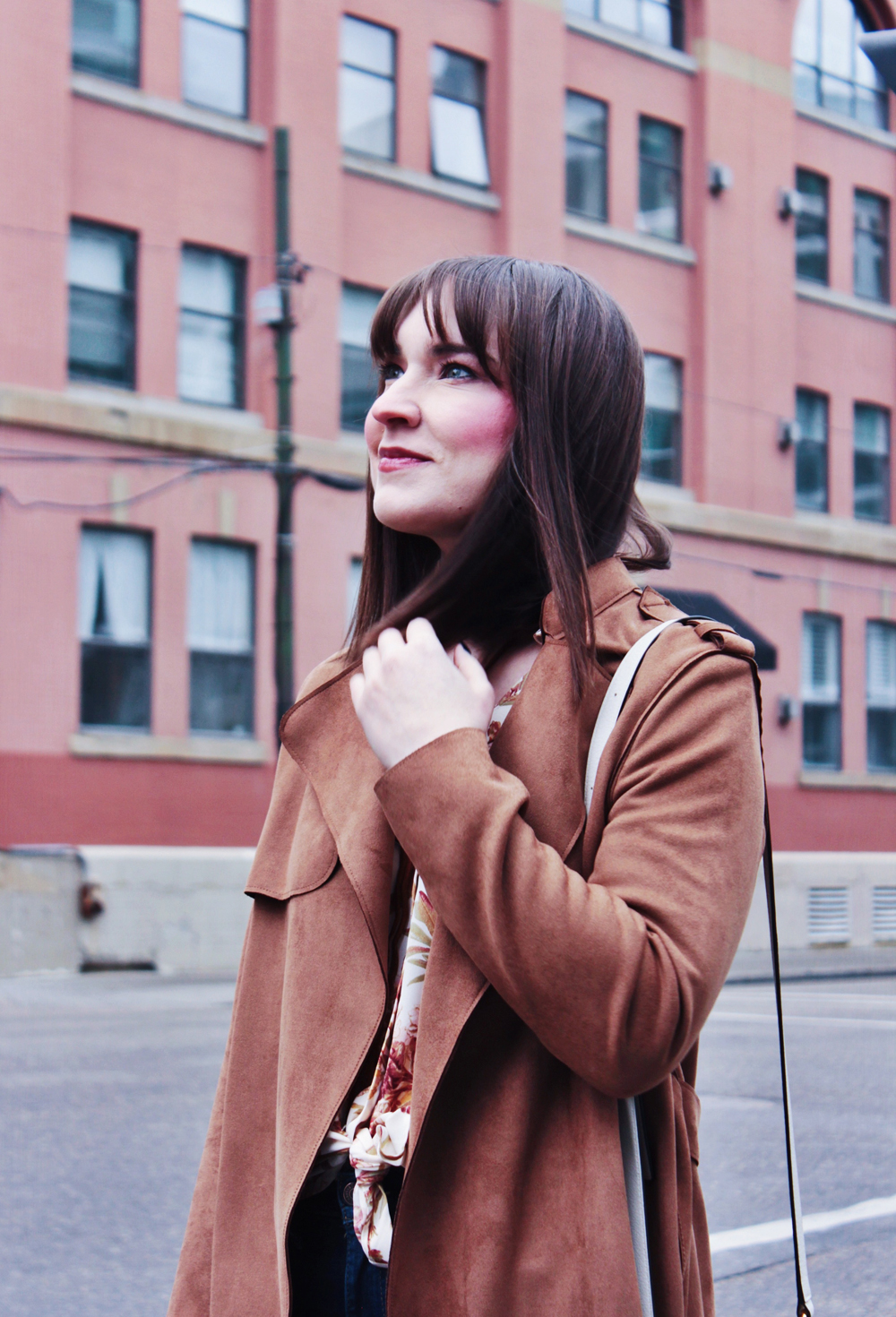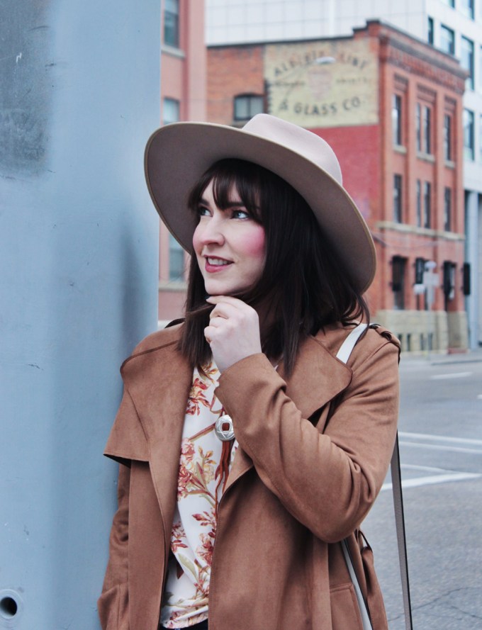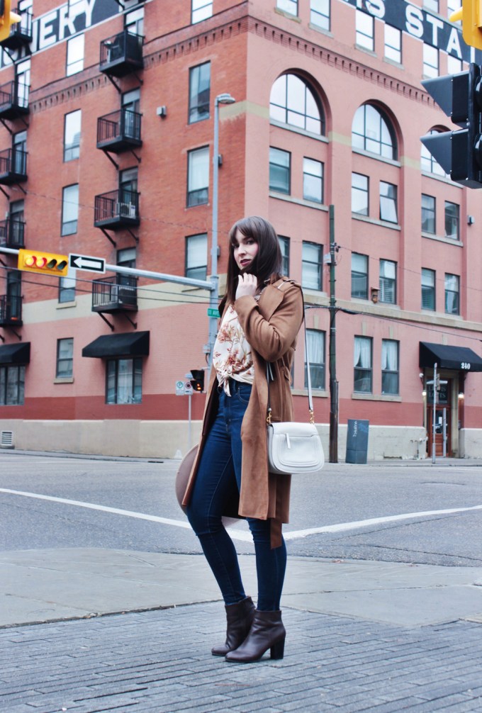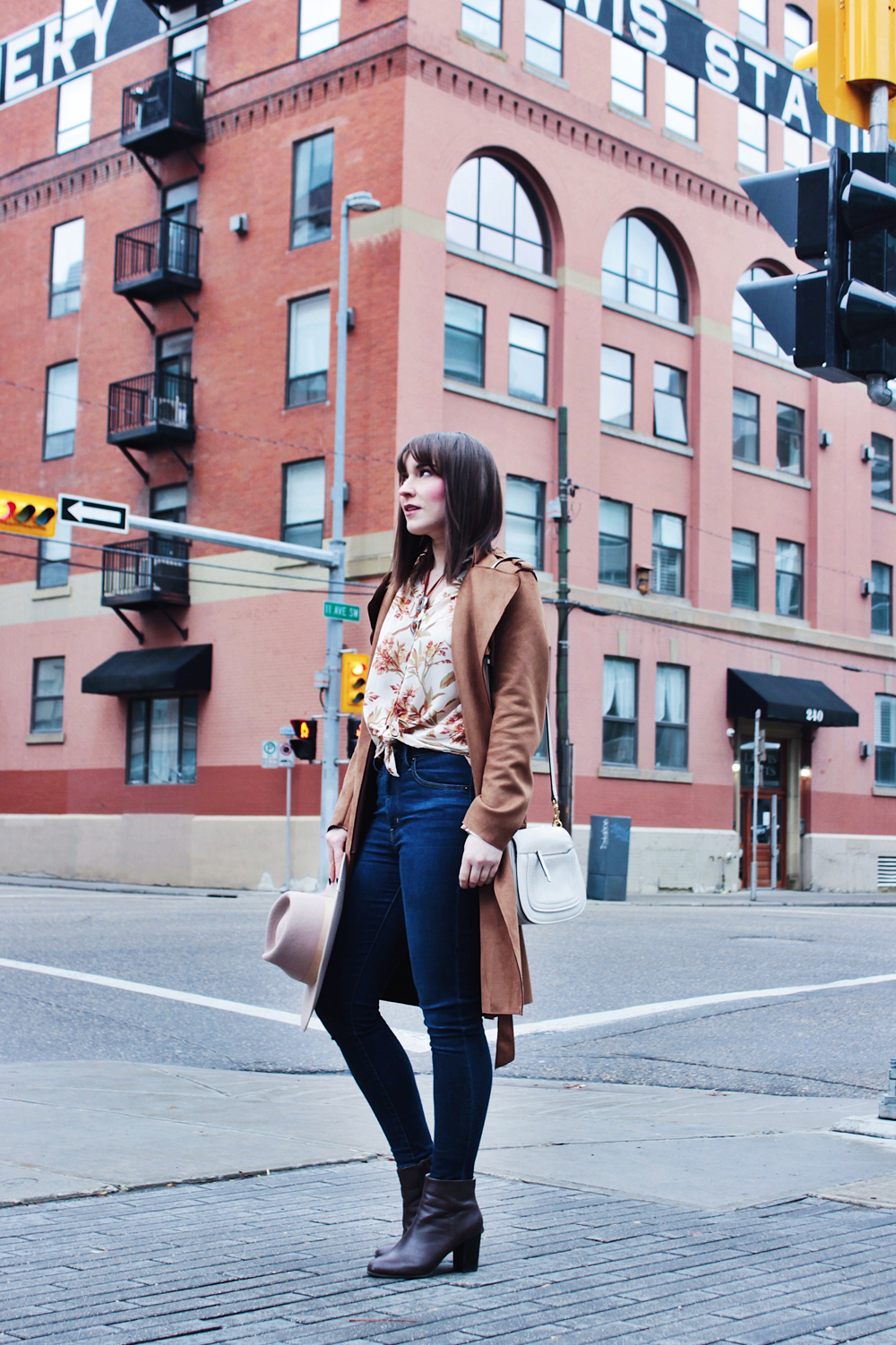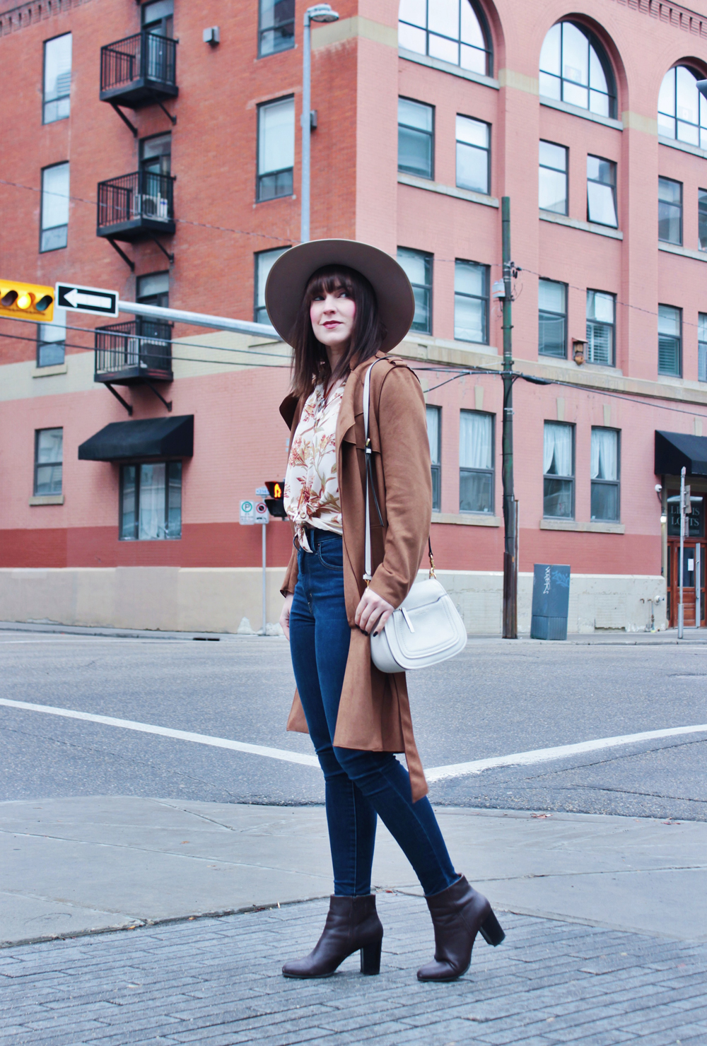 This faux suede trench coat from H&M is something that my wardrobe was desperately missing, and I didn’t even realize it until I had it. Most of my fall and summer coats are cropped, so it’s nice to add a bit more variety. For this look I wanted to keep the colour palette light and warm. I chose this floral button down, that’s also from H&M, and one of my favourite wide brim hats, because the colours all blend perfectly together. As for the other accessories, I added these chocolate brown booties from Vionic, and my favourite Marc Jacobs bag.