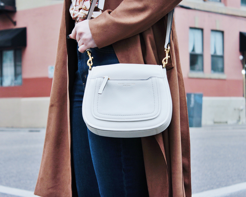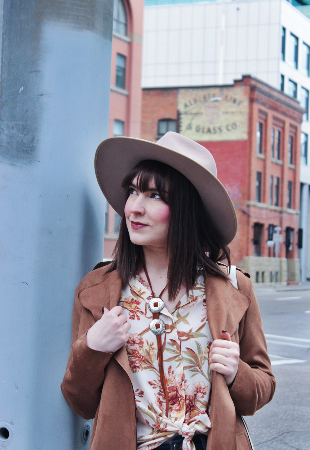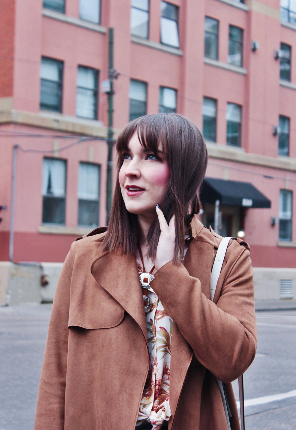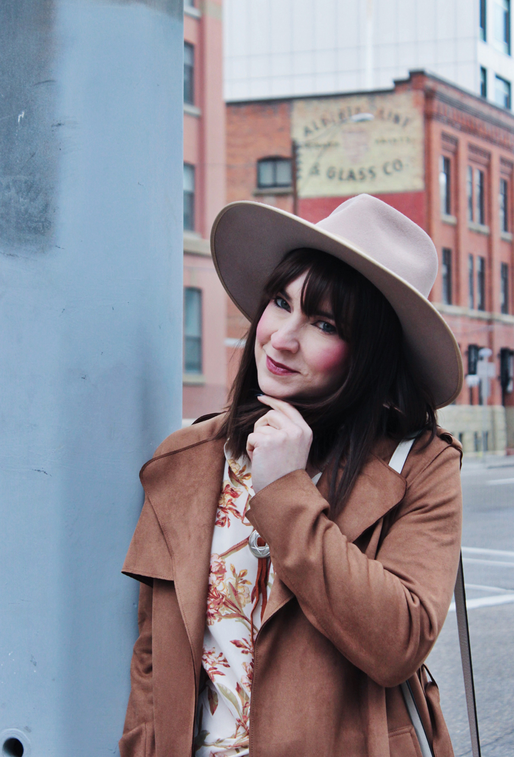 This faux suede trench coat from H&M is something that my wardrobe was desperately missing, and I didn’t even realize it until I had it. Most of my fall and summer coats are cropped, so it’s nice to add a bit more variety. For this look I wanted to keep the colour palette light and warm. I chose this floral button down, that’s also from H&M, and one of my favourite wide brim hats, because the colours all blend perfectly together. As for the other accessories, I added these chocolate brown booties from Vionic, and my favourite Marc Jacobs bag.
