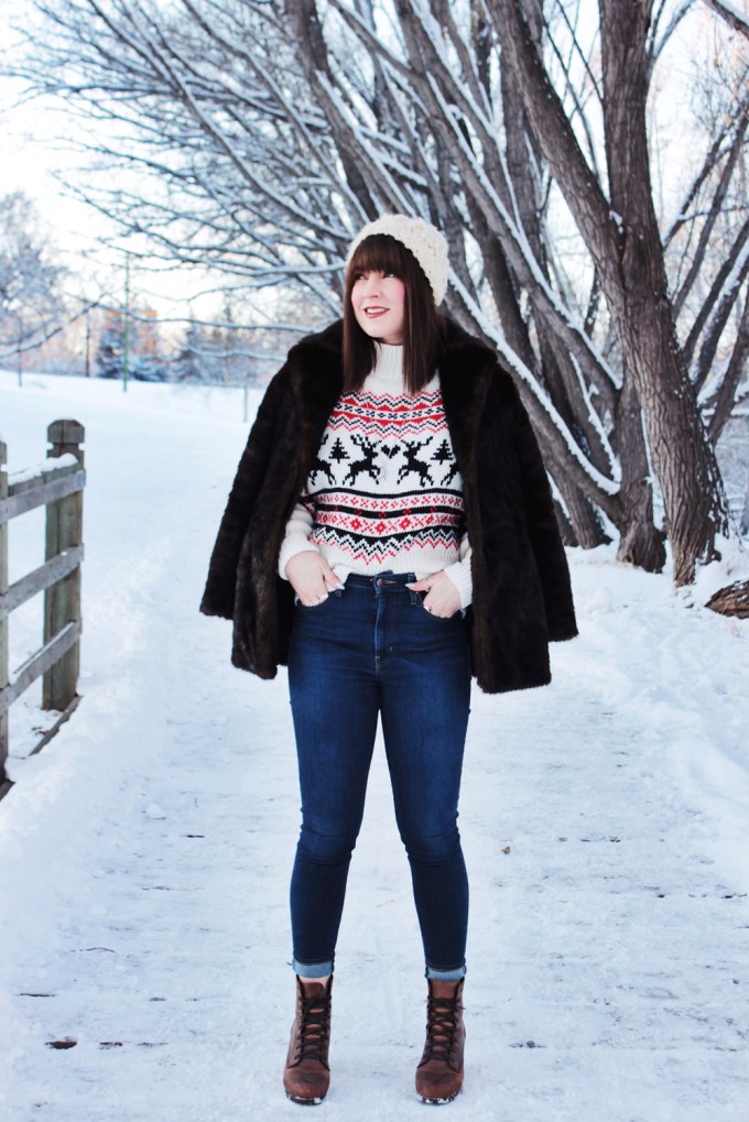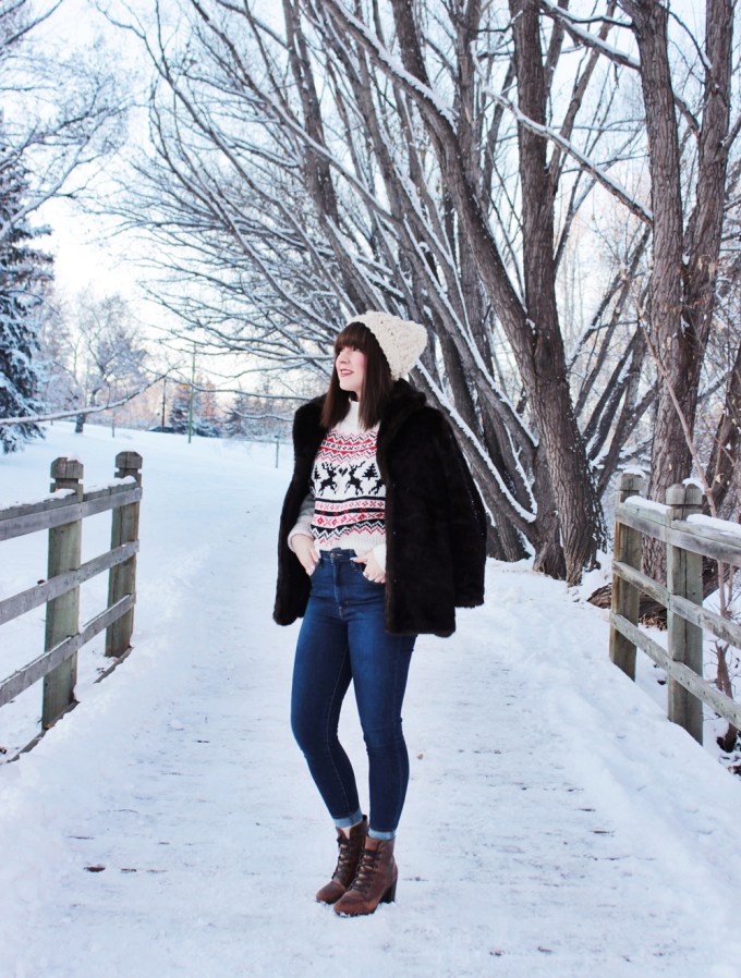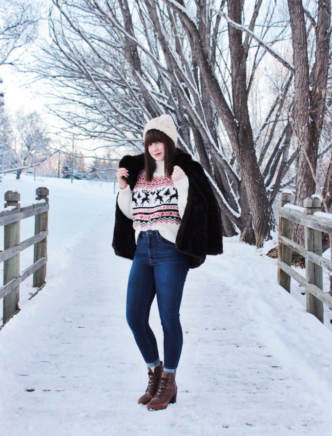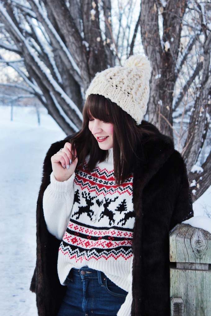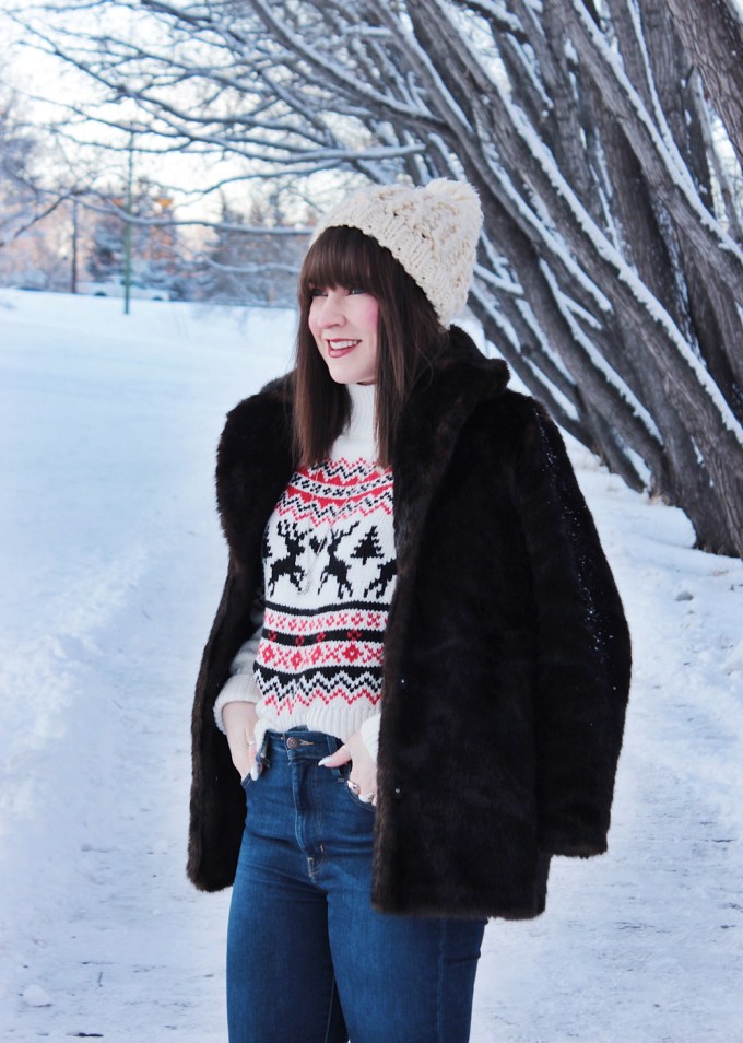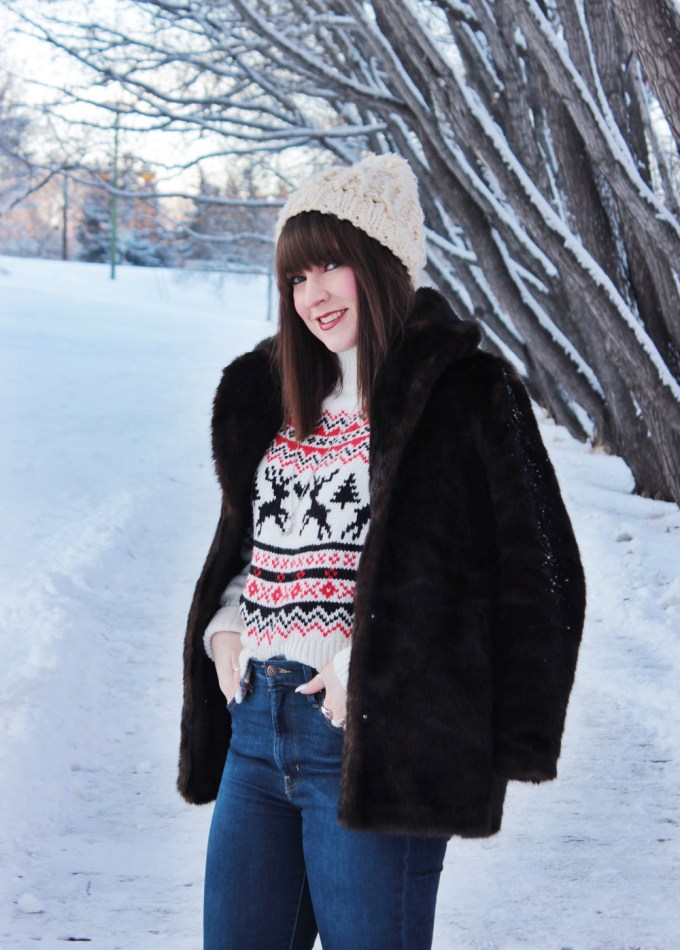 This year i’m getting into the Christmas spirit with a new Christmas sweater from H&M. It’s got a great fit and an adorable pattern, so I figured it was a good addition to my current rotation of sweaters. I also added one of my favourite faux fur coats to add a little extra something to this look! Merry Christmas everyone!
