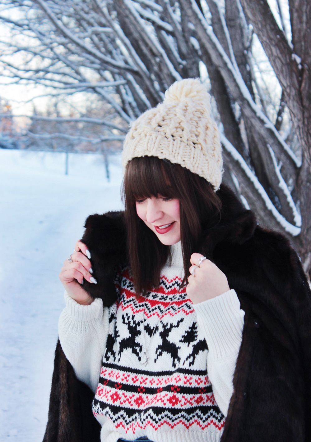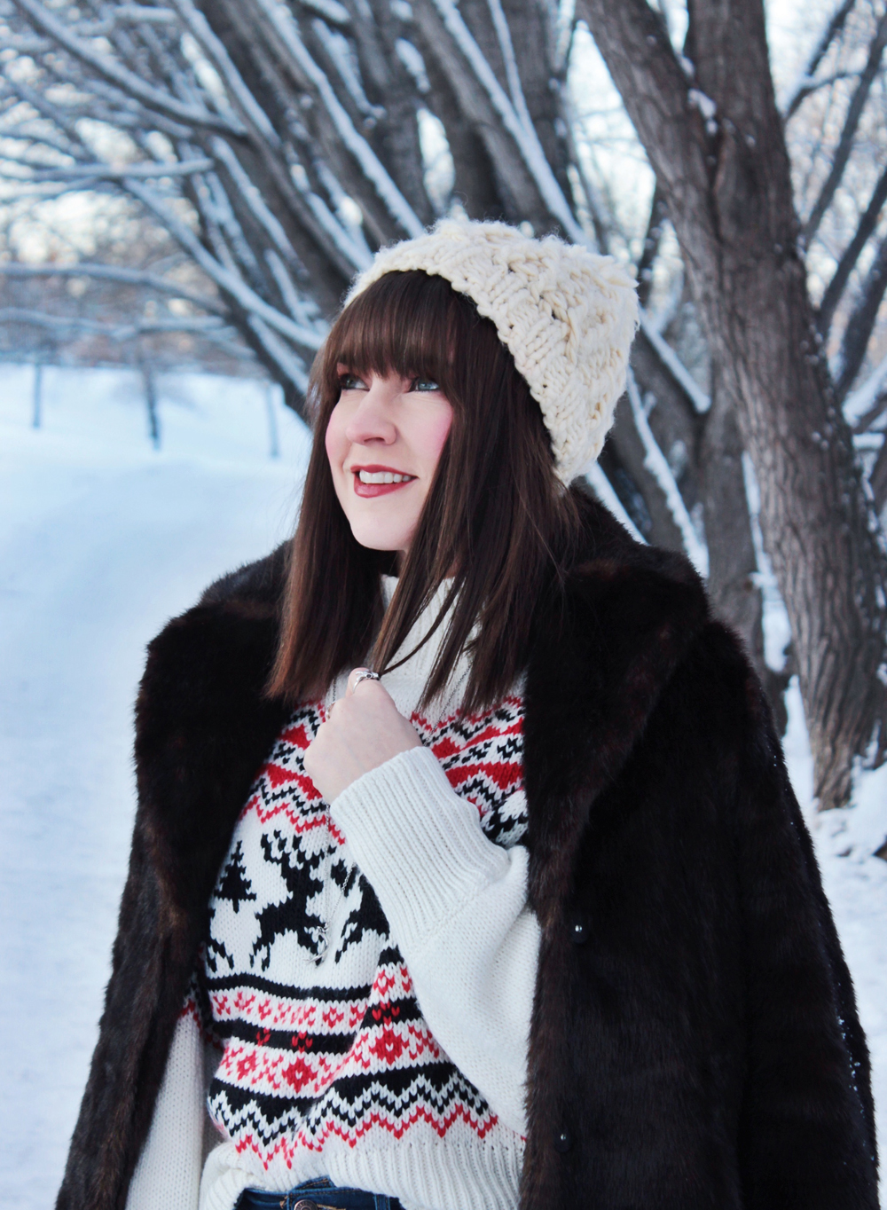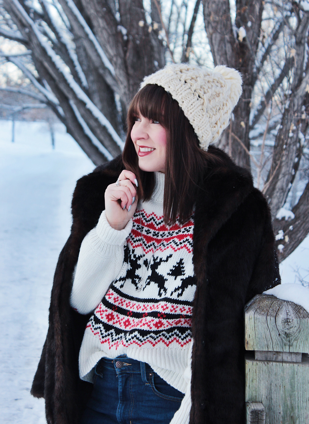 This year i’m getting into the Christmas spirit with a new Christmas sweater from H&M. It’s got a great fit and an adorable pattern, so I figured it was a good addition to my current rotation of sweaters. I also added one of my favourite faux fur coats to add a little extra something to this look! Merry Christmas everyone!