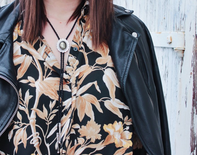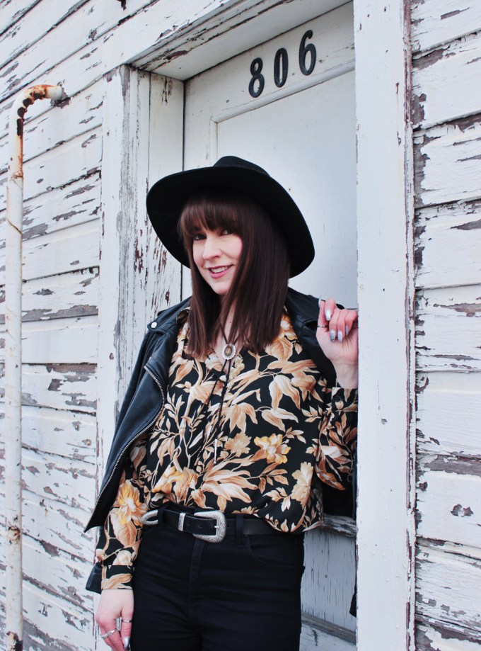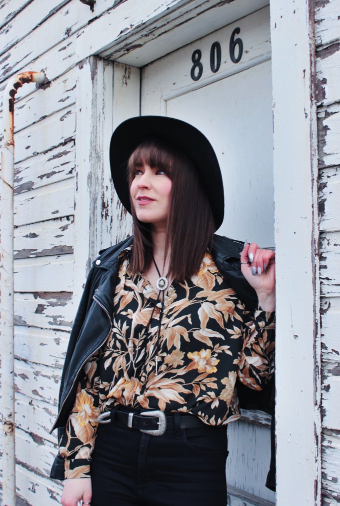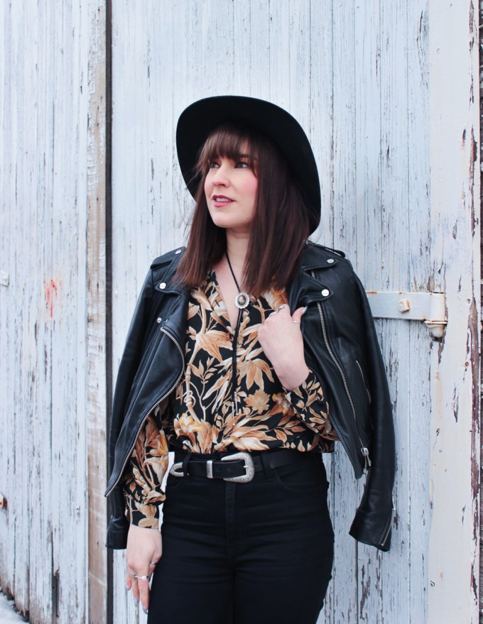 This has been one of my go to looks lately, it’s perfect for an evening out, or a dinner date. I’ve always been a big fan of bold patterns, so this dark floral top from H&M has been getting a lot of wear as of late. I paired the top with my favourite pair of black high-waisted skinny jeans, and added a western belt, and bolo tie to finish off the look. I chose the leather jacket for one of the warmer days we’ve had this month, but it could be easily swapped out for a faux fur, or wool coat if the weather called for something a little warmer!