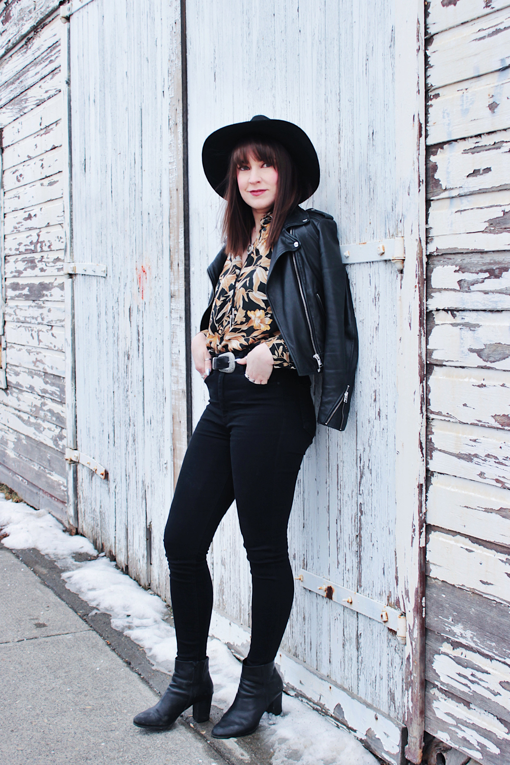This has been one of my go to looks lately, it’s perfect for an evening out, or a dinner date. I’ve always been a big fan of bold patterns, so this dark floral top from H&M has been getting a lot of wear as of late. I paired the top with my favourite pair of black high-waisted skinny jeans, and added a western belt, and bolo tie to finish off the look. I chose the leather jacket for one of the warmer days we’ve had this month, but it could be easily swapped out for a faux fur, or wool coat if the weather called for something a little warmer!