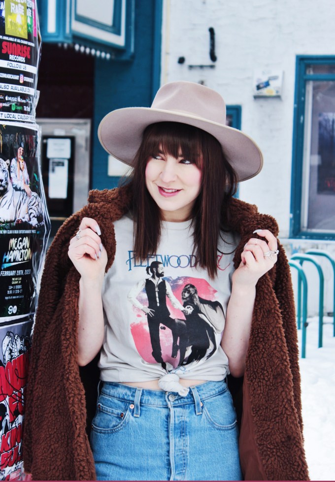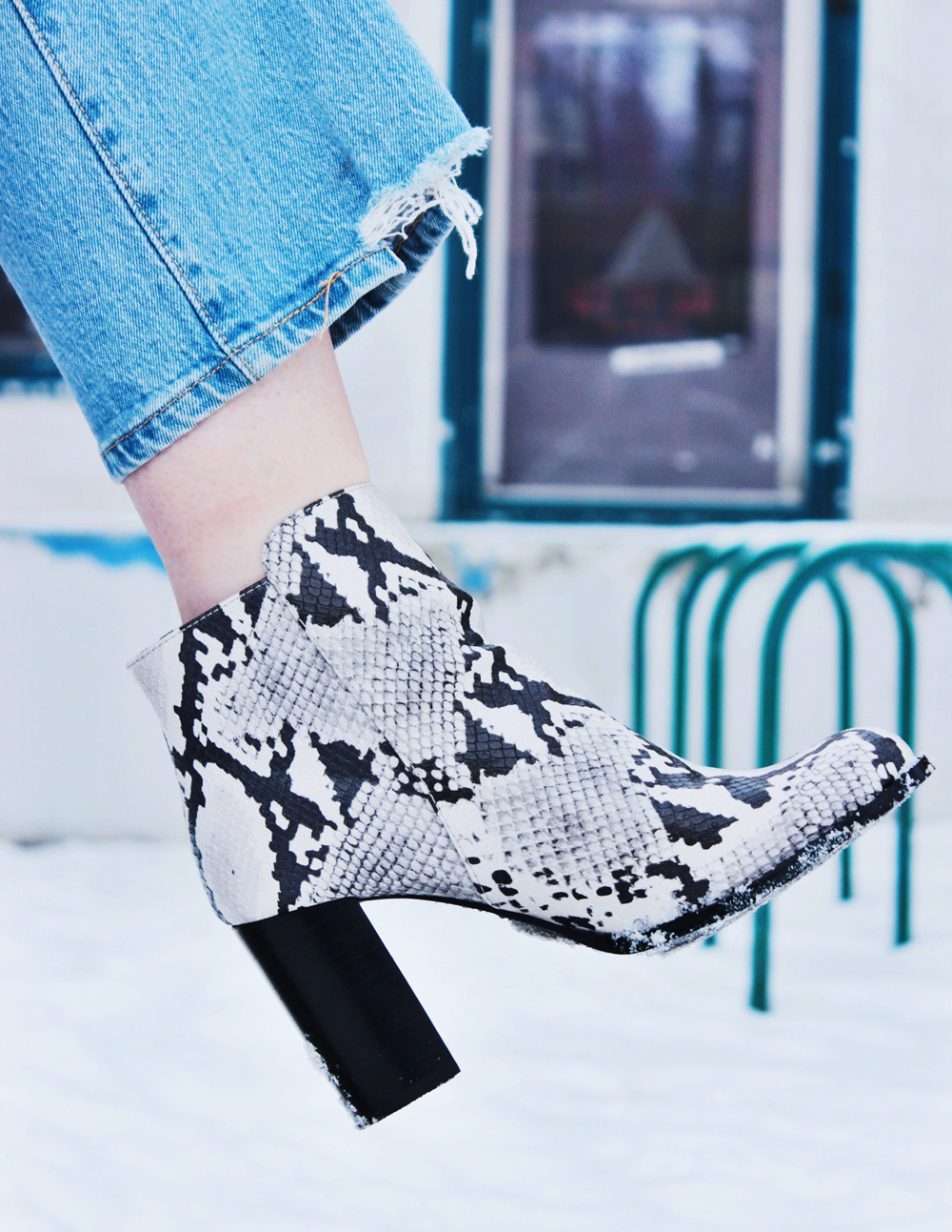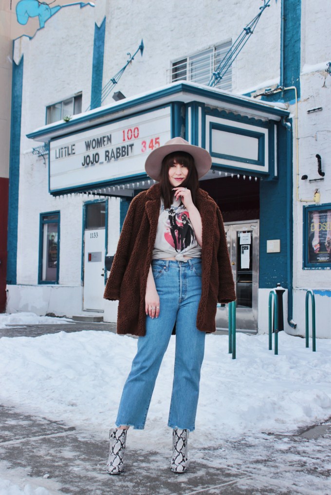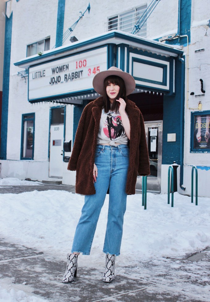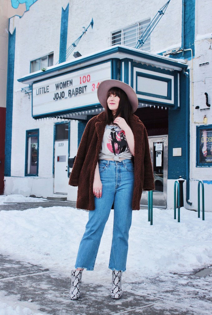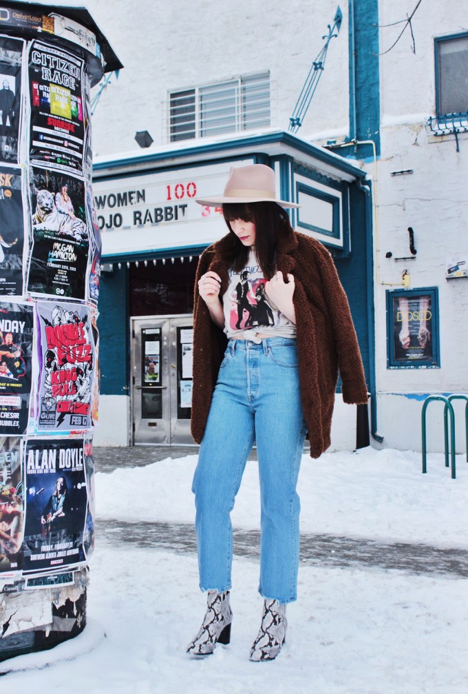 It’s been a while since i’ve worn anything other than skinny jeans, so these ribcage straight leg jeans are a nice change from my usual denim. I was hesitant to try this style at first, but now that i’ve found a few different ways to wear them i’m obsessed! For this look I wanted to keep things pretty casual, I chose this sherpa coat from Simons, and these snake print boots from Aldo to add a touch of detail. I also wore my latest, and current favourite band tee, that I got from the Fleetwood Mac concert last November.