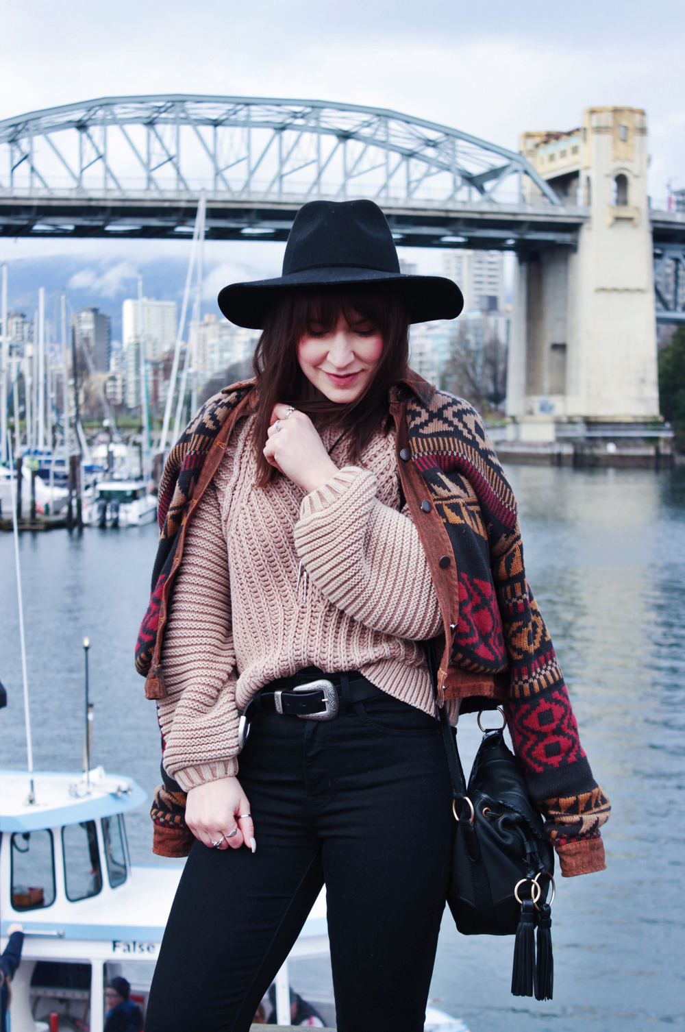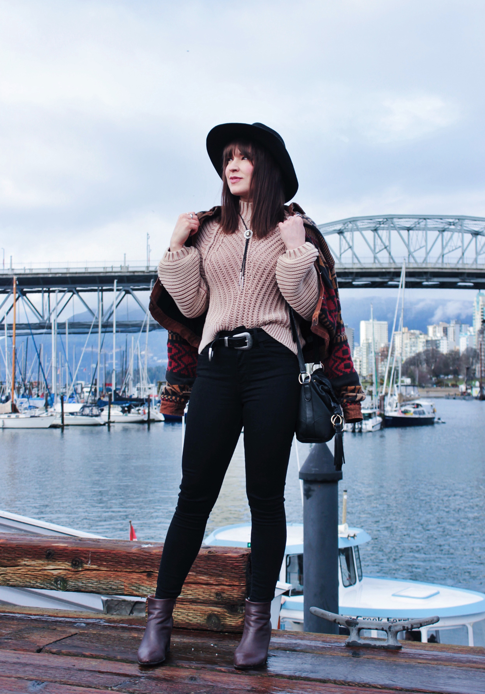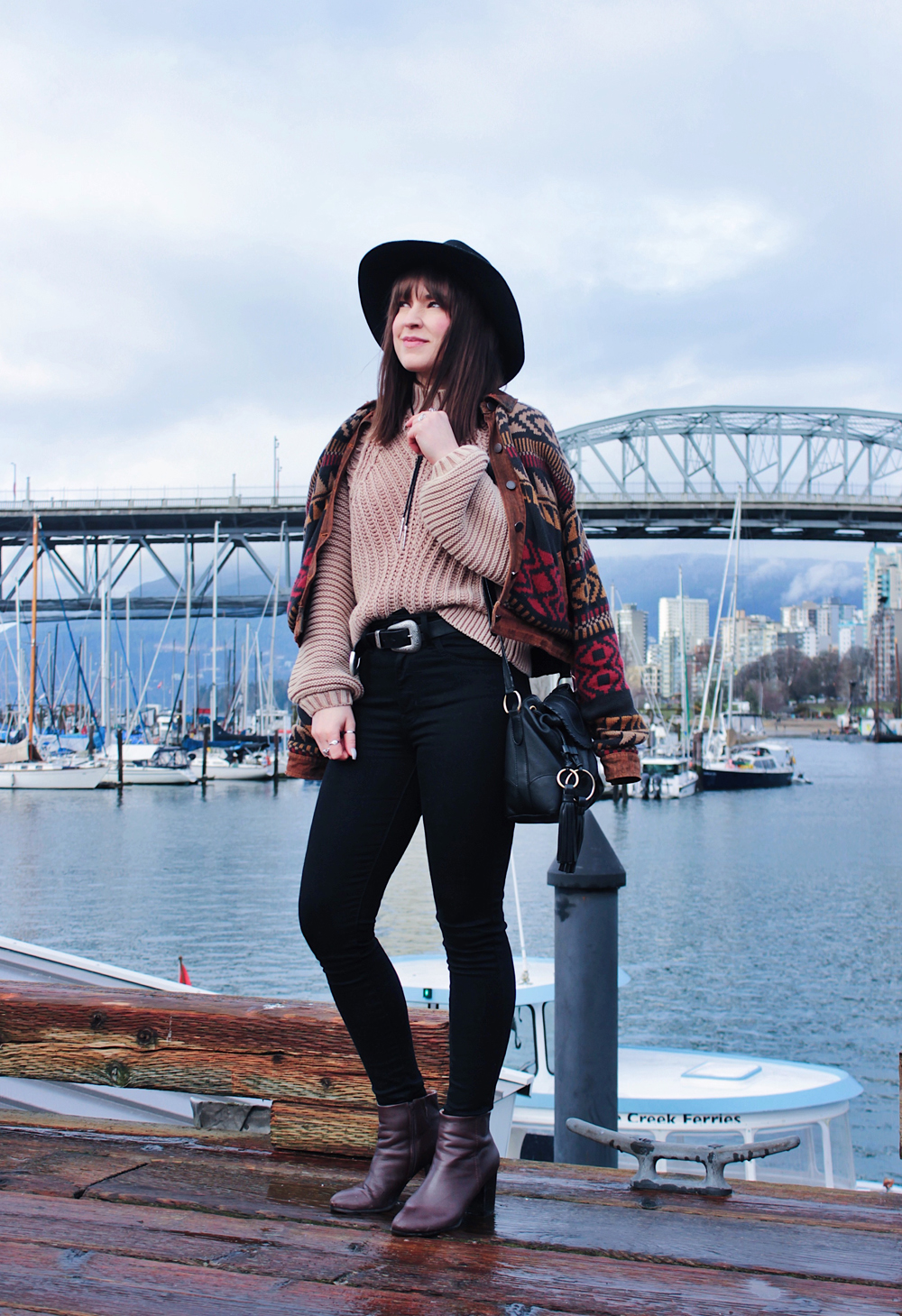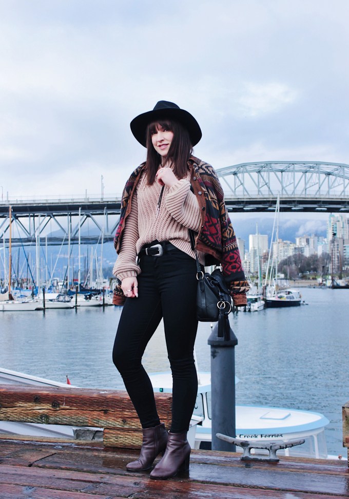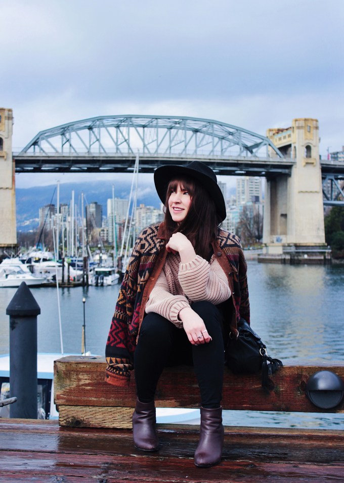 I went to Vancouver recently for a bachelorette party, and was lucky get to get a few photos while I was there. It’s been quite a few years since i’ve been out west, and I kind of forgot how beautiful Vancouver is. There was a bit of rain while we were there, but overall the weather was pretty nice, and significantly warmer than Calgary so I couldn’t complain. On the second last day of the trip we checked out Granville Island, one of my favourite places in Vancouver! The market does not disappoint, and neither do the views! This outfit was perfect for the weather that day, the only thing I could have used was an umbrella, but thankfully my hat helped keep my hair from getting too wet!