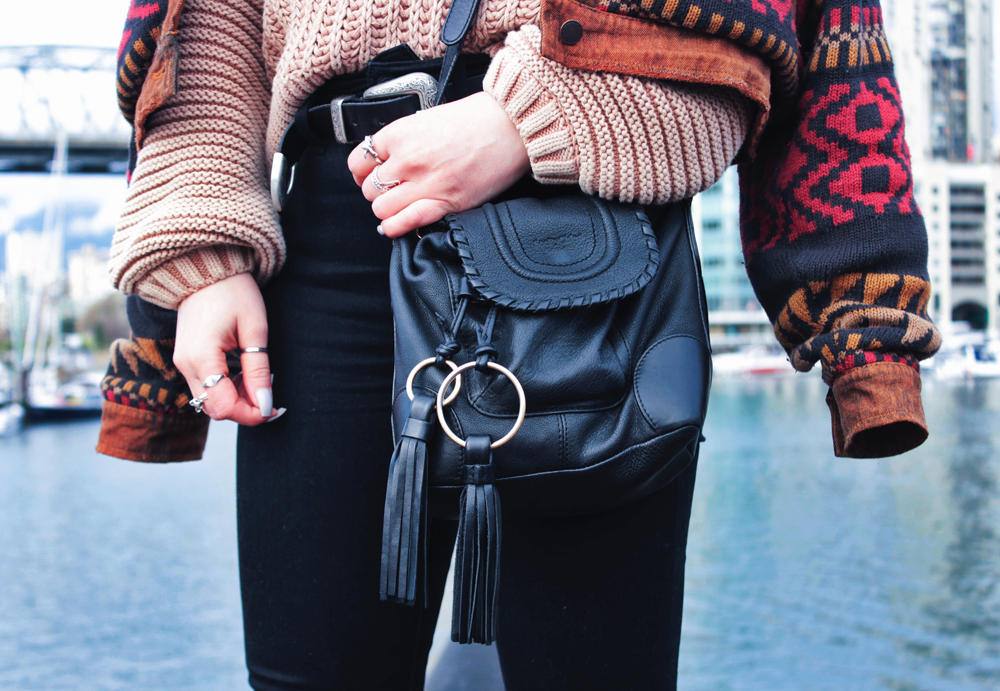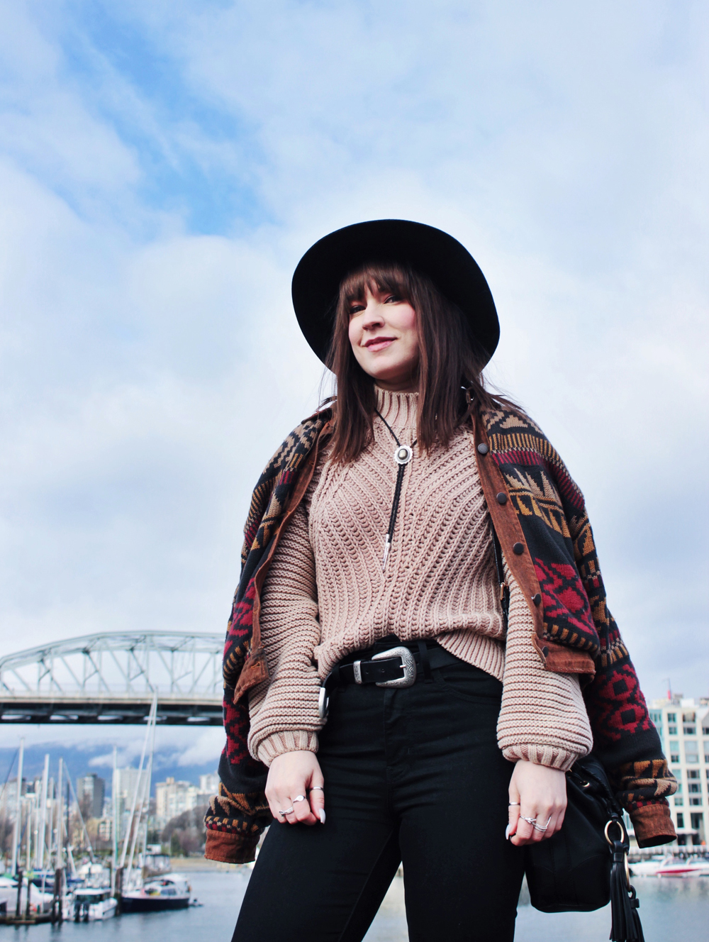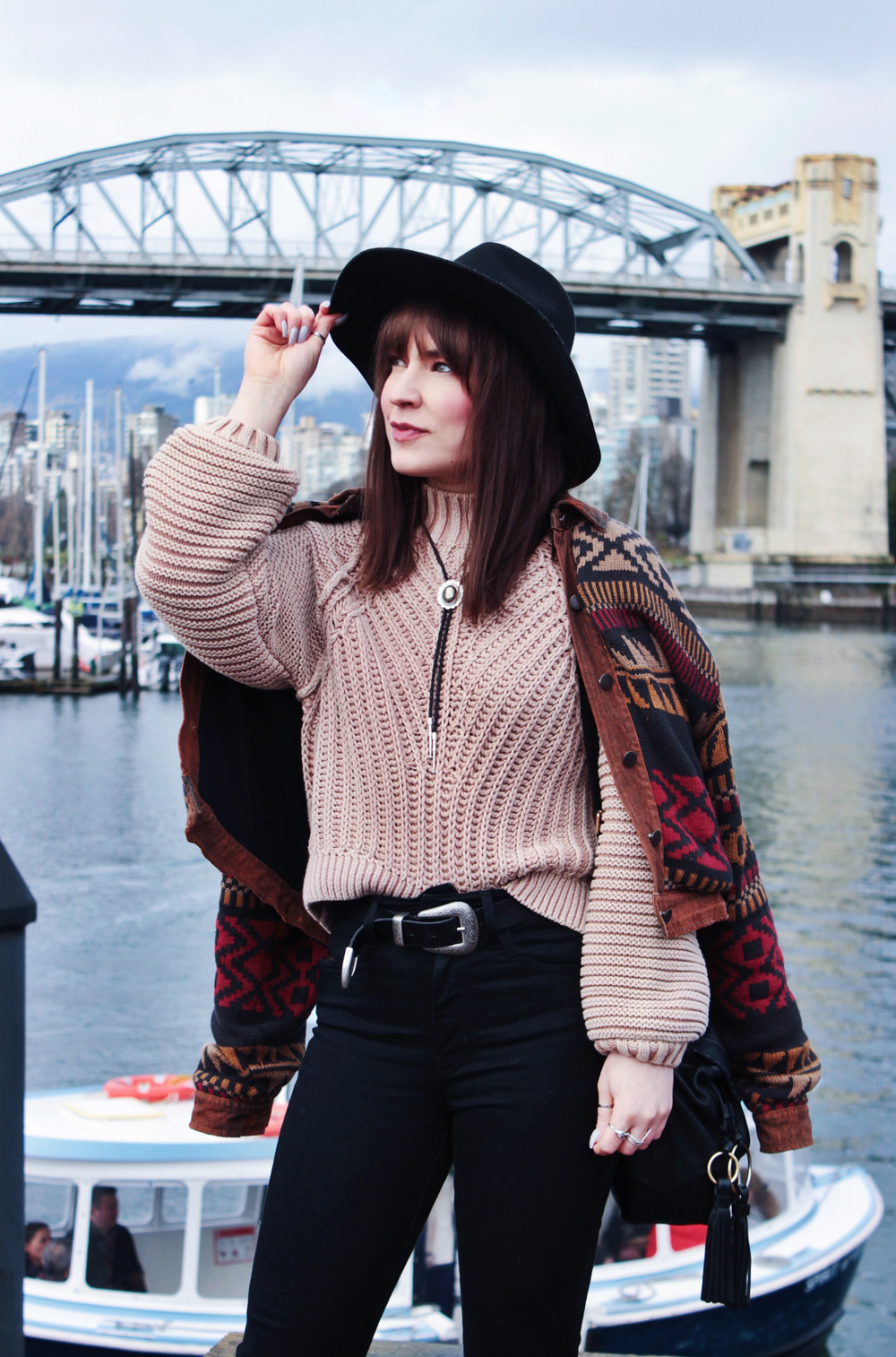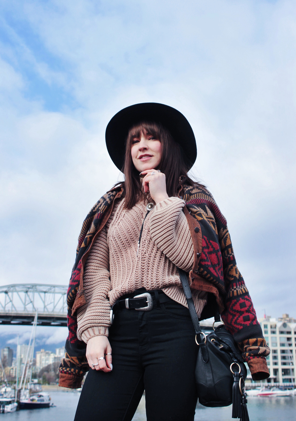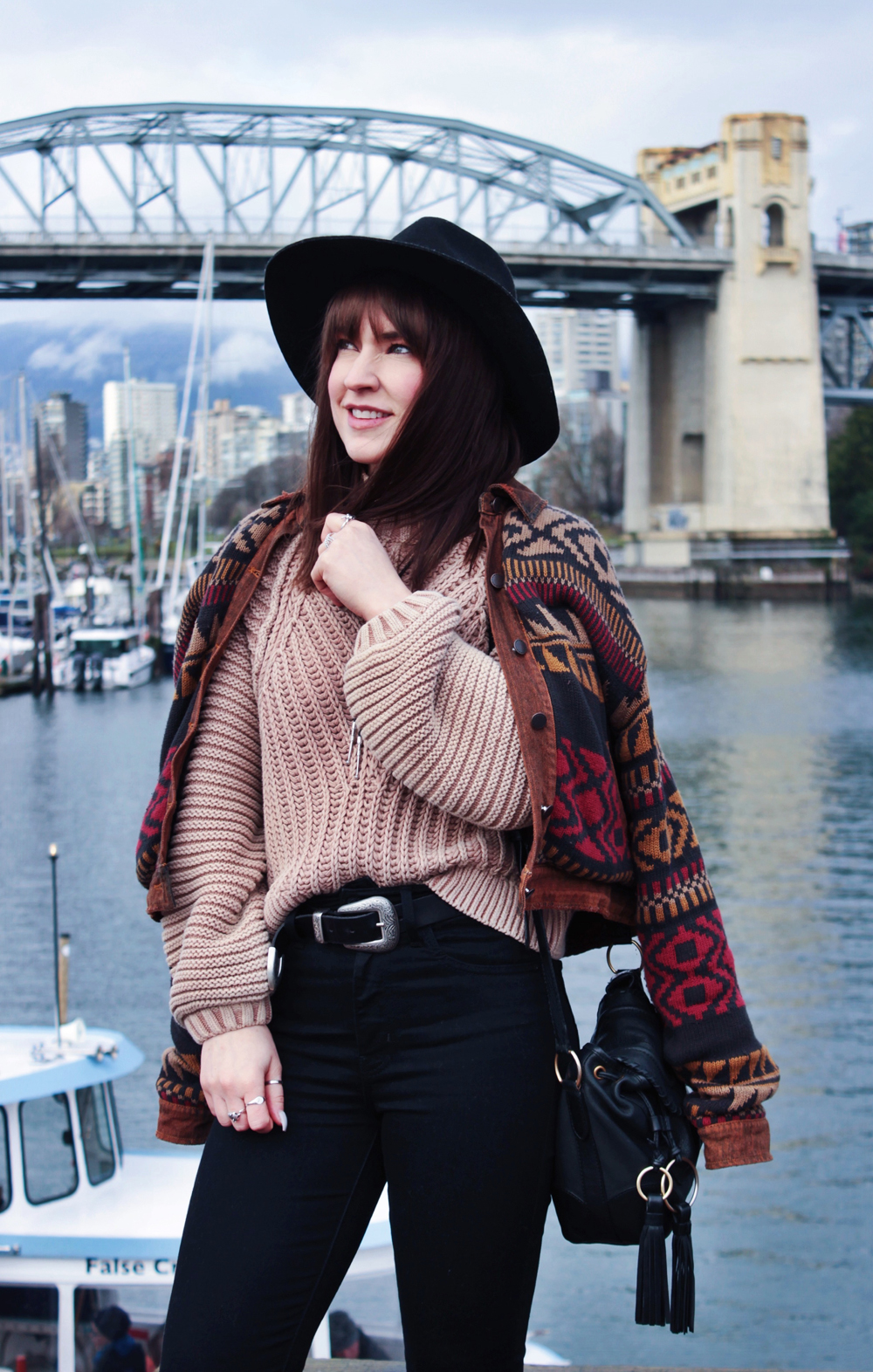 I went to Vancouver recently for a bachelorette party, and was lucky get to get a few photos while I was there. It’s been quite a few years since i’ve been out west, and I kind of forgot how beautiful Vancouver is. There was a bit of rain while we were there, but overall the weather was pretty nice, and significantly warmer than Calgary so I couldn’t complain. On the second last day of the trip we checked out Granville Island, one of my favourite places in Vancouver! The market does not disappoint, and neither do the views! This outfit was perfect for the weather that day, the only thing I could have used was an umbrella, but thankfully my hat helped keep my hair from getting too wet!
