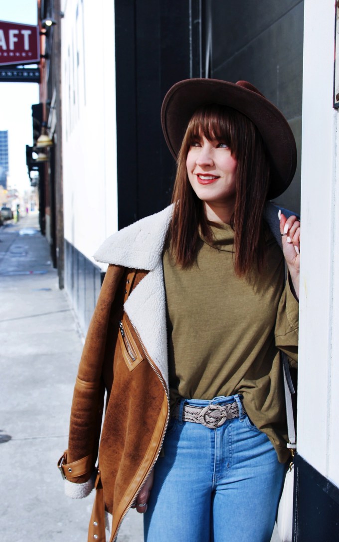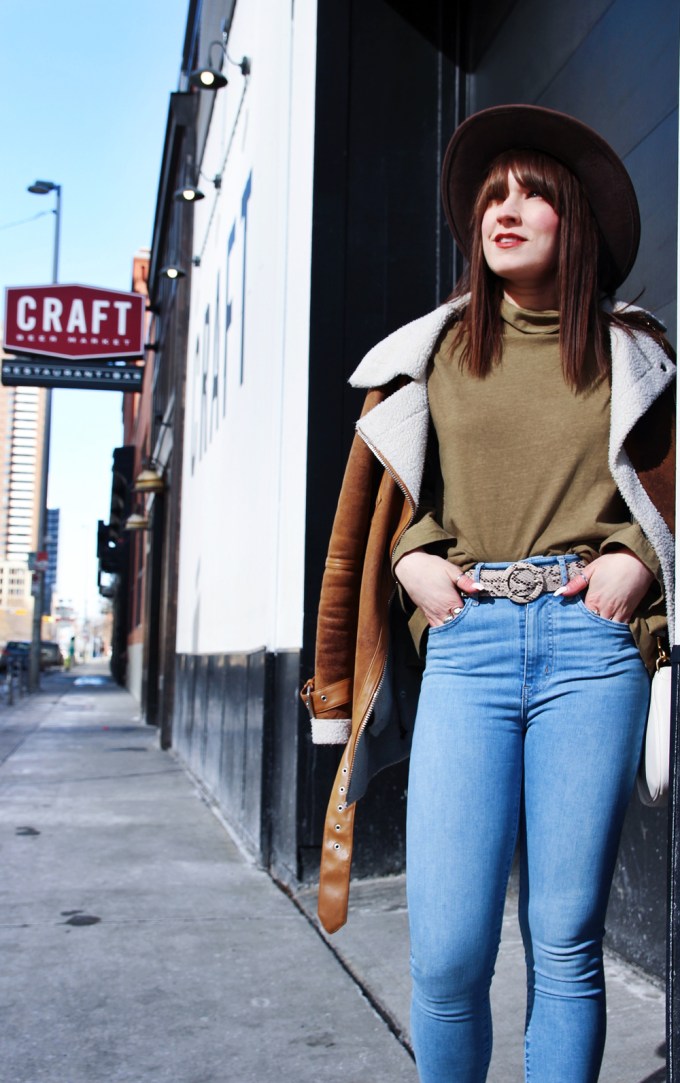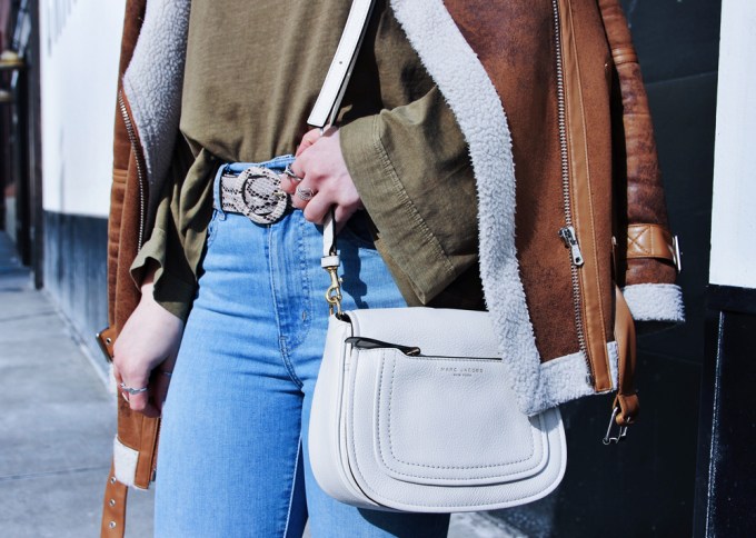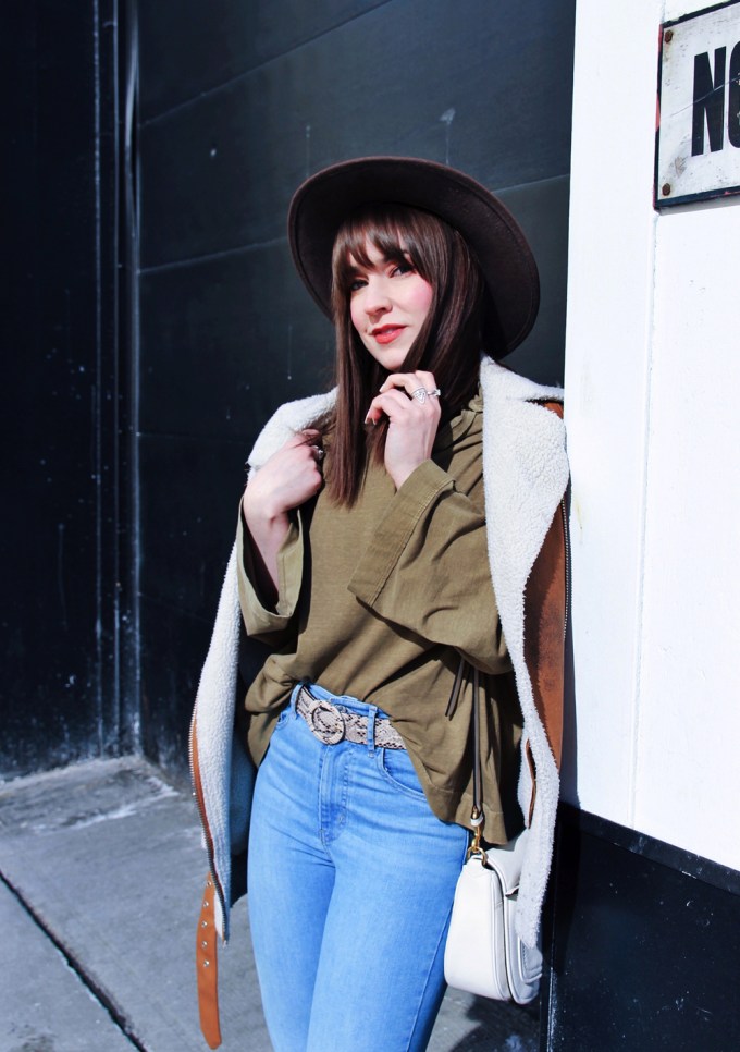 Outfit Details: Coat: Urban Outfitters / Jeans: Levi”s / Top: Free People / Belt: H&M / Hat: Dorfman / Boots: C/O Thursdays / Bag: Marc Jacobs