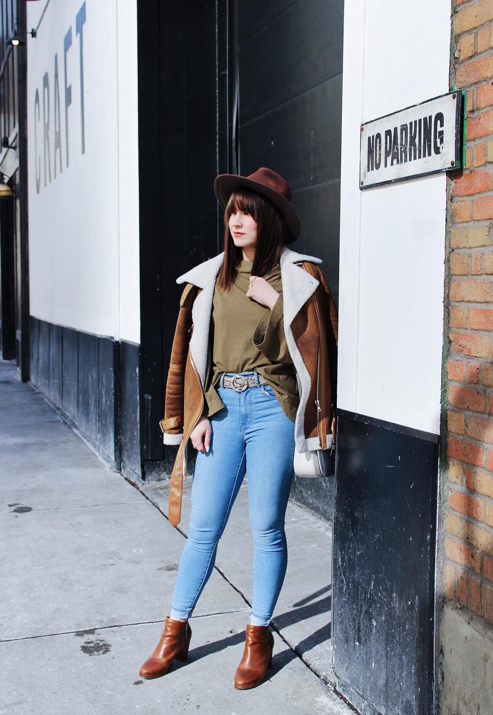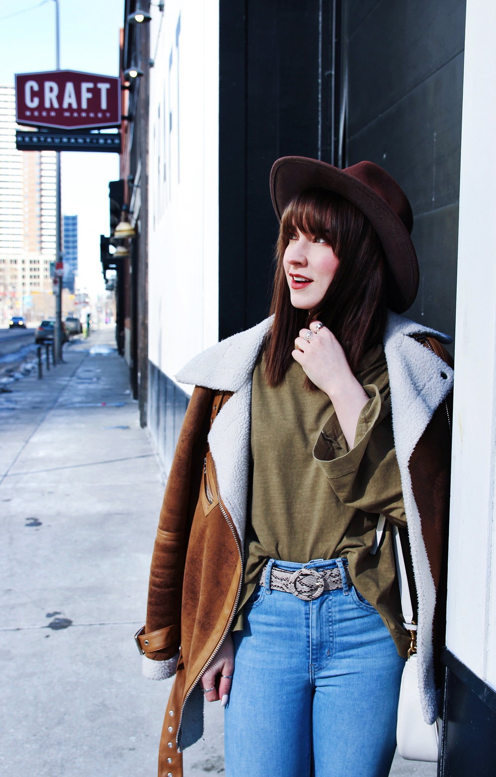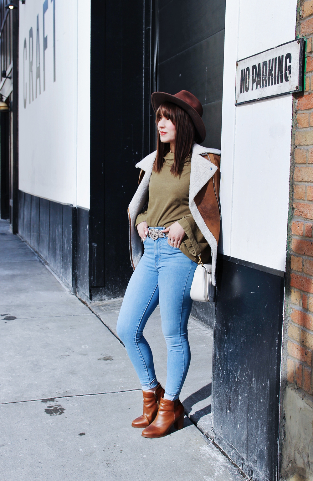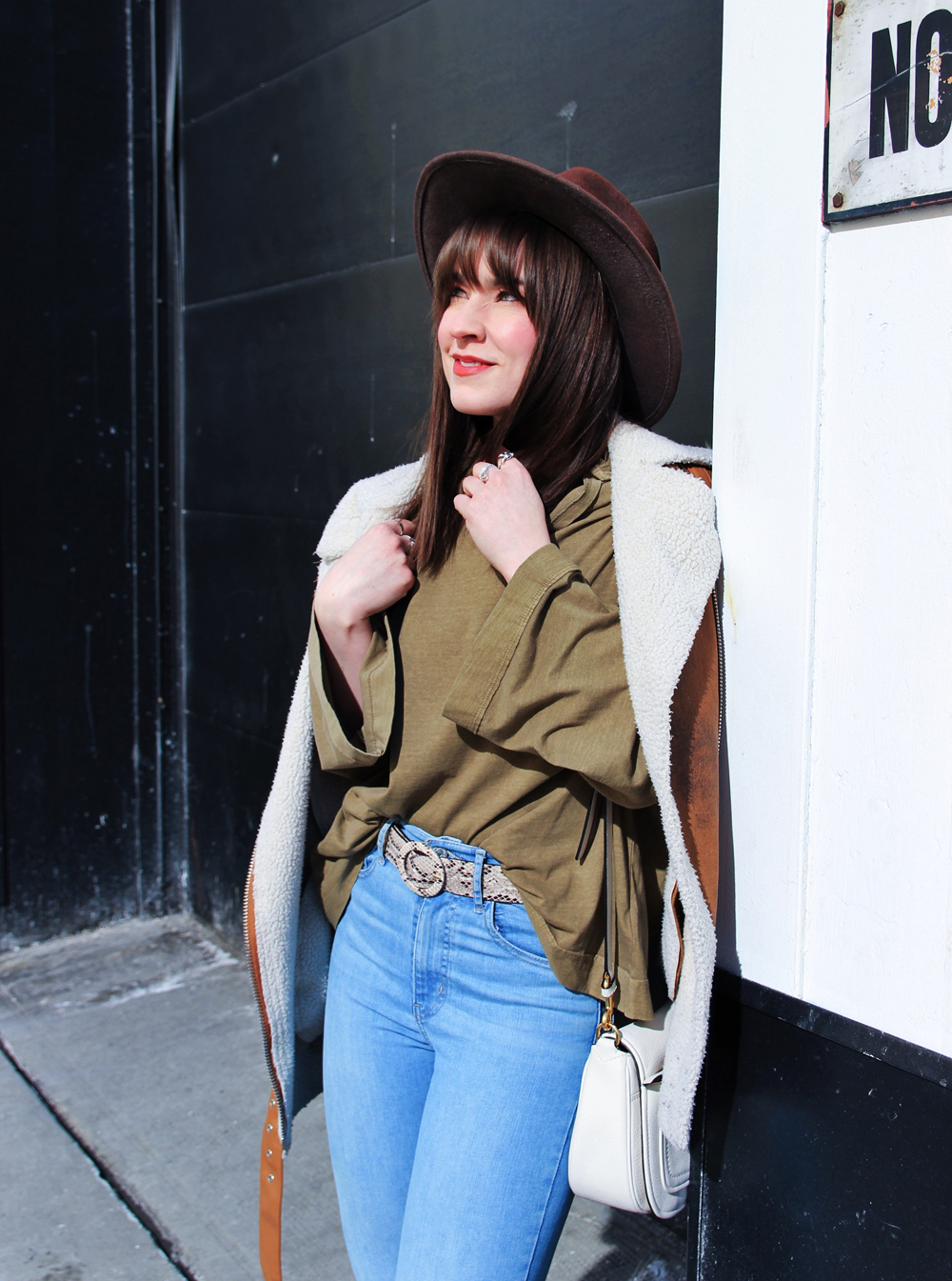 Outfit Details: Coat: Urban Outfitters / Jeans: Levi”s / Top: Free People / Belt: H&M / Hat: Dorfman / Boots: C/O Thursdays / Bag: Marc Jacobs