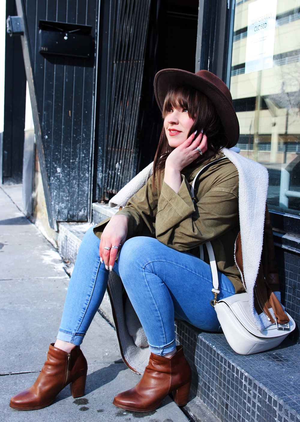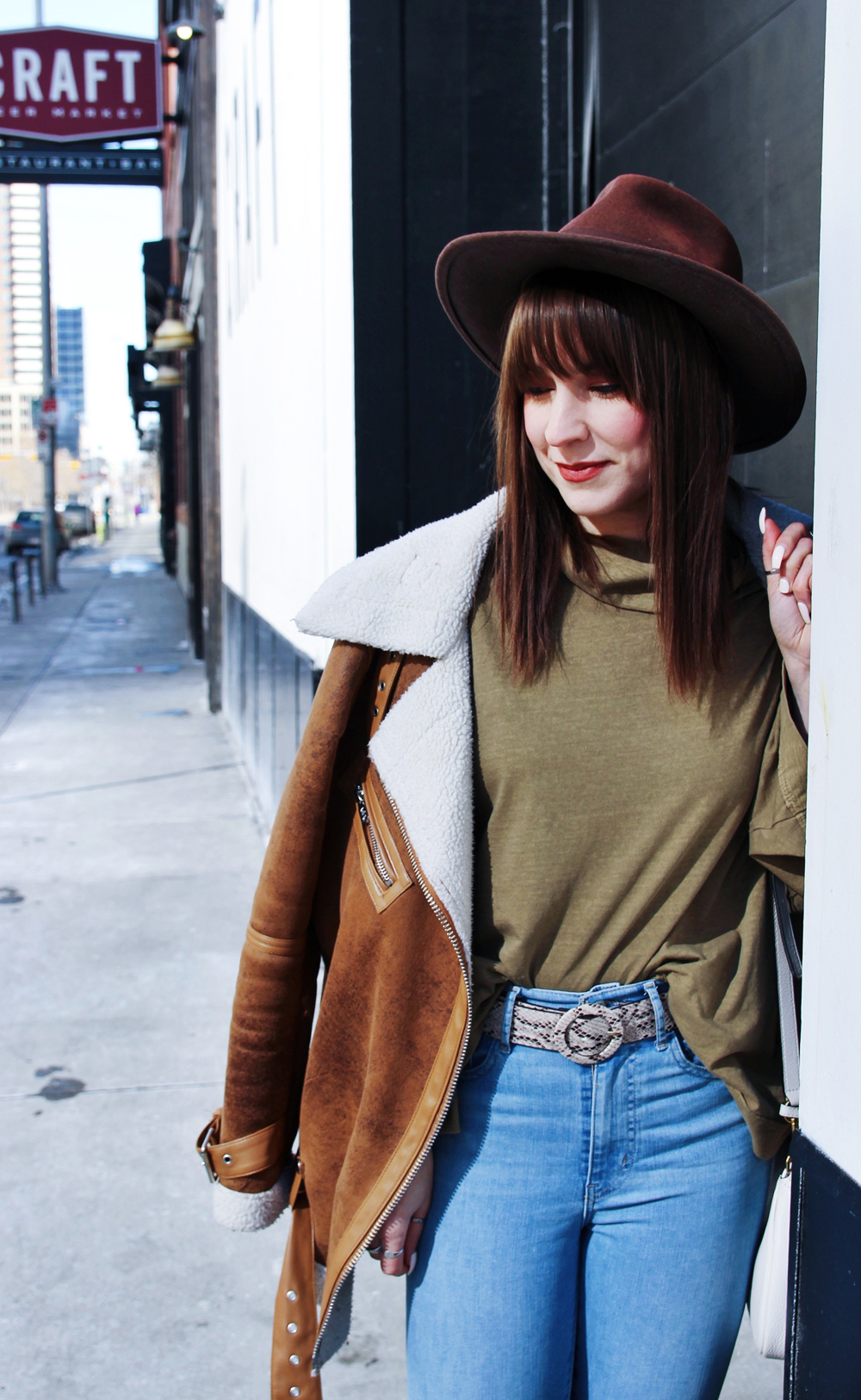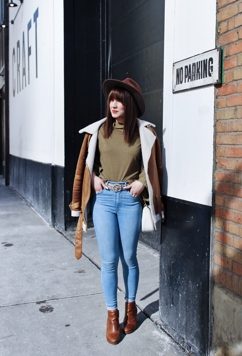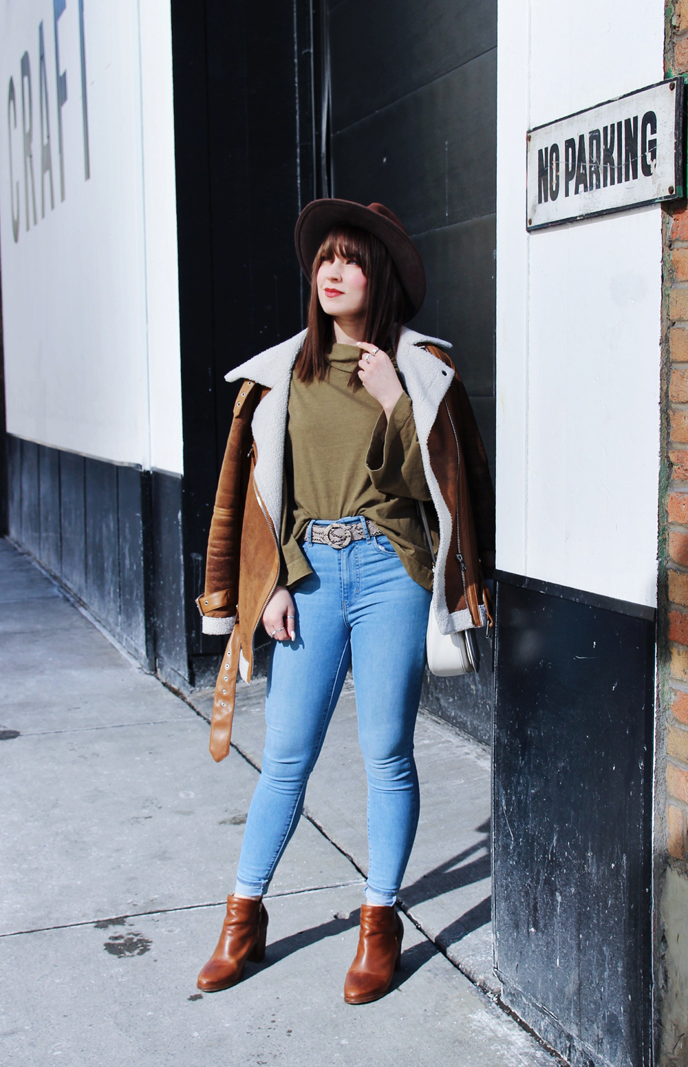 Outfit Details: Coat: Urban Outfitters / Jeans: Levi”s / Top: Free People / Belt: H&M / Hat: Dorfman / Boots: C/O Thursdays / Bag: Marc Jacobs
