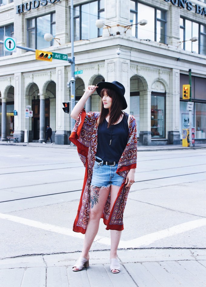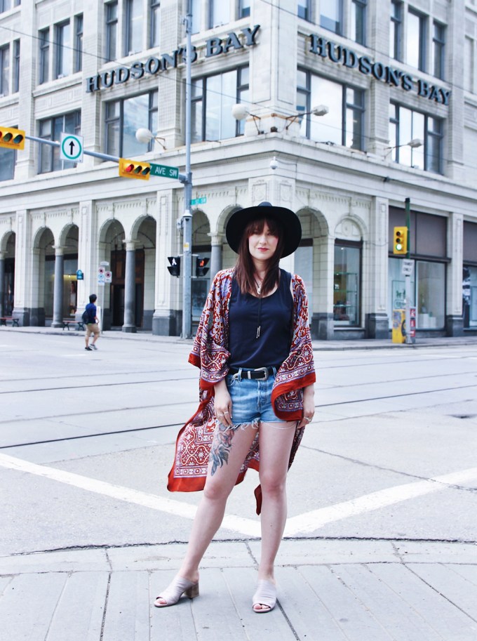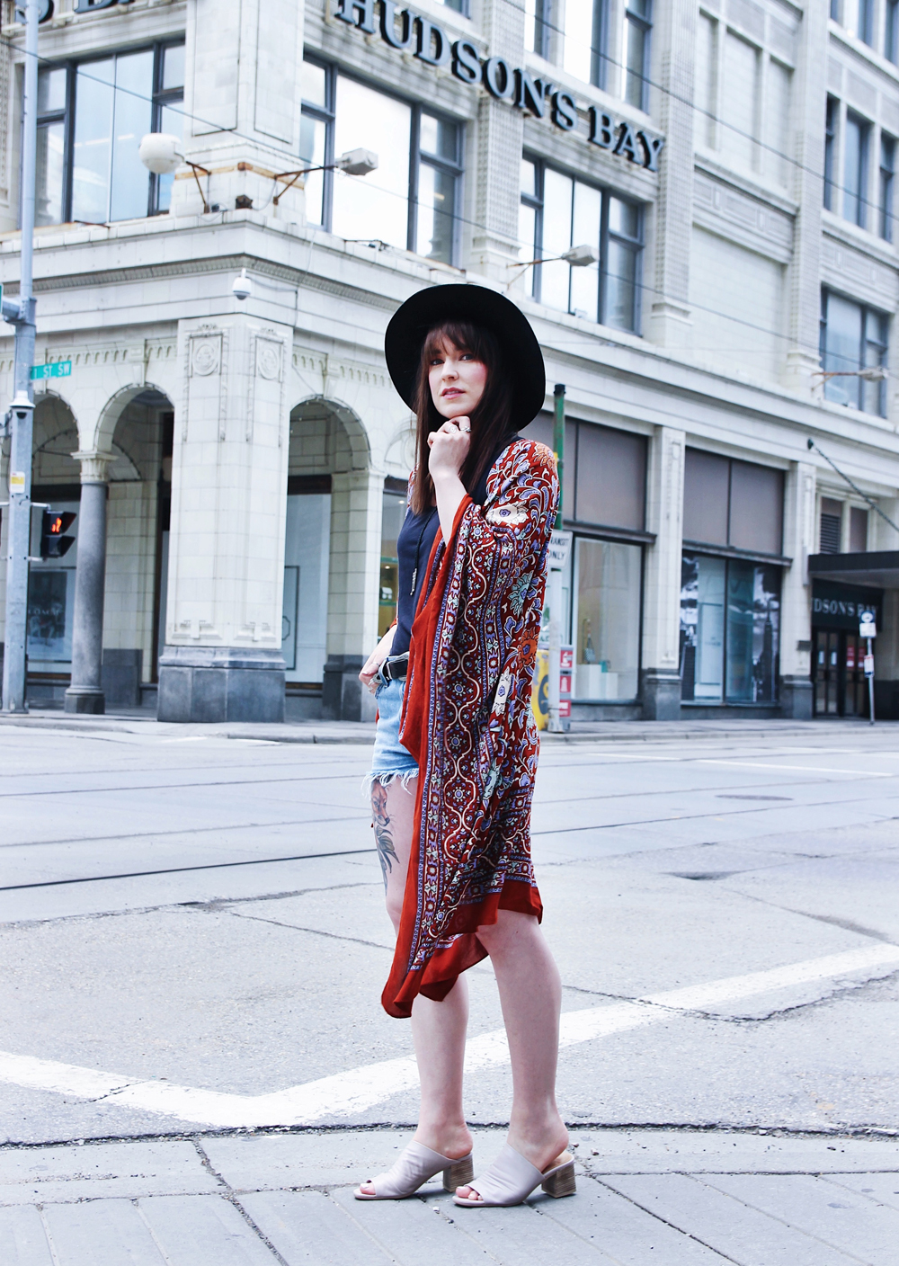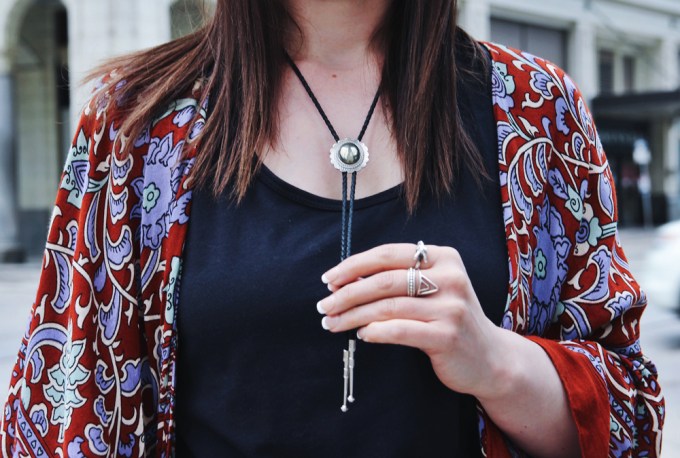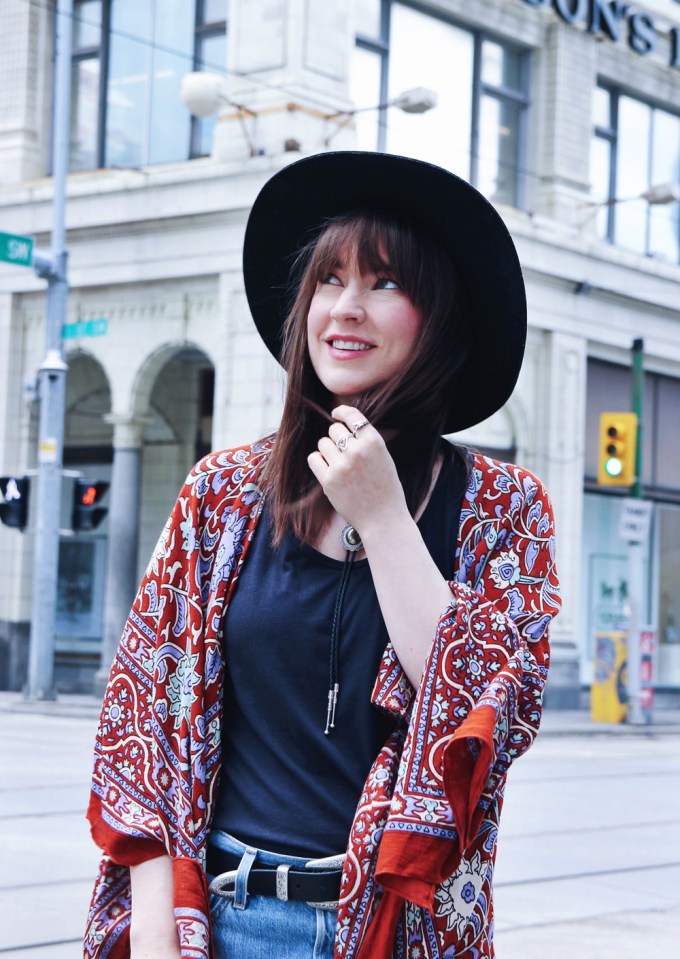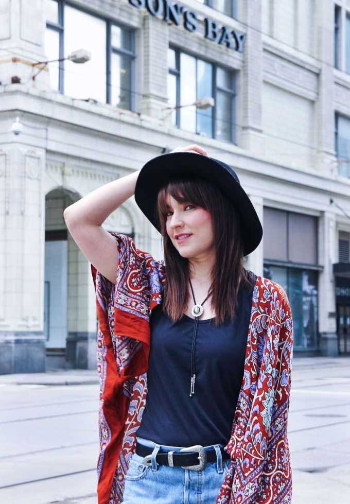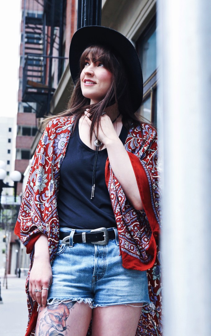 Outfit Details: Kimono: Free People / Shorts: Levi’s / Hat: Lack of Colour / Shoes: C/O Bueno / Bolo Tie: Free People