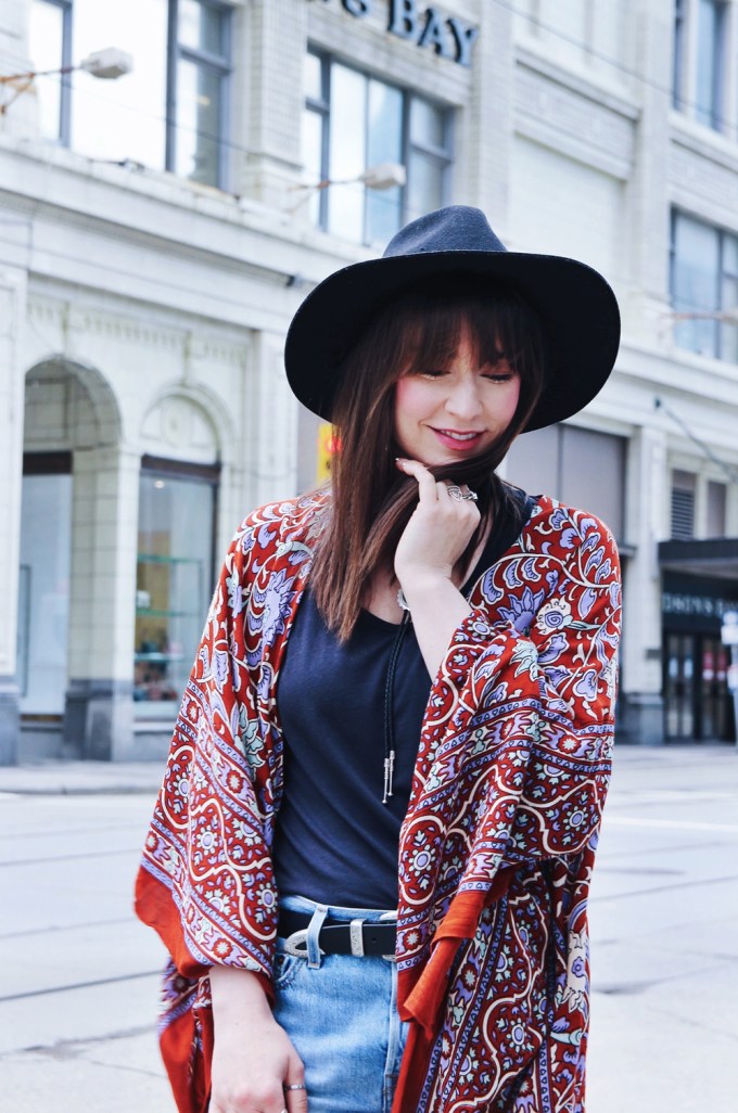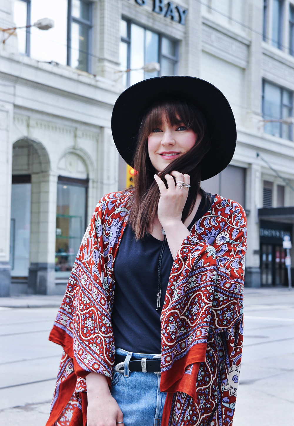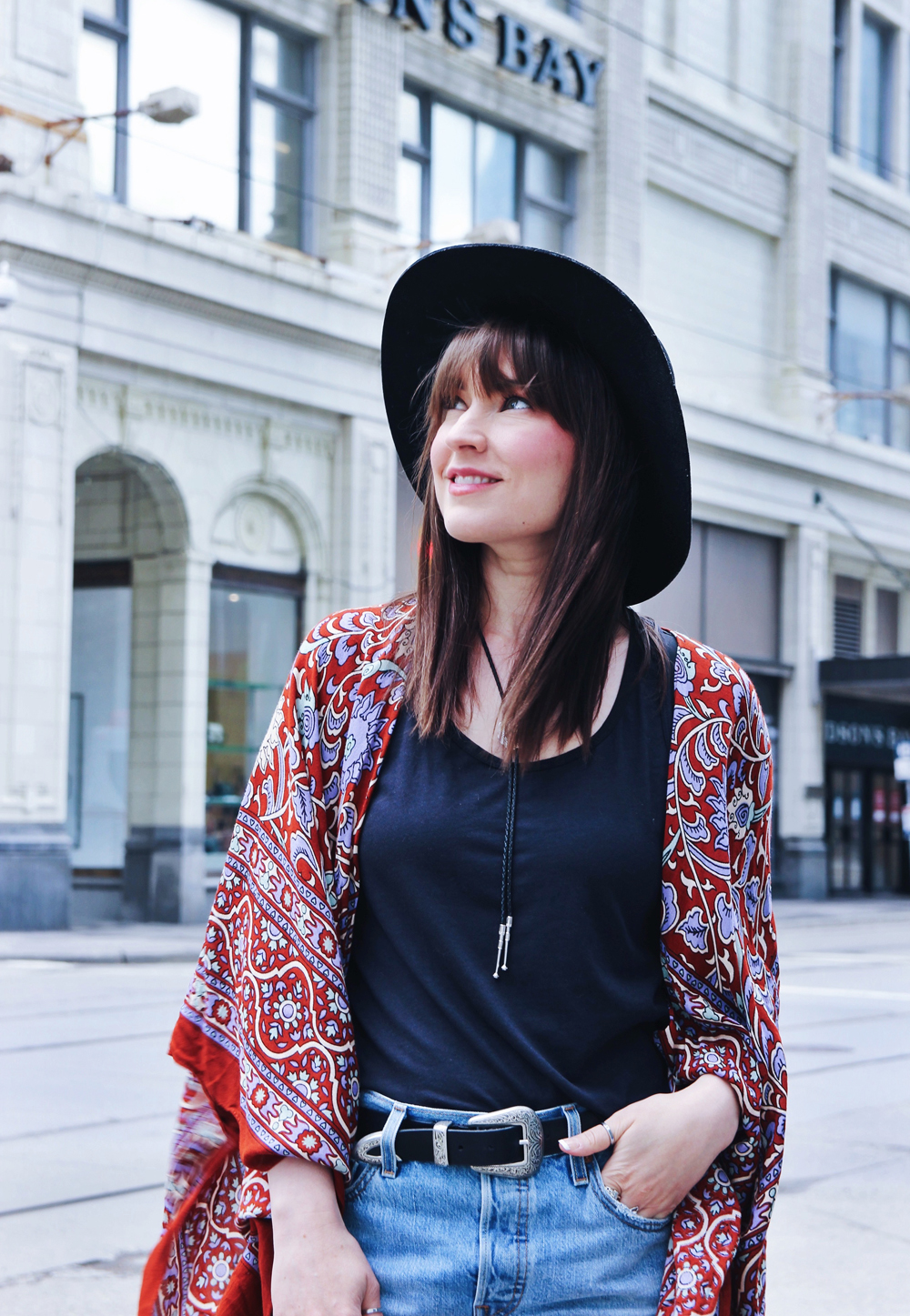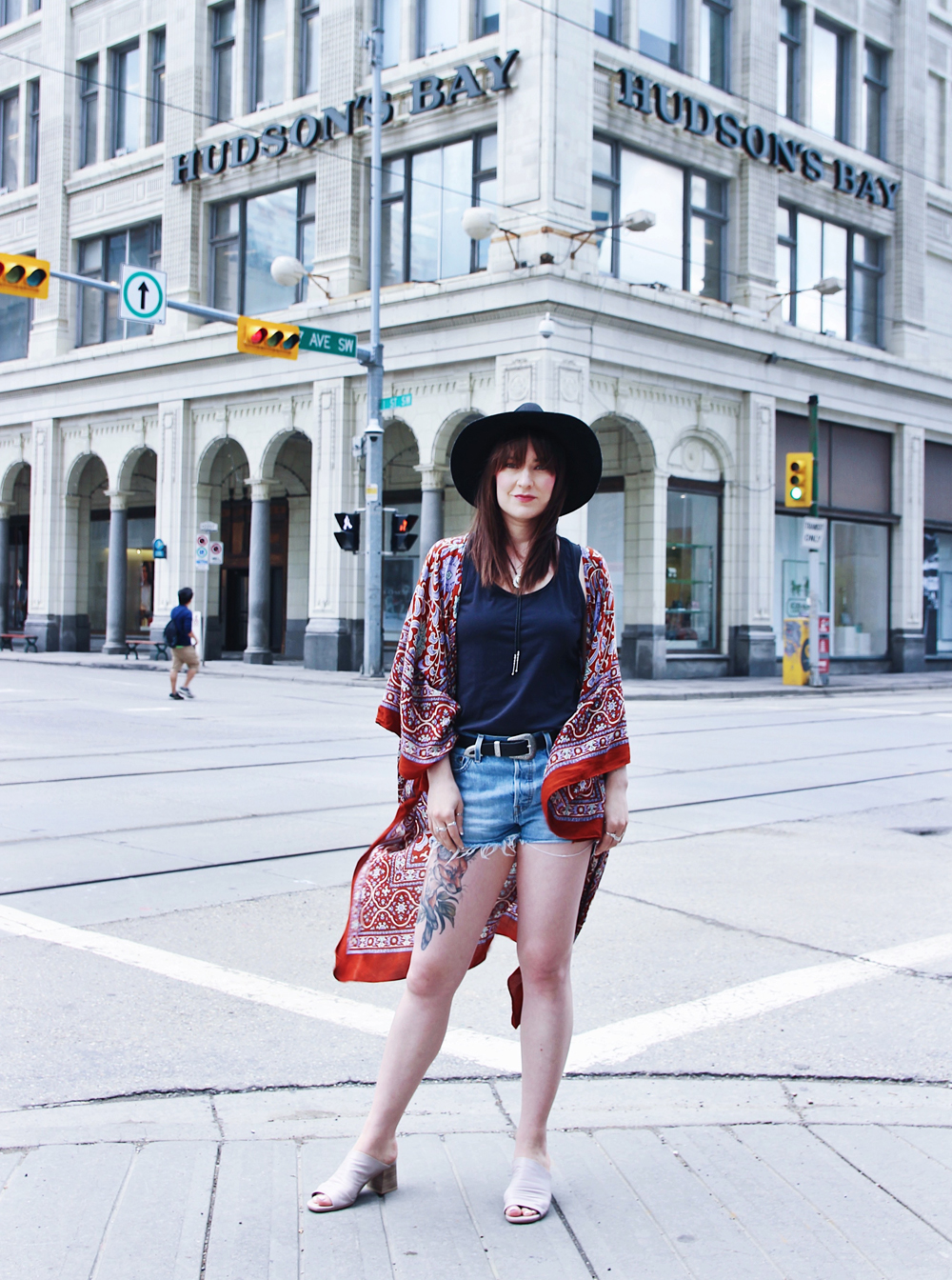 Outfit Details: Kimono: Free People / Shorts: Levi’s / Hat: Lack of Colour / Shoes: C/O Bueno / Bolo Tie: Free People