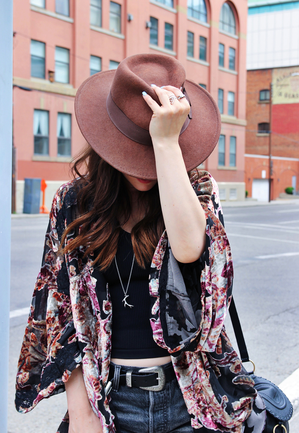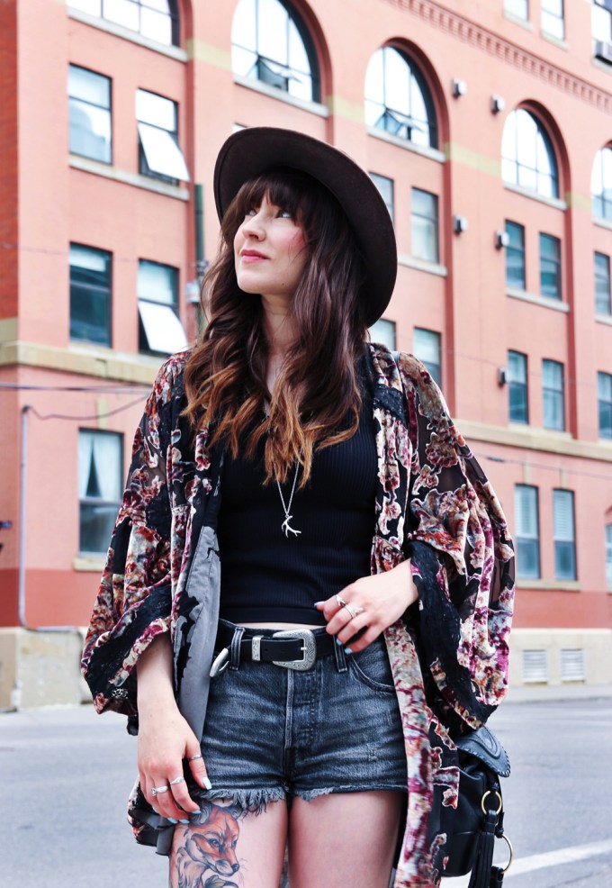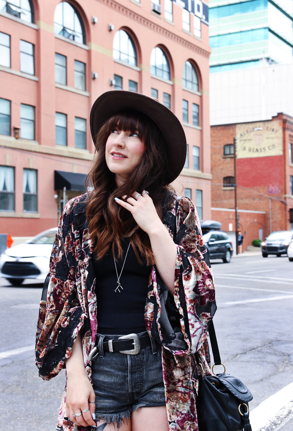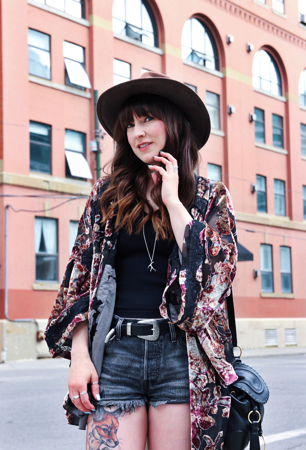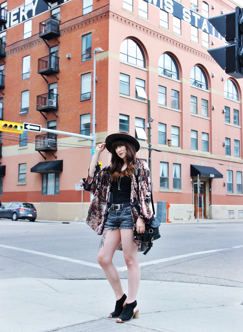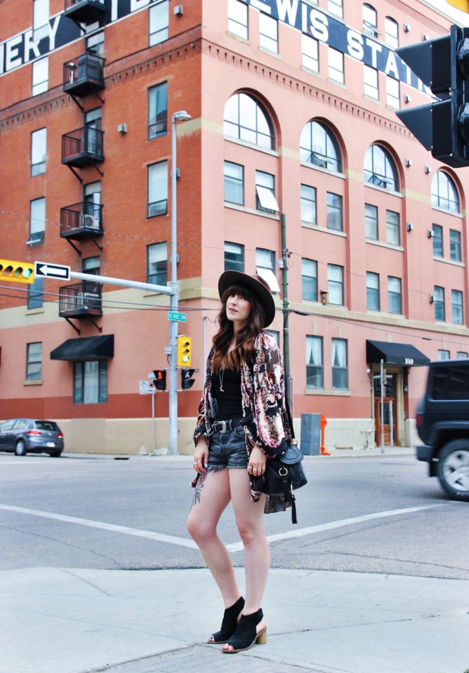 Outfit Details: Kimono: Free People / Shorts: Levis / Sandals: Clarks / Bag: See By Chloe / Necklace: C/O Moon Raven Designs