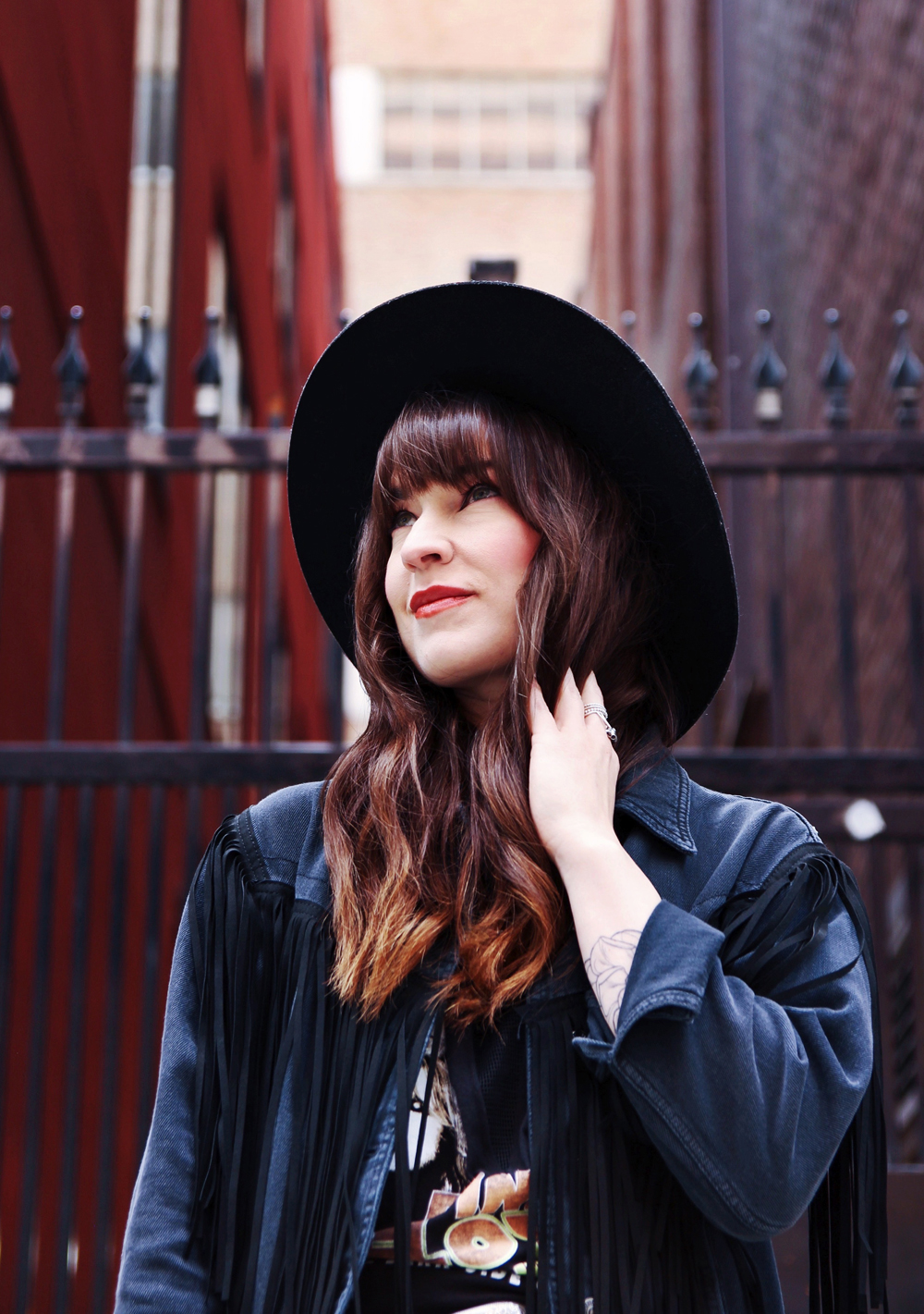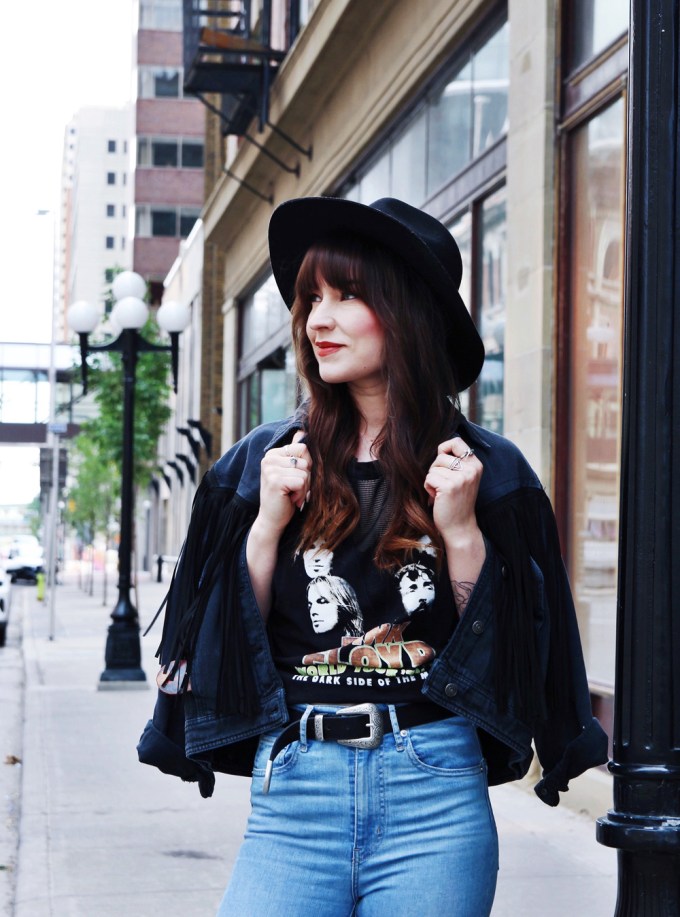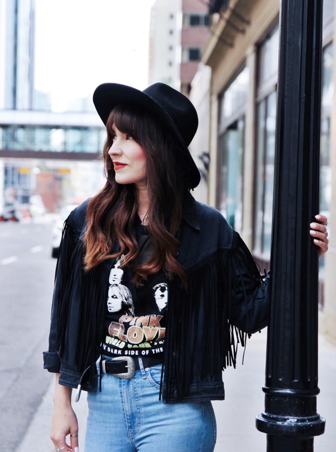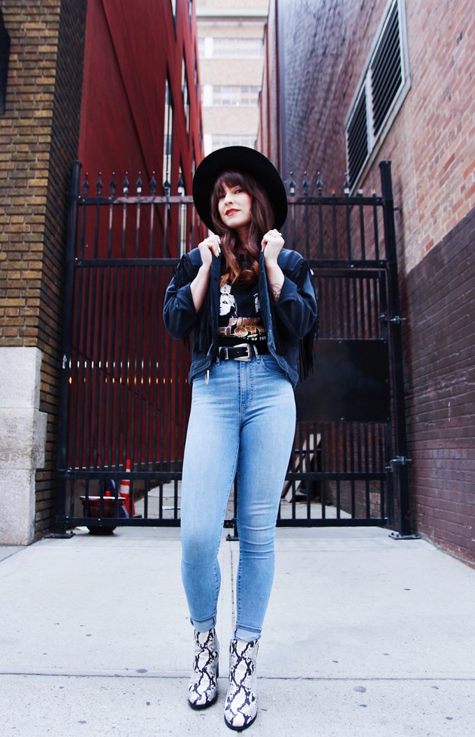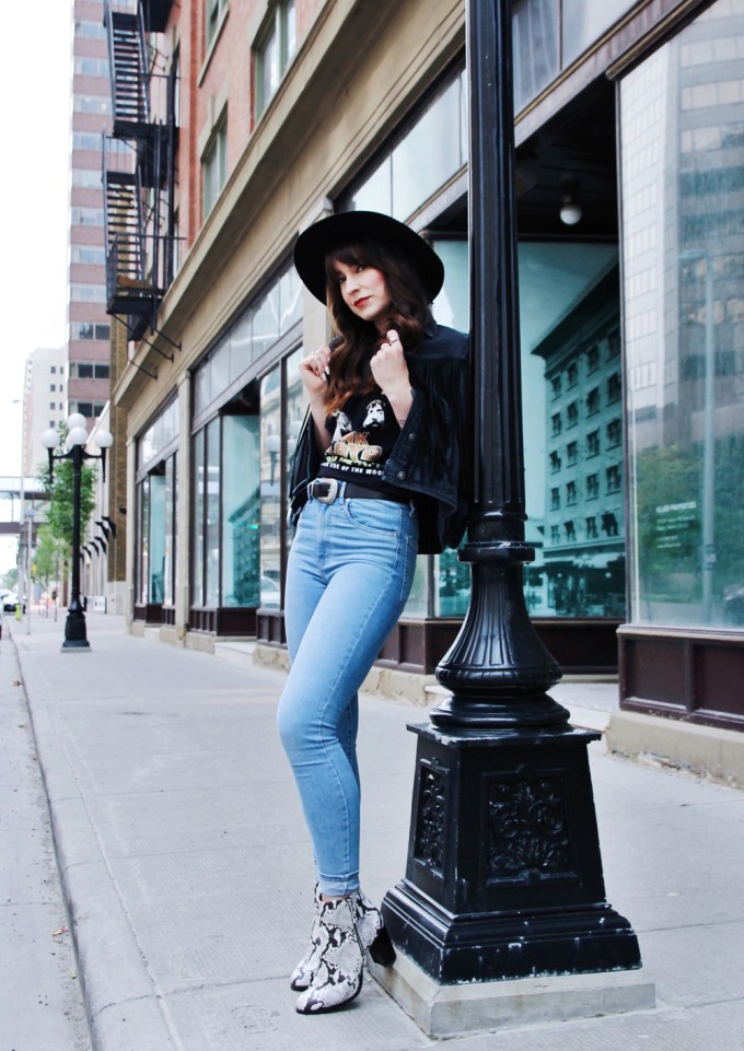 I’ve been on the hunt for the perfect fringe jacket for a while now, so finding this one from Free People felt like it was meant to be! I don’t know if you can tell but i’m a little obsessed with fringe. I love it on everything from bags, to booties, and now I finally have it on a jacket. As for the rest of the look, I chose a pair of light blue skinny jeans, because I felt like they would provide a nice contrast with the darker denim of the jacket. I also added my favourite snake print booties to add some extra detail to the look.