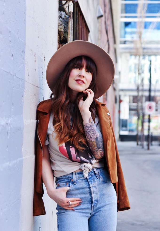 Now that it’s basically spring here in Calgary, i’m trying to incorporate a little more colour into my outfits. This’s a casual look for in between weather, and honestly you just can’t go wrong with a pair of jeans and a band tee. I found this faux suede Moto jacket in the back of my closet, and thought that it was the perfect addition to this look. To accessorize I added my favourite wide brim hat!